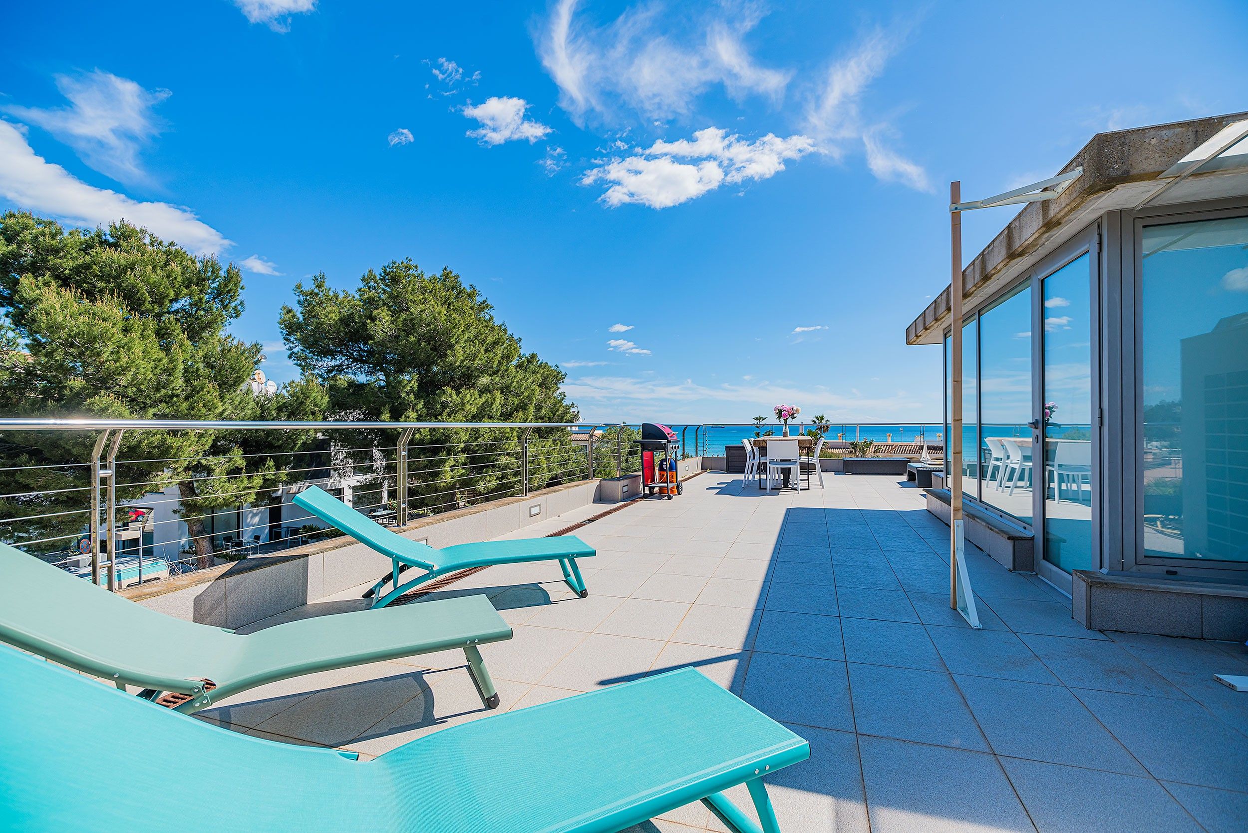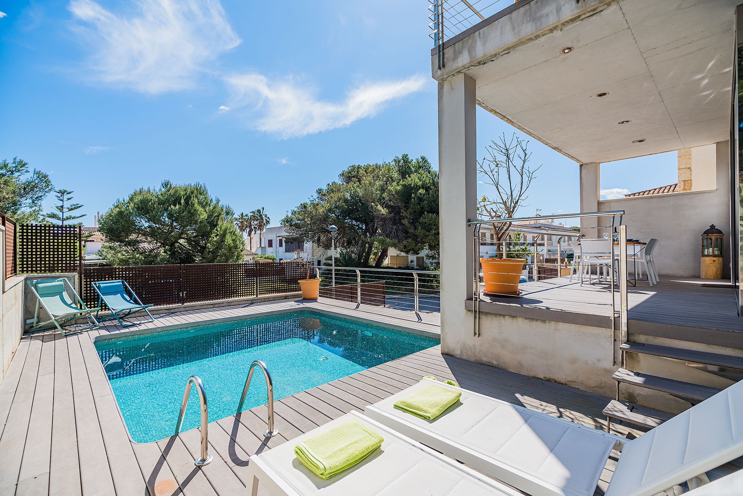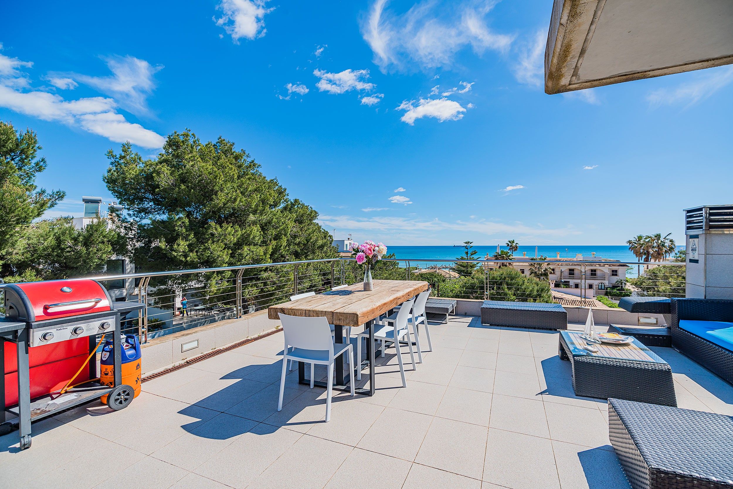 NRA: ETV/134211. 5985 Aquesta moderna vila aparellada es troba a tan sols uns metres d'una de les millors platges de Mallorca, famosa per la seva sorra fina i aigües tranquil·les. La propietat gaudeix de vistes agradables i està envoltada de comoditats com restaurants, bars, un centre mèdic i una parada de bus, tot a poca distància. La vila compta amb una piscina privada que pot ser tancada per garantir la seguretat dels nens petits, així com una zona enjardinada en la part posterior on els més petits poden jugar. Quant a les seves instal·lacions, la vila ofereix un mobiliari modern i d'alta qualitat. A la planta principal, es troba un ampli saló-menjador amb grans finestrals que ofereixen accés directe a la terrassa, que inclou un menjador d'estiu i vistes a la piscina. La cuina, d'estil contemporani, està totalment equipada amb una illa central i una taula addicional, la qual cosa la converteix en un espai funcional i acollidor. A més, en aquesta planta es troba una cambra de bany amb dutxa. A la planta superior es troben els dormitoris, tots amb aire condicionat. El primer dormitori compta amb un llit doble, mentre que el segon té dos llits individuals. Ambdós comparteixen un bany amb banyera i dutxa. L'impressionant dormitori principal és un espai de luxe amb llit doble, bany en suite de concepte obert amb una espectacular banyera rodona de massatges, dutxa i WC. Aquest dormitori també gaudeix d'una terrassa privada amb vistes al mar. La vila també compta amb una esplèndida terrassa en el terrat, equipada amb sofàs, tonones, una taula de menjador i una barbacoa de gas. Des d'aquesta terrassa, es poden gaudir de vistes panoràmiques impressionants, la qual cosa converteix aquest espai en el lloc ideal per relaxar-se i gaudir de l'entorn. Amb totes aquestes característiques, aquesta vila ofereix un refugi exclusiu i confortable, ideal per als qui busquen gaudir de la tranquil·litat i bellesa de Mallorca prop del mar.Comoditats