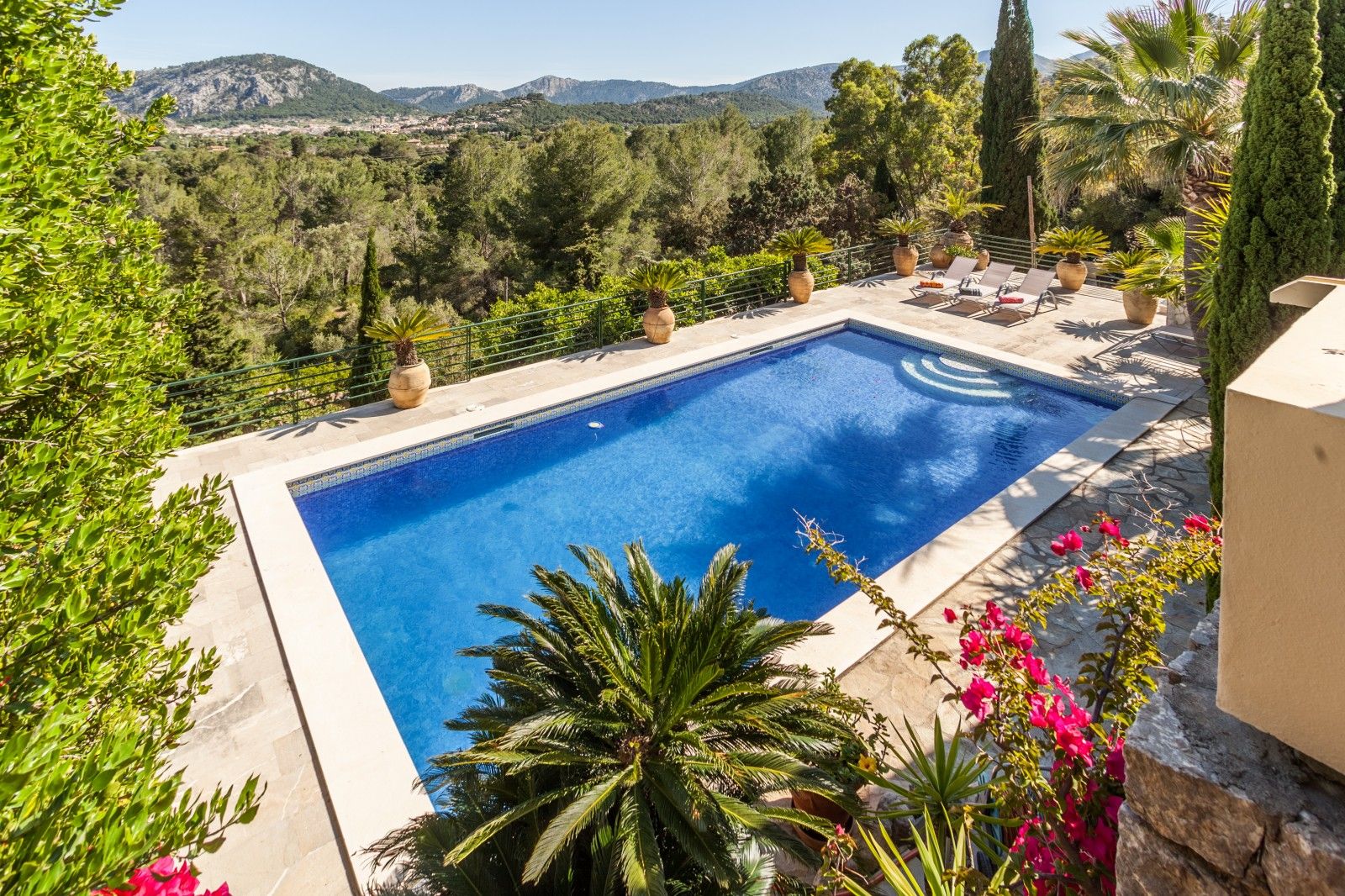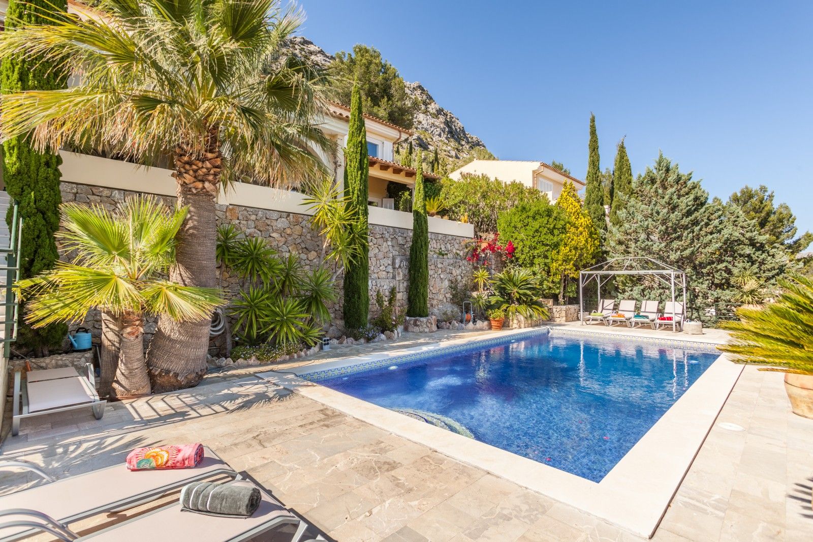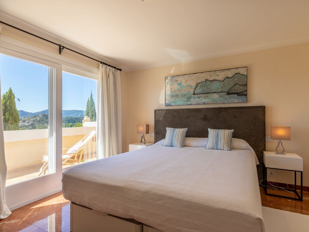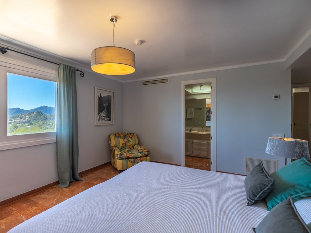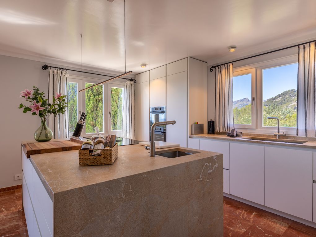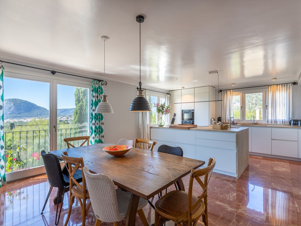 NRA: ETV/94377. Preus i disponibilitat: https://www.evholidayvillas.com Ref. 6164 Lujosa vila a la zona residencial de la Font, als afores de Pollensa. Aquesta impressionant propietat es distingeix per la seva amplitud, elegància i la qualitat dels seus acabats. El seu jardí, un autèntic oasi mediterrani, es desplega en diversos nivells, decorat amb pedres naturals, plantes autòctones i majestuoses palmeres, creant un entorn únic. La zona de la piscina, envoltada per còmodes tumbenes, ofereix vistes espectaculars que conviden a relaxar-se, mentre que des de les terrasses i els dormitoris es poden gaudir de panoràmiques que abasten des de les muntanyes fins al mar, creant una atmosfera captivadora. La vila rep als seus visitants amb un lluminós i ampli saló, moblat amb gust i confort. En aquest espai es troben elegants sofàs, una xemeneia, una gran televisió, així com bells quadres i detalls artístics que aporten un toc sofisticat. El saló dóna accés a una encantadora terrassa amb arcs, perfecta per gaudir de sopars a l'aire lliure o relaxar-se amb vistes a la piscina i les muntanyes circumdants. La cuina, de disseny modern, funcional i elegant, està equipada amb tot el necessari per als amants de la gastronomia, incloent una zona de menjador ideal per compartir moments especials. En aquesta planta també es troba un bany familiar. A la planta superior es troben els quatre amplis dormitoris en suite, tots amb una decoració refinada i materials d'alta qualitat. Cada habitació està equipada amb aire condicionat fred/calor i calefacció central, la qual cosa garanteix una temperatura perfecta durant tot l'any. La ubicació de la vila, a tan sols 2 km del pintoresc poble de Pollensa, permet gaudir d'agradables passejos a peu, i per als aficionats a l'esport, la propietat es troba a només 6 km del mar, ideal per als qui gaudeixen del ciclisme i l'aire lliure.Comoditats