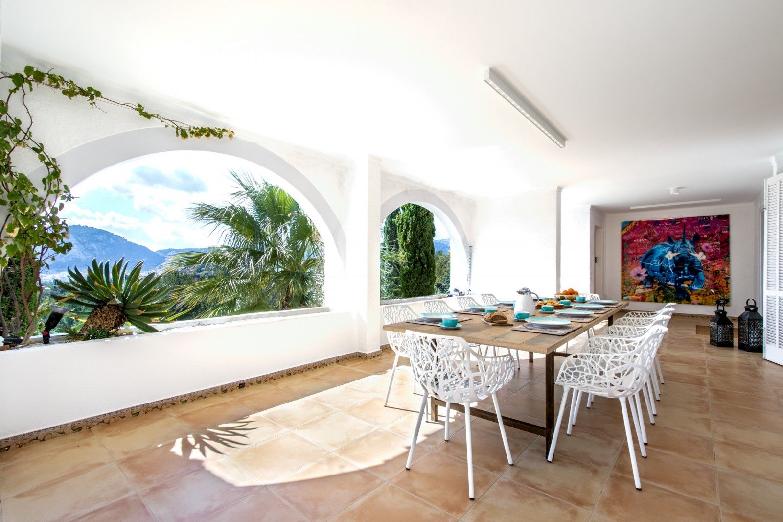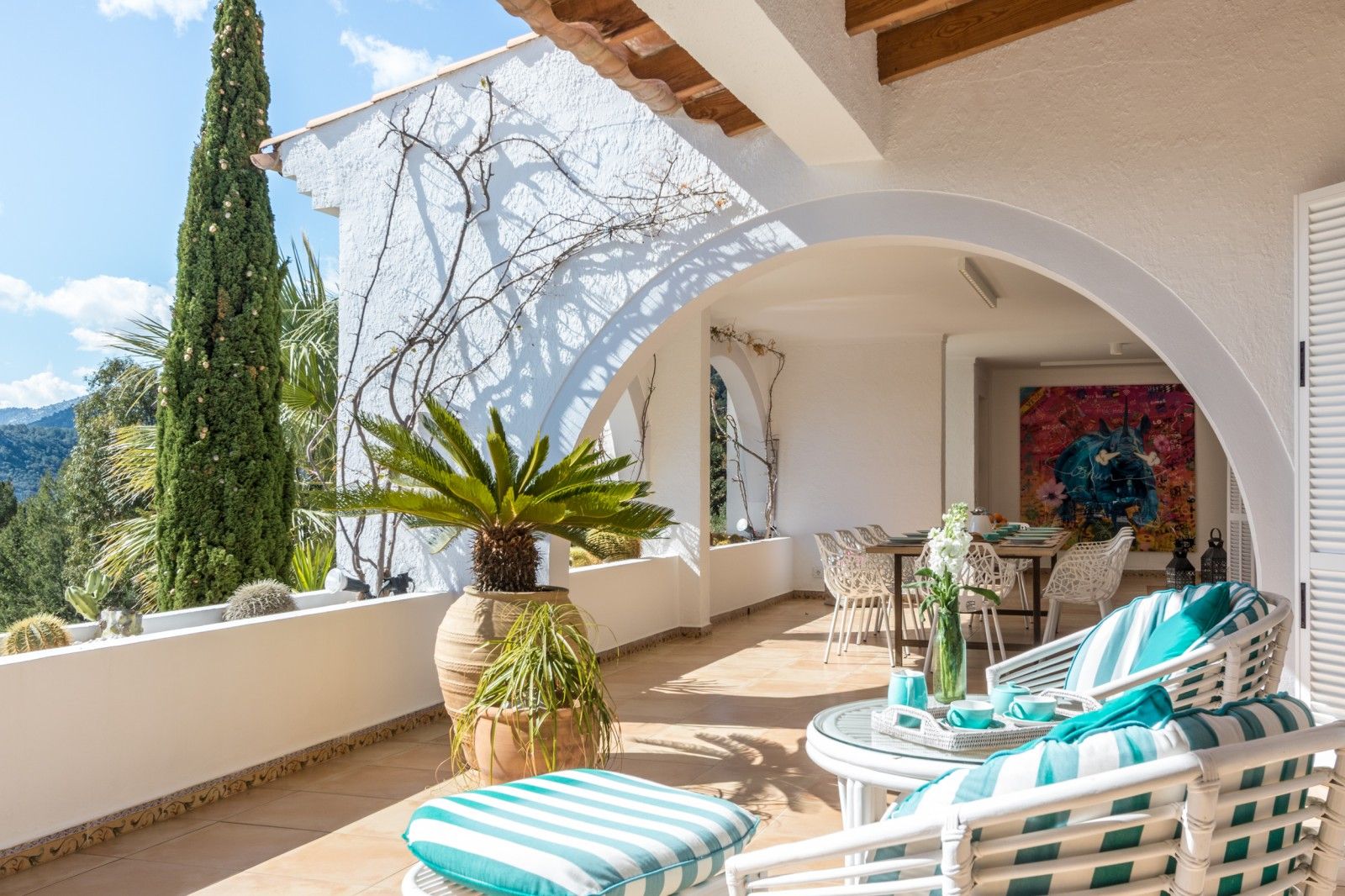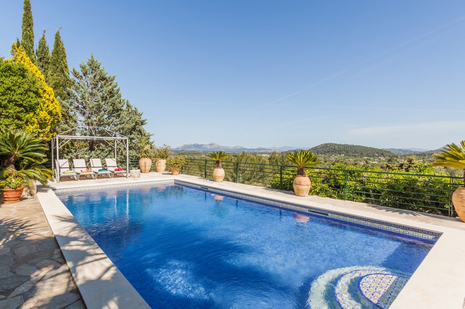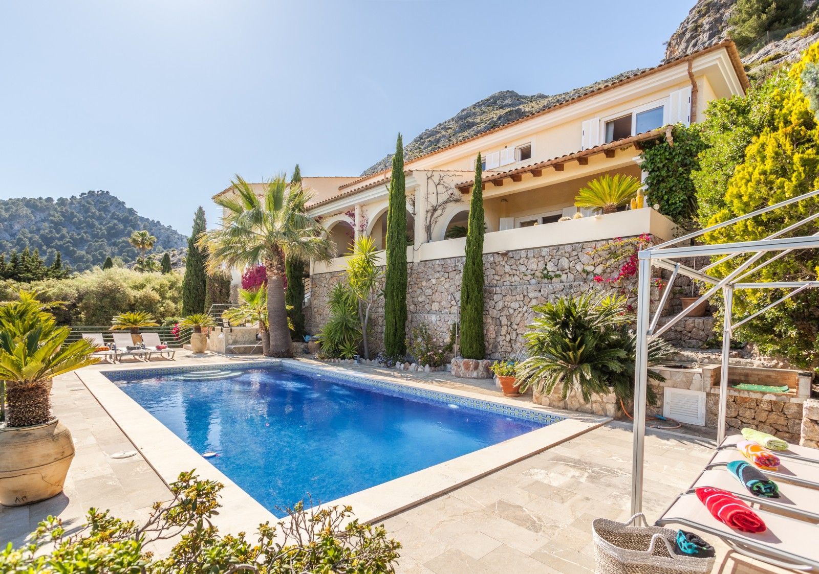 NRA: ETV/94377. Preus i disponibilitat: https://www.evholidayvillas.com Ref. 6164 Lujosa vila a la zona residencial de la Font, als afores de Pollensa. Aquesta impressionant propietat es distingeix per la seva amplitud, elegància i la qualitat dels seus acabats. El seu jardí, un autèntic oasi mediterrani, es desplega en diversos nivells, decorat amb pedres naturals, plantes autòctones i majestuoses palmeres, creant un entorn únic. La zona de la piscina, envoltada per còmodes tumbenes, ofereix vistes espectaculars que conviden a relaxar-se, mentre que des de les terrasses i els dormitoris es poden gaudir de panoràmiques que abasten des de les muntanyes fins al mar, creant una atmosfera captivadora. La vila rep als seus visitants amb un lluminós i ampli saló, moblat amb gust i confort. En aquest espai es troben elegants sofàs, una xemeneia, una gran televisió, així com bells quadres i detalls artístics que aporten un toc sofisticat. El saló dóna accés a una encantadora terrassa amb arcs, perfecta per gaudir de sopars a l'aire lliure o relaxar-se amb vistes a la piscina i les muntanyes circumdants. La cuina, de disseny modern, funcional i elegant, està equipada amb tot el necessari per als amants de la gastronomia, incloent una zona de menjador ideal per compartir moments especials. En aquesta planta també es troba un bany familiar. A la planta superior es troben els quatre amplis dormitoris en suite, tots amb una decoració refinada i materials d'alta qualitat. Cada habitació està equipada amb aire condicionat fred/calor i calefacció central, la qual cosa garanteix una temperatura perfecta durant tot l'any. La ubicació de la vila, a tan sols 2 km del pintoresc poble de Pollensa, permet gaudir d'agradables passejos a peu, i per als aficionats a l'esport, la propietat es troba a només 6 km del mar, ideal per als qui gaudeixen del ciclisme i l'aire lliure.Comoditats