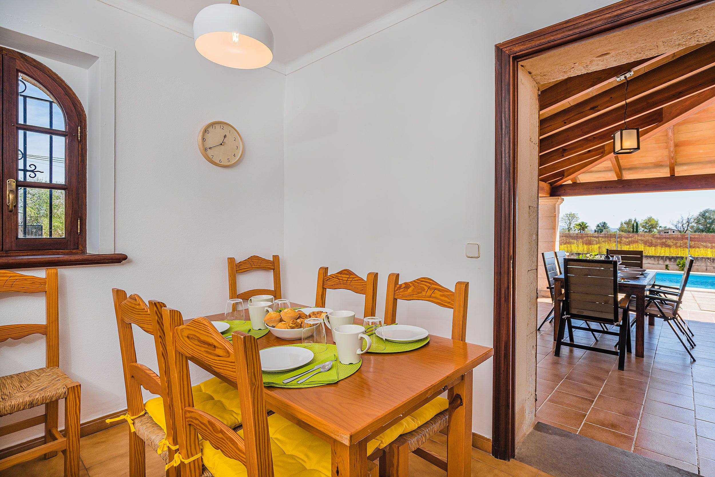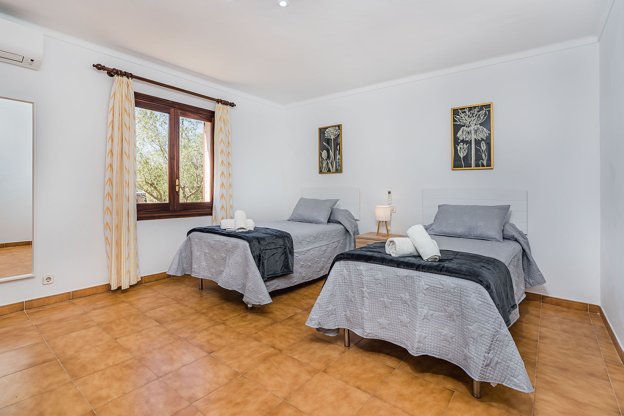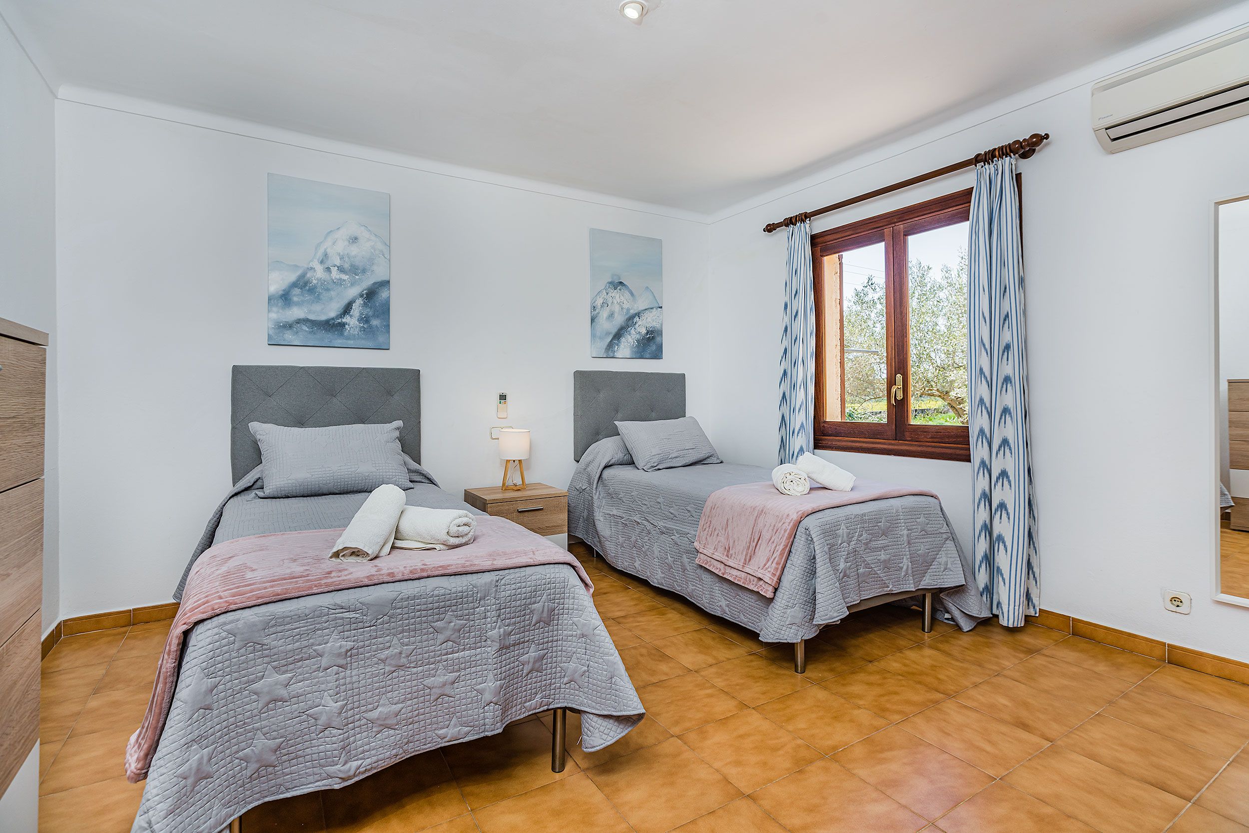 NRA: ETV/13543. 5711 Aquesta tradicional vila campestre es troba en una tranquil·la zona rural, perfectament situada entre Pollensa i Port Pollensa, la qual cosa la converteix en un refugi ideal a tan sols uns minuts en cotxe de les belles platges i del centre de Pollensa, o fins i tot a un passeig amb bicicleta. La seva ubicació permet gaudir de la serenitat del camp sense renunciar a la proximitat de tots els serveis i atractius de la zona. La vila compta amb una encantadora piscina de mosaic, amb elegants graons romans, envoltada per una espaiosa terrassa equipada amb tonnes per gaudir del sol i les vistes. La casa, construïda en una sola planta, presenta la típica façana de pedra mallorquina, amb un porxo frontal adornat amb bigues de fusta vista que aporten un toc rústic i acollidor. L'interior reflecteix un estil mediterrani tradicional, amb una decoració càlida i senzilla, destacant els robustos mobles que brinden un ambient còmode i pràctic. El saló-menjador és ampli i lluminós, amb televisió i DVD per a moments de relaxació. La cuina està completament equipada, compta amb una barra americana i una taula d'esmorzar, la qual cosa la fa ideal per compartir menjars en família. La vila disposa de tres còmodes dormitoris dobles, tots ells amb aire condicionat. Un dels dormitoris compta amb un llit doble, mentre que els altres dos estan equipats amb dos llits individuals cadascun. A més, compta amb dues cambres de bany interiors i una dutxa exterior al costat de la piscina, la qual cosa afegeix comoditat i practicitat per gaudir dels dies assolellats. Per descomptat, no falta el típic menjador d'estiu amb barbacoa, un lloc perfecte per a gaudir d'agradables sopars a l'aire lliure mentre es contempla el paisatge que envolta la propietat. Tot el necessari per a unes vacances relaxades en el camp, envoltat de naturalesa, privacitat i tranquil·litat.Comoditats