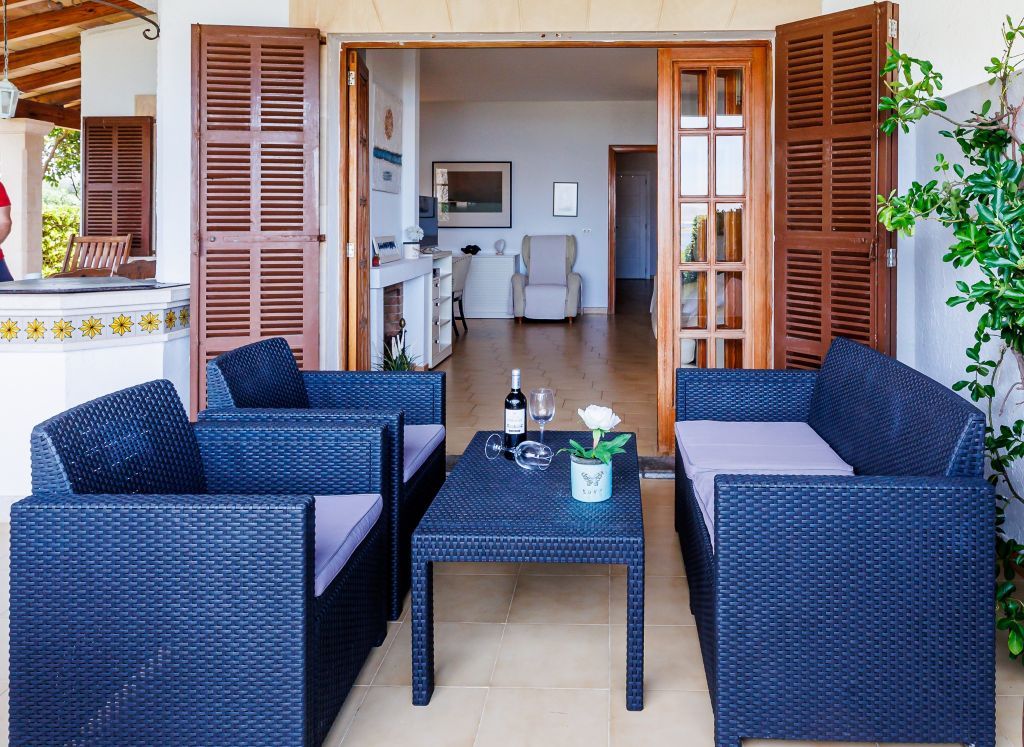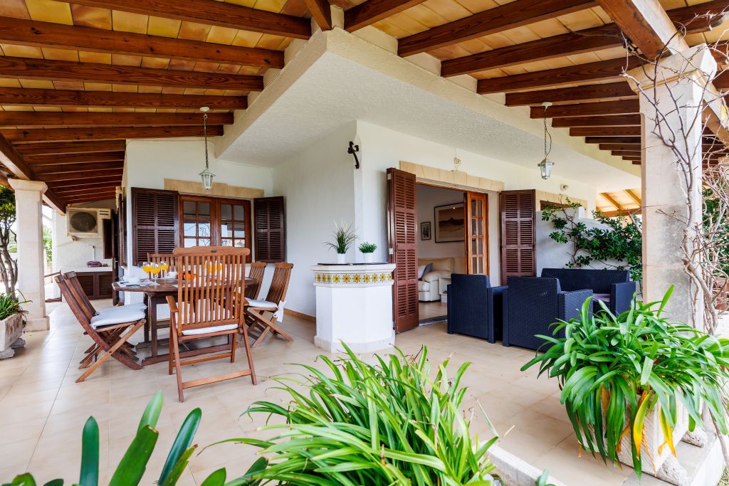El porxo es divideix en un agradable menjador d'estiu i una zona de relax orientada al mar. Des d'aquí, un accés directe porta al jardí privat, ideal per prendre el sol o gaudir d'activitats a l'aire lliure. Només uns metres d'un carrer per als vianants separen l'habitatge de les serenes aigües de la badia.