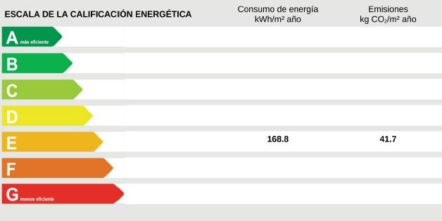 • Valor de consum energètic: 168.8 kWh/(m2*a) • Emissions CO2: 41.7 kg/m2 • Escala de Emissions de CO2: E • Classe d'eficiència energètica: E
