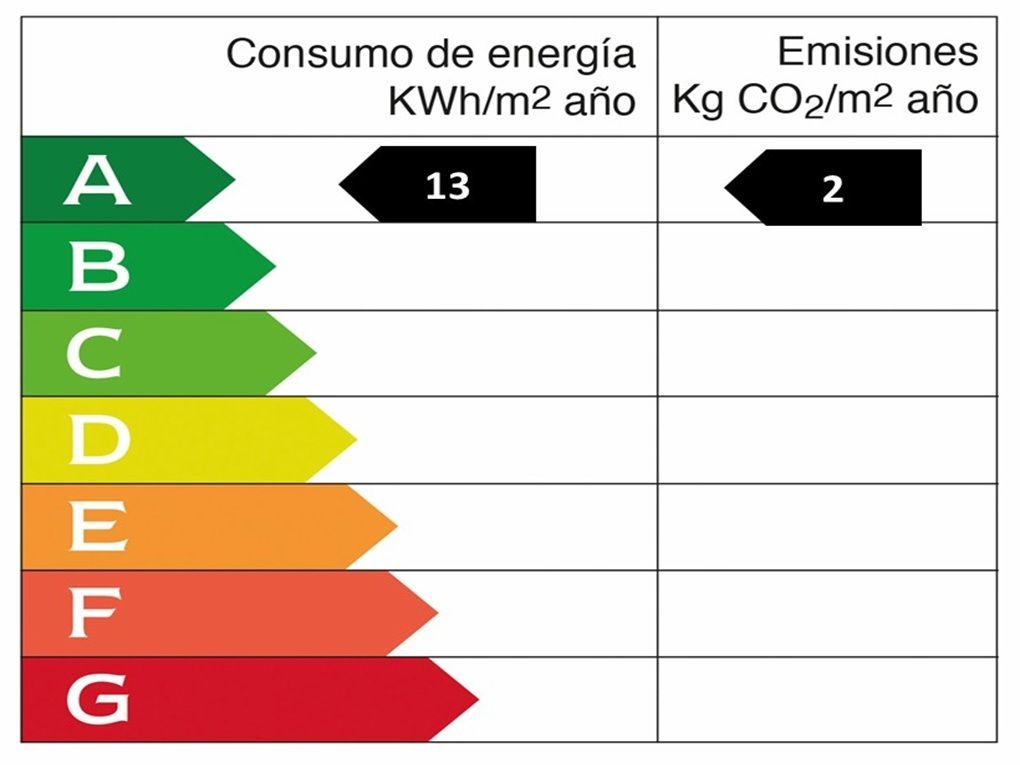 Any de construcció: 2020 • Valor de consum energètic: 13.06 kWh/(m2*a) • Emissions CO2: 1.89 kg/m2 • Escala de Emissions de CO2: A • Tipus de calefacció: Bomba de calor • Classe d'eficiència energètica: A