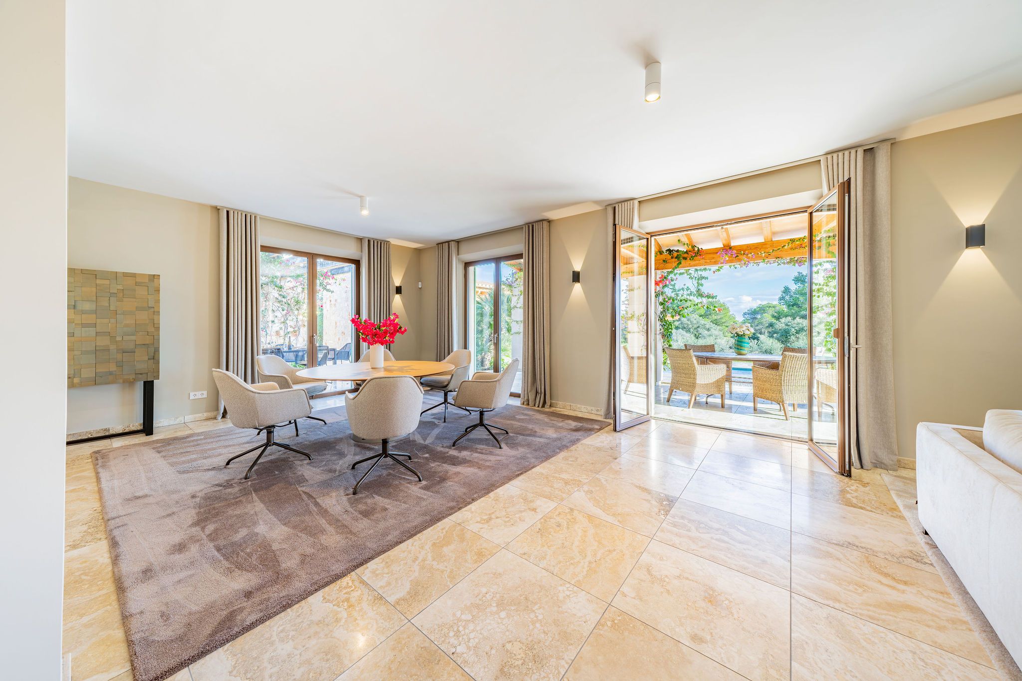 Porto Petro is an idyllic Majorcan fishing village with a small sports harbor and excellent exclusive restaurants located directly on the water. It is located about 1.5 km from the nearest town Cala d'Or with its luxurious marina and just a few minutes from the beautiful bay in the Natural Park Cala Mondragó away. Supermarkets, cafes, and other shopping opportunities are located right in the beautiful harbor. In the back, over the years grown part of Porto Petro has formed a wonderfully quiet residential area of high standard (Colonia del Silencio). In the beautiful natural harbor, which has preserved its original charm until today, are mainly smaller boats to find. Near the harbor there are two beautiful sandy beaches, easily accessible. The very popular village of Santanyi can be reached in about 15 minutes by car. The exclusive 18-hole golf course Vall d'Or is also about 15 minutes away, Palma and the international airport can be reached in about 50 minutes.