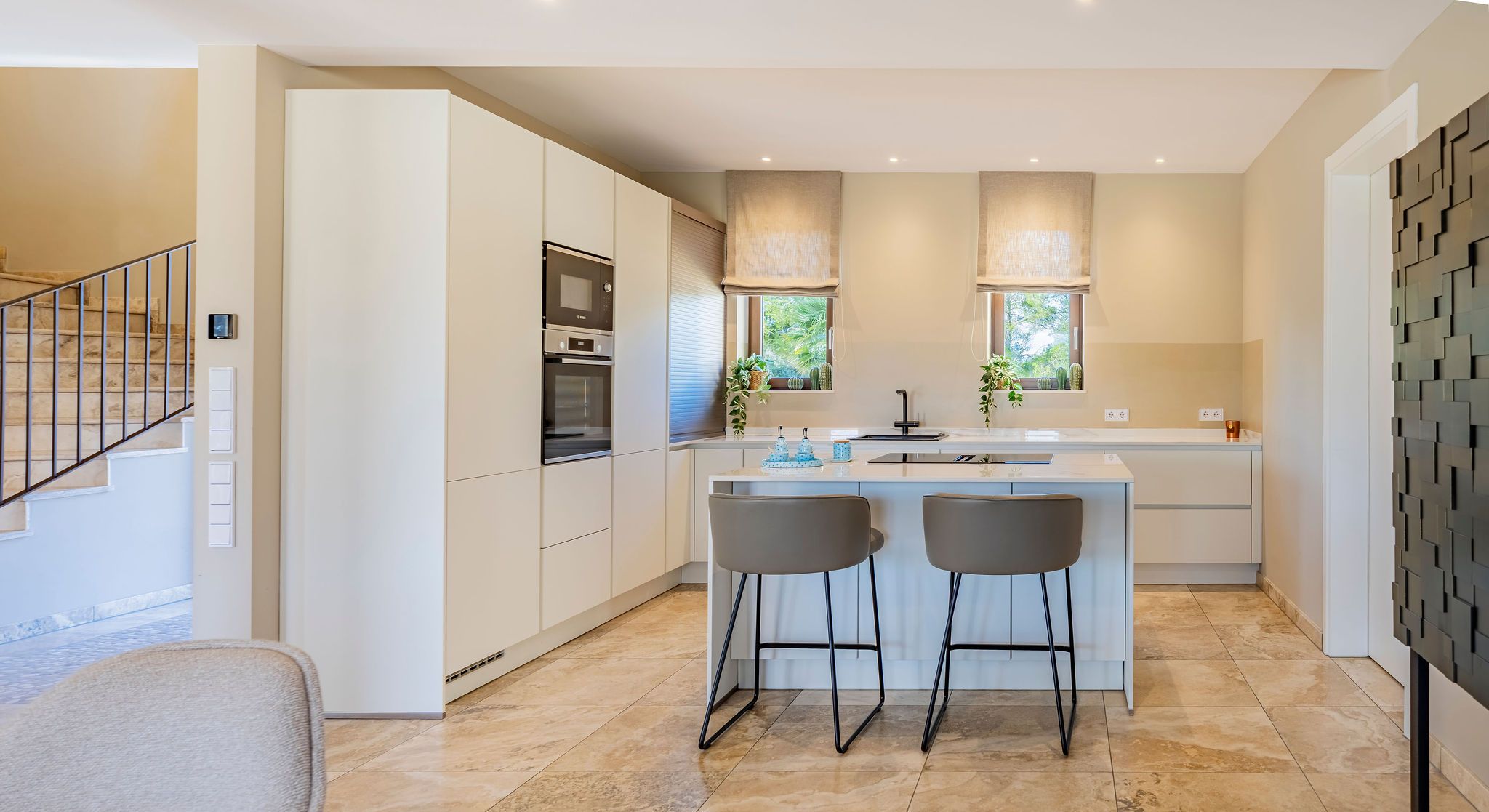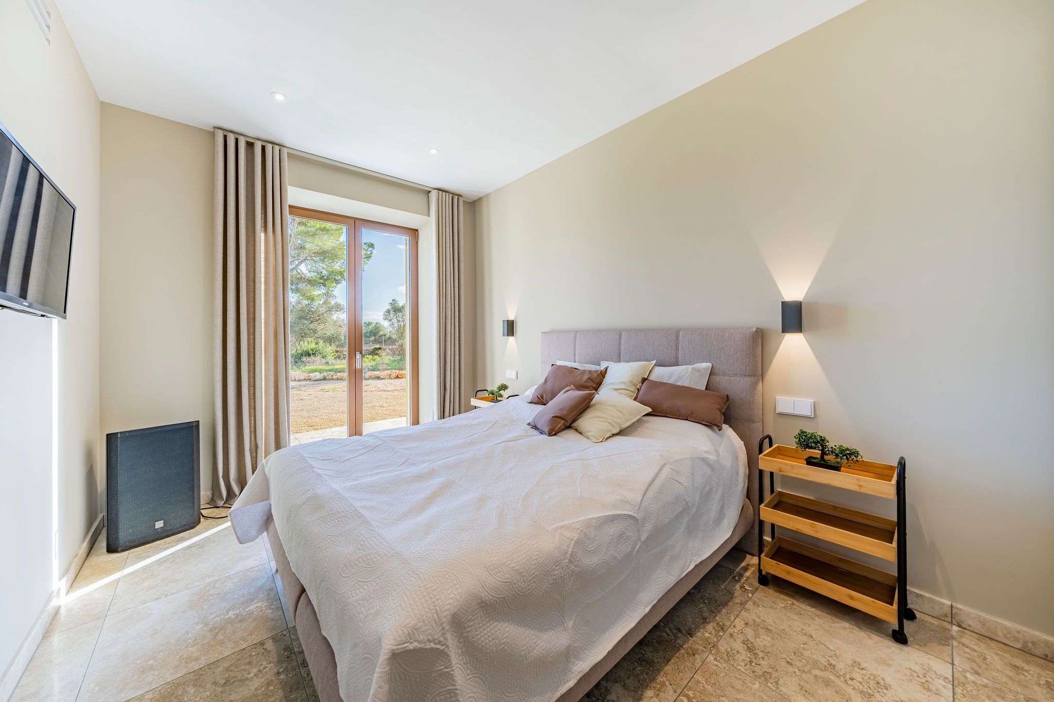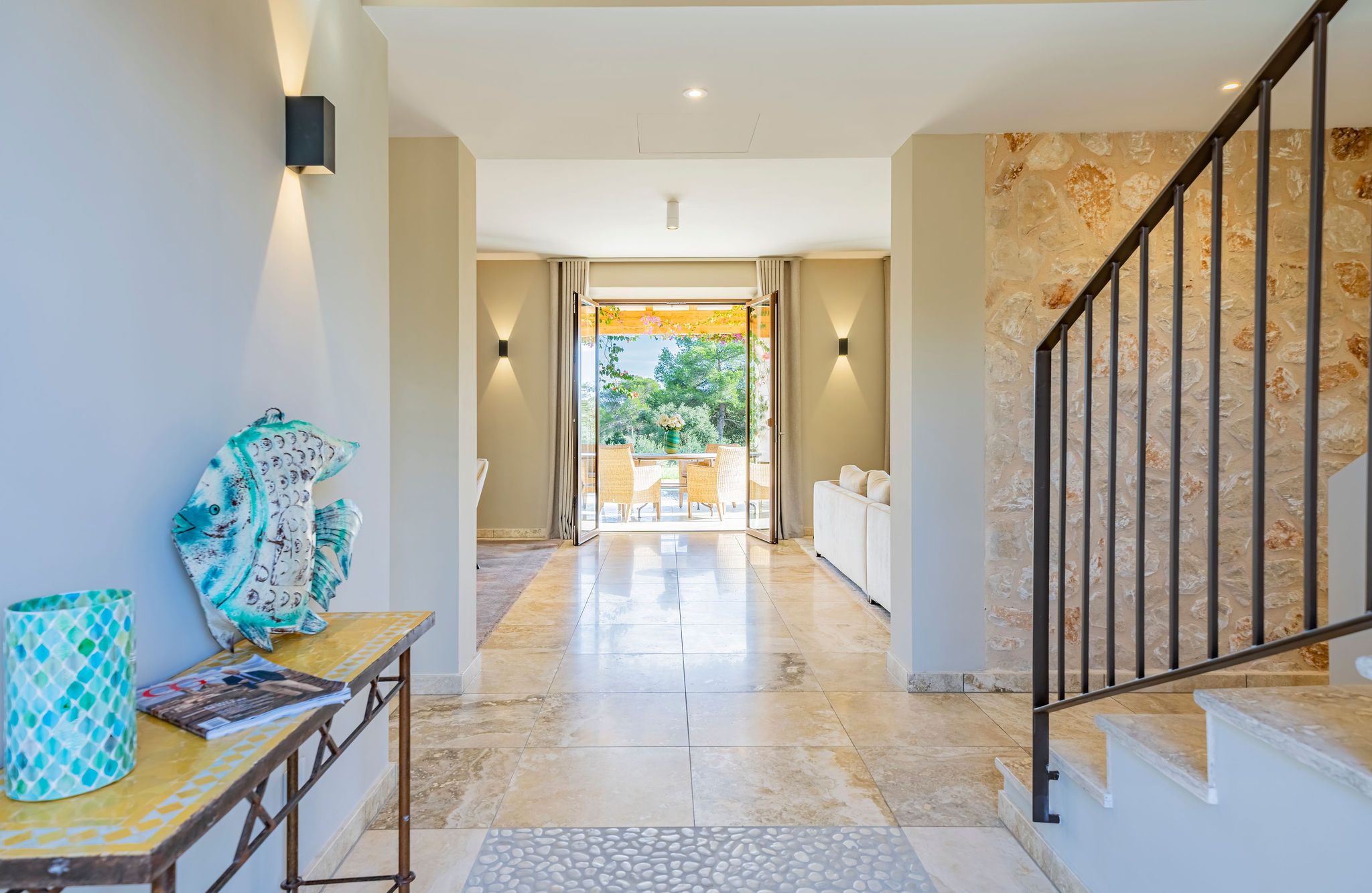 Aquesta elegant finca de nova construcció s'erigeix sobre un lleuger turó per sobre del pintoresc port de Porto Petro, un dels llocs més encantadors i autèntics de la costa sud-est de Mallorca. A través d'un camí d'accés privat corbat, s'arriba a la propietat en el punt més alt del terreny. Dos accessos ofereixen comoditat especial: l'accés principal porta representativament directament a la casa, mentre que un segon accés separat amb portó elèctric permet un ràpid accés al pintoresc port. En entrar, el lluminós vestíbul s'obre a un ampli espai habitable amb cuina oberta, menjador i sala d'estar. Grans finestrals proporcionen molta llum i condueixen a la terrassa coberta amb vista al jardí mediterrani. L'ala dreta de la casa compta amb dos dormitoris, un bany, una condícia de convidats, una sauna i un quart de servei, ideal per a convidats o com a àrea separada. En el pis superior es troba l'àrea de descans privada amb dormitori principal amb bany en suite i terrassa, així com dos dormitoris addicionals amb bany compartit. L'àrea exterior impressiona per la seva estructura clara i disseny cuidat. Una entrada majestuosa condueix al garatge i àrees d'estacionament, mentre que lateralment una pèrgola ofereix espai addicional. La gran piscina amb àrees de gespa i terrasses constitueix el cor del jardí. La casa de piscina adjacent amb cuina exterior preparada convida a hores de convivència; l'equip de la casa i de la piscina està discretament ubicat al soterrani. La finca combina la construcció tradicional de pedra natural amb tecnologia moderna. Una bomba de calor d'aire eficient proveeix la calefacció per sòl radiant, l'aire condicionat i el sistema domòtic ofereixen el màxim confort. L'equipament es complementa amb un sistema fotovoltaic, connexió a la xarxa elèctrica de la ciutat, aigua de la ciutat amb sistema d'osmosi i dues cisternes, de les quals una alimenta el reg automàtic del jardí.