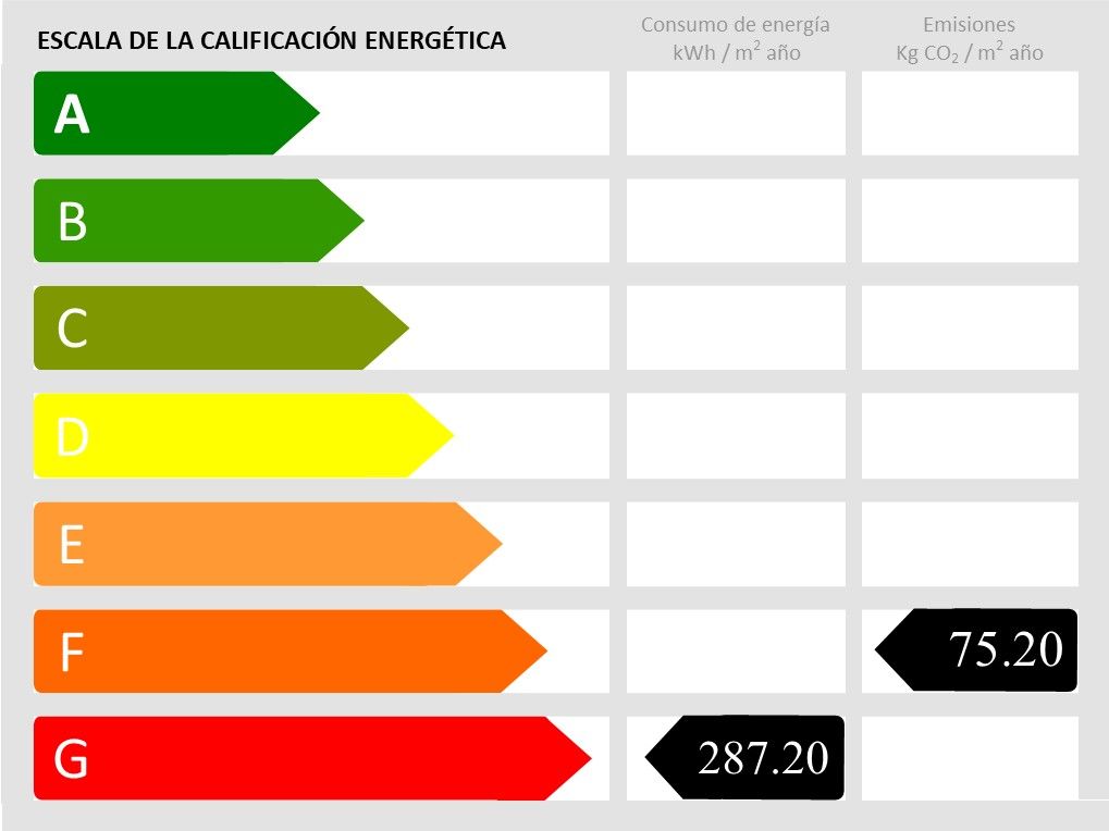 Any de construcció: 2002 • Emissions CO2: 75.2 kg/m2 • Escala de Emissions de CO2: F • Tipus de calefacció: Bomba de calor • Tipus de calefacció: Elèctrica • Classe d'eficiència energètica: G