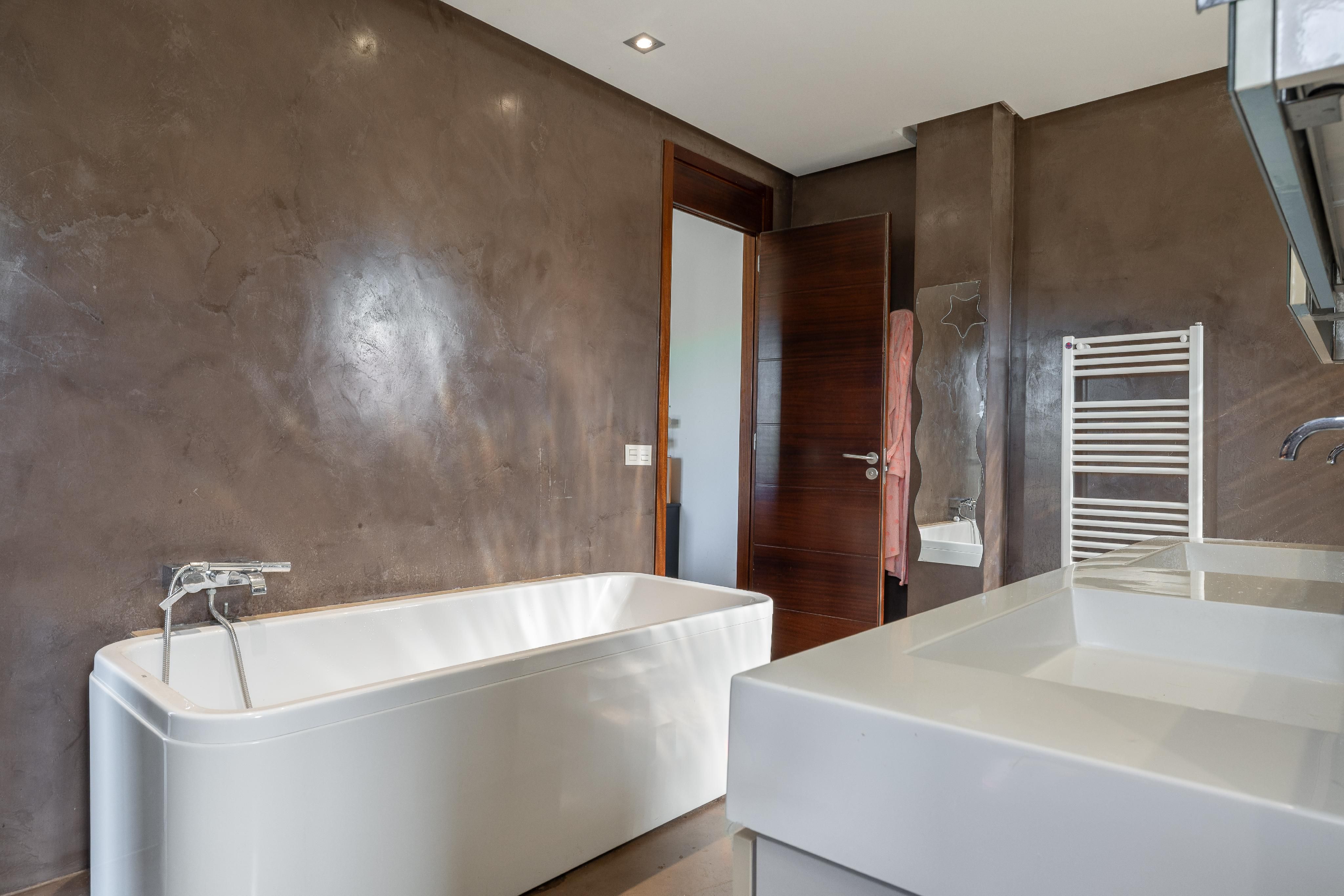 La casa disposa a més de diverses terrasses i porxos destacant una espectacular piscina de 74 m2, el lloc perfecte per gaudir dels dies de sol. Des de la casa i la piscina, les vistes panoràmiques de la Serra de Tramuntana són totalment buidades. Addicionalment en semisoterrani compta amb una gran sala diàfana amb llum natural, ideal per instal·lar per exemple un gimnàs o un apartament independent.