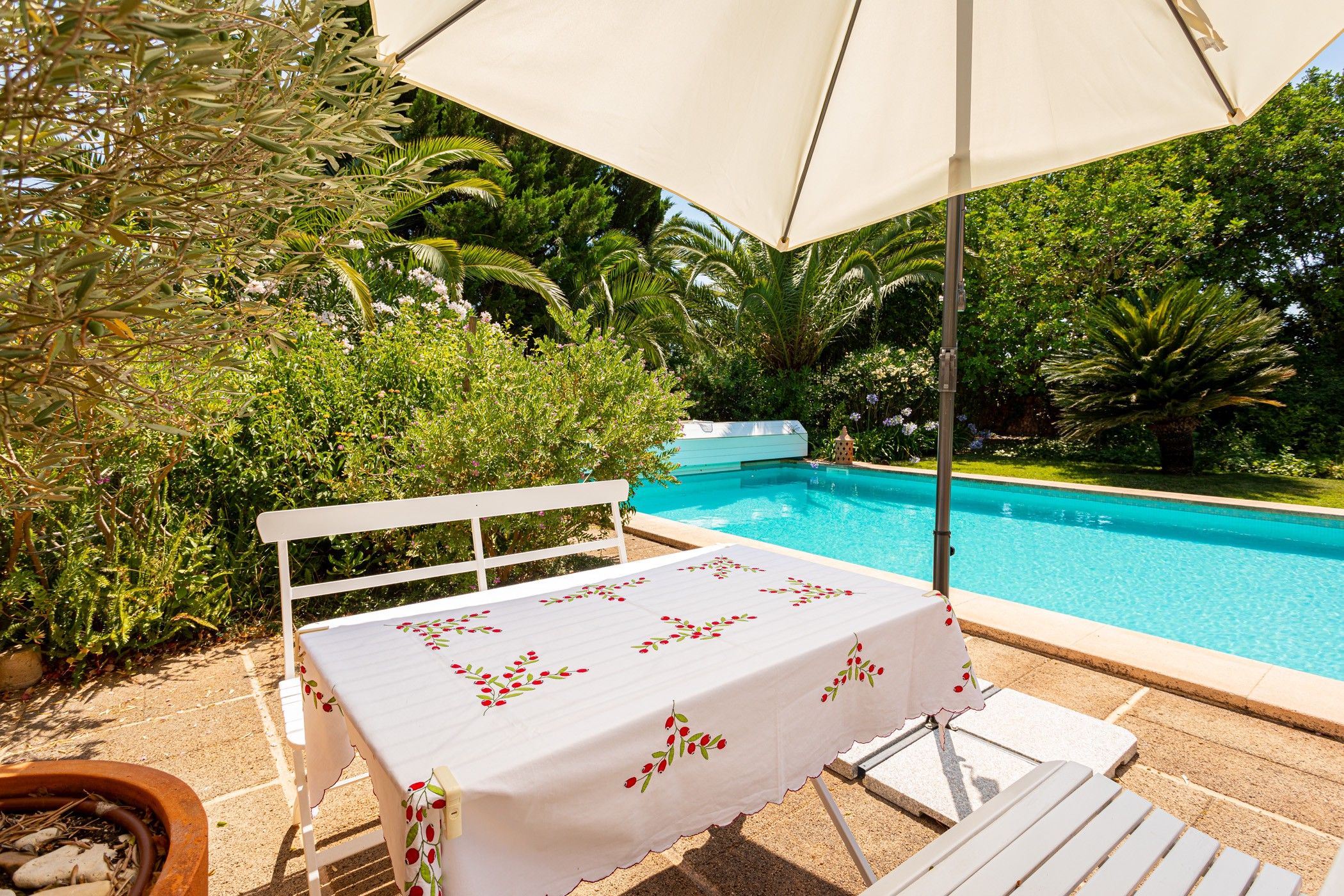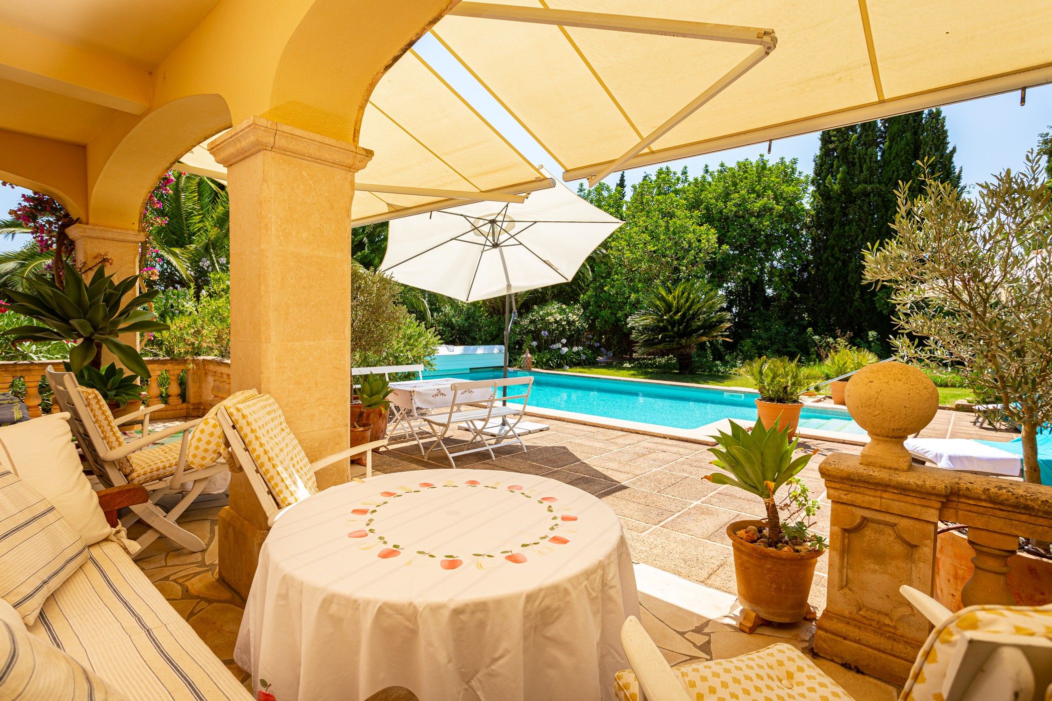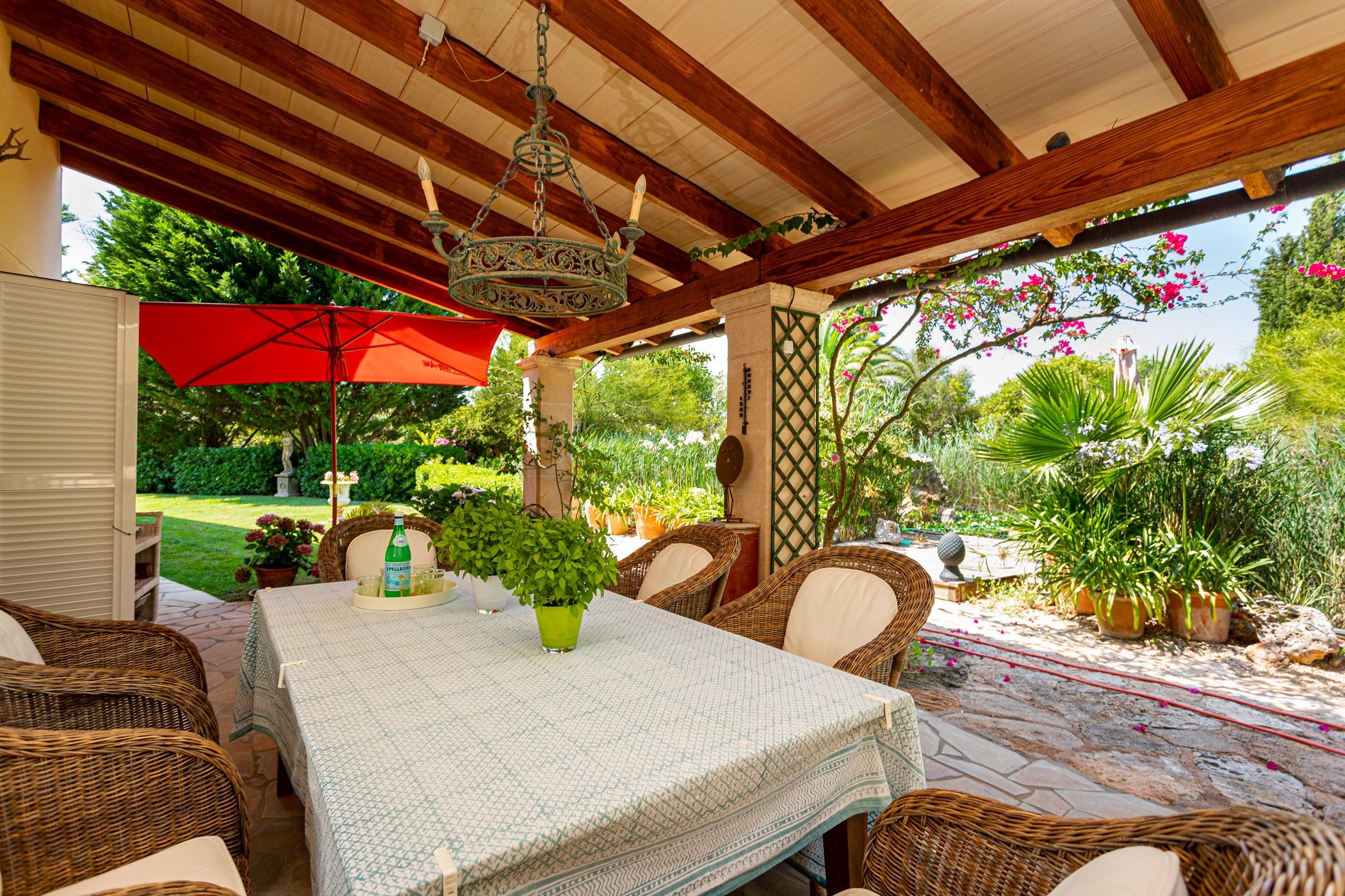 La casa està orientada al sud i envoltada d'àmplies terrasses, algunes cobertes, el que permet gaudir de l'exterior durant tot l'any. Al costat de l'habitatge es troba una gran piscina amb coberta automàtica i una dutxa exterior amb aigua calenta i freda. A l'exterior també hi ha una encantadora cuina a l'aire lliure i un estany decoratiu amb peixos koi, acuradament dissenyat. A més, la propietat compta amb una caseta d'eines, un garatge doble i una antiga casa de pedra amb molt de caràcter. Darrere de l'habitatge principal es troba un altre estany de major grandària, envoltat de plantes aquàtiques i koi, que aporta una atmosfera tranquil·la i natural.