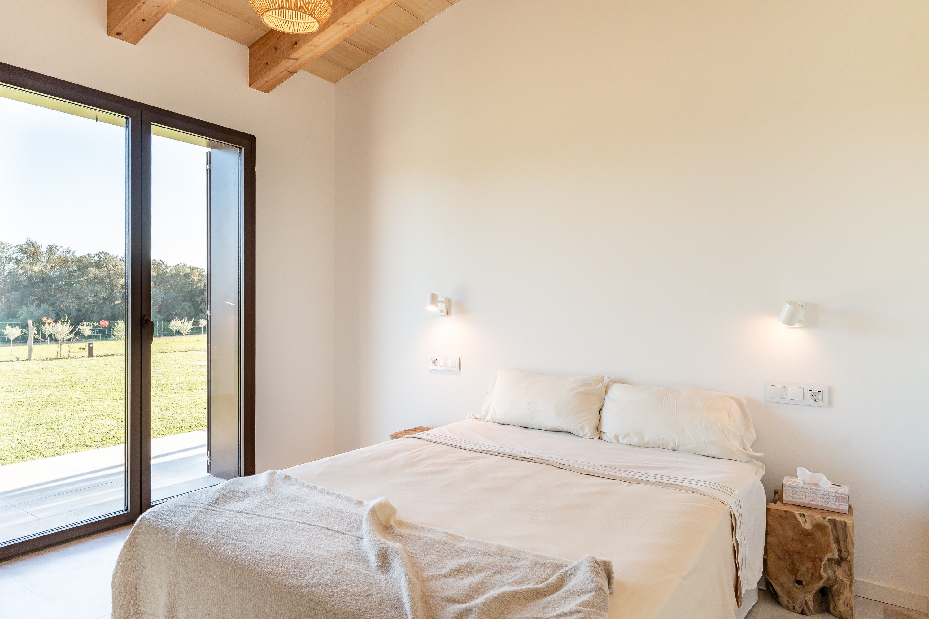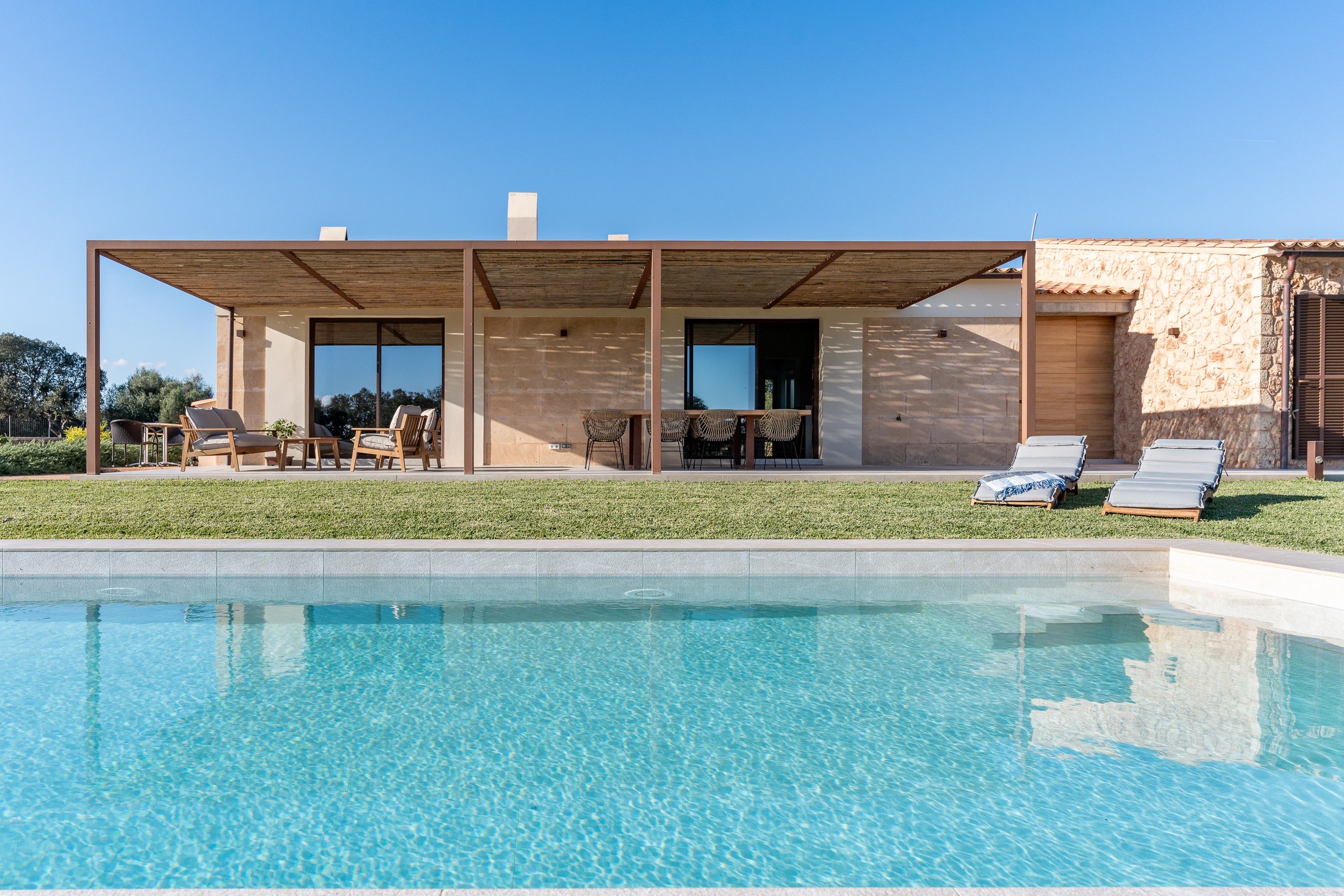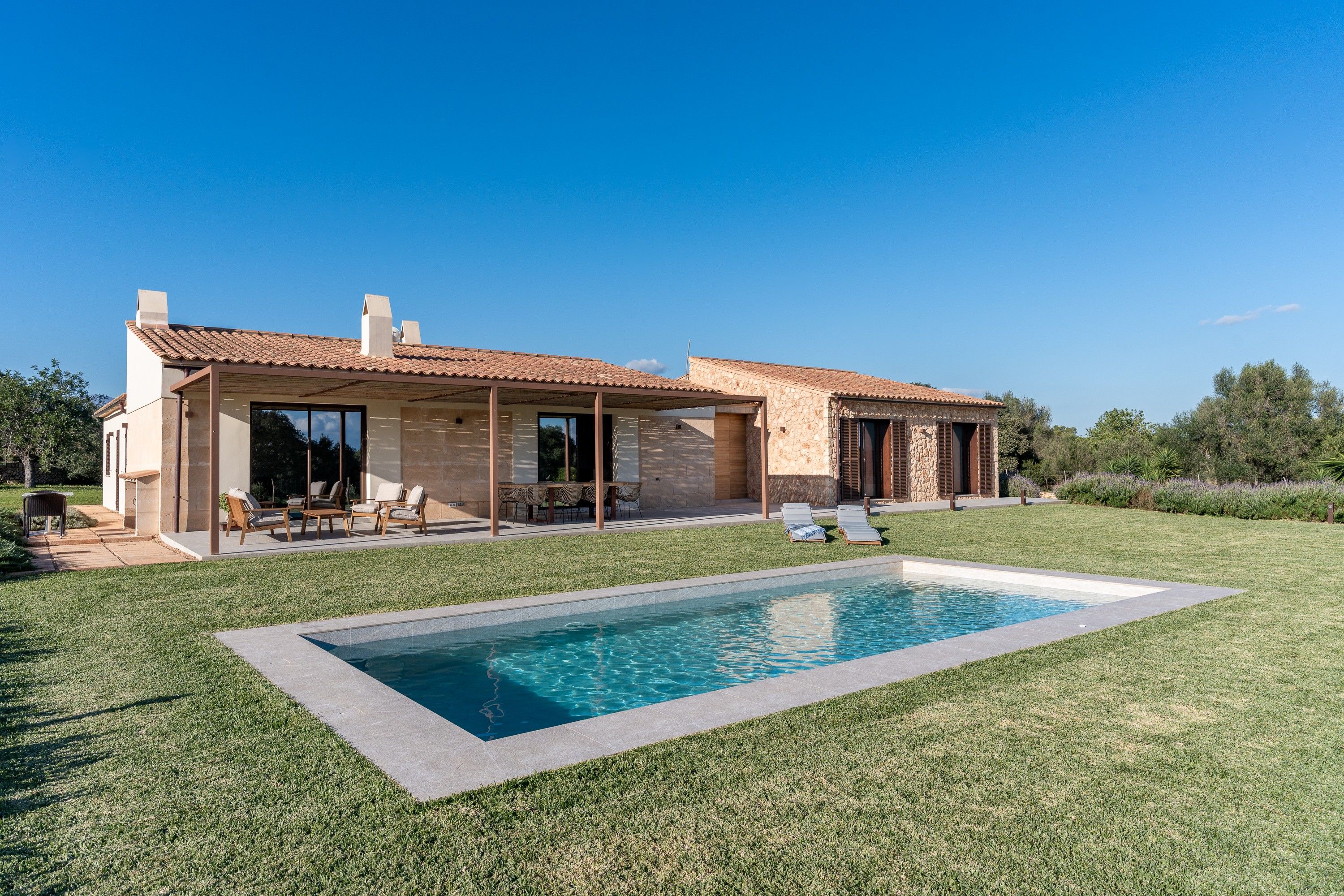 Als afores d'Inca, trobaràs aquesta encantadora casa de camp moderna, llista per rebre els seus propietaris. La casa, distribuïda en una sola planta, ha estat dissenyada acuradament per aprofitar al màxim cada espai. A la zona central, un ampli i lluminós espai obert alberga la cuina, el menjador i la sala d'estar, tots amb una gran entrada de llum natural. A l'altre costat de la casa, es troben els tres dormitoris: el principal, amb bany en suite i vestidor, i els altres dos, que comparteixen un vestidor i una neteja addicional. A més, la propietat compta amb un rebost, bugaderia i un garatge amb capacitat per a dos vehicles i espai d'emmagatzematge. La casa manté l'encant d'una autèntica finca mallorquina, amb una façana de pedra natural i bigues de fusta, combinats amb acabats moderns quant a decoració, il·luminació i sòls. A l'exterior, gaudiran d'una zona enjardinada que envolta una bonica piscina, perfecta per relaxar-se amb total privacitat i tranquil·litat. A més, la casa està envoltada per un bell camp amb oliveres i tarongers, la qual cosa la converteix en un lloc idoni per gaudir de la serenitat de l'entorn rural. Característiques: aire condicionat per conductes, bany de cortesia, sistema de reg, bugaderia, electricitat municipal, subministrament d'aigua per pou propi, heat pump, sòl radiant, xemeneia, plaques solars sense bateria, façana de pedra natural.