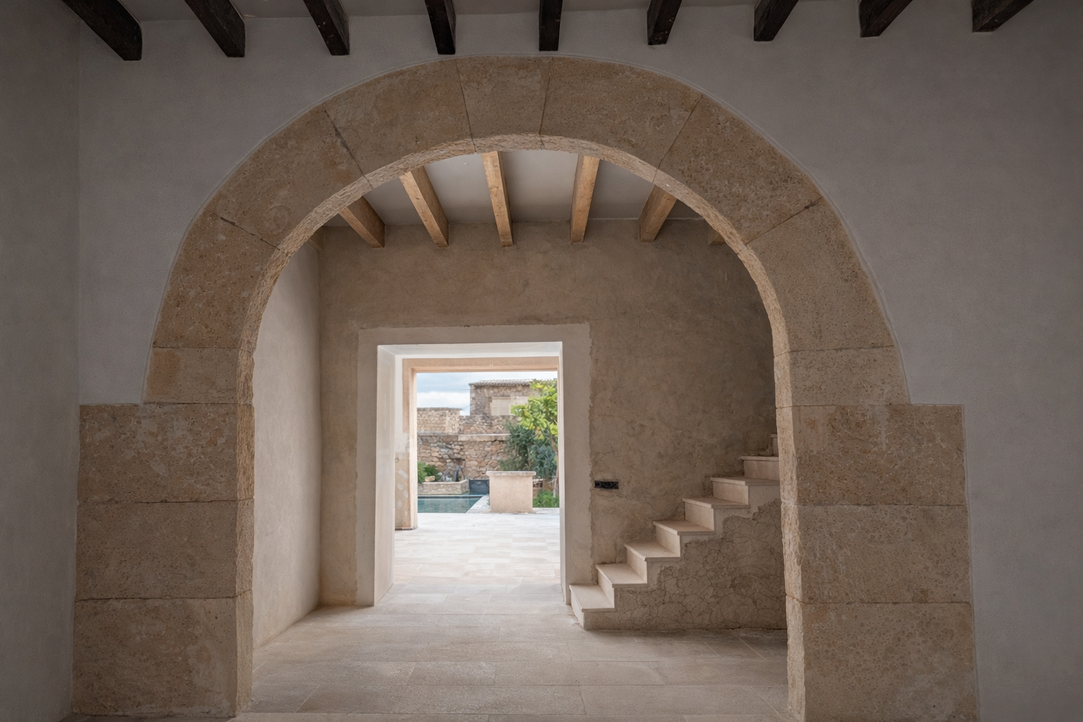 En accedir a l'habitatge, un ampli rebedor dóna la benvinguda i ofereix accés directe al garatge i a una neteja de cortesia. Un preciós arc original de pedra de marès condueix al saló-menjador de concepte obert. En aquest espai es fusionen l'estil de vida modern i l'arquitectura autèntica: una cuina moderna d'alta qualitat, una xemeneia i parets de pedra natural vistes creen un ambient càlid i acollidor. Grans finestrals connecten l'interior amb la cura jardí i la piscina.