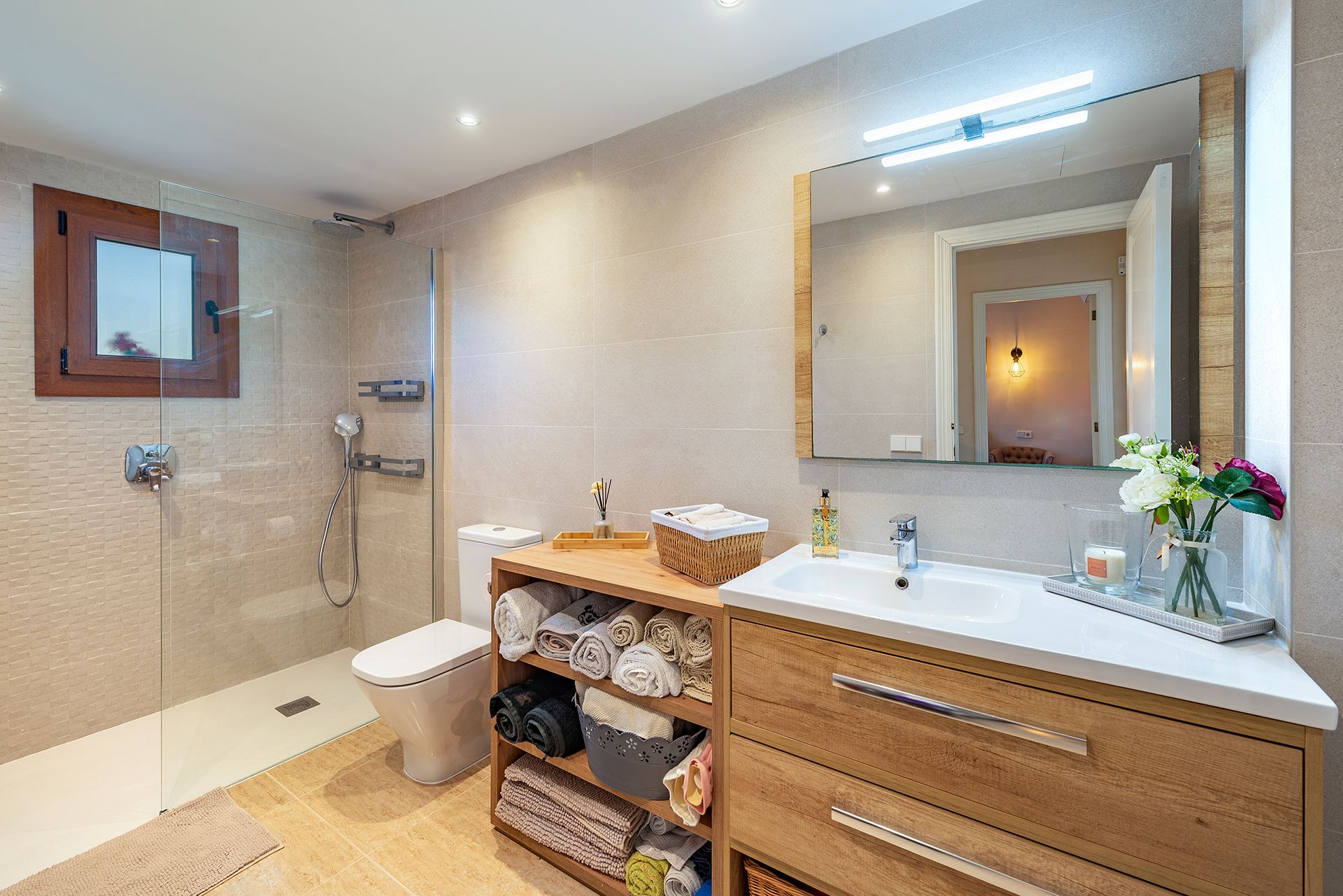 La casa compta amb una acollidora cuina i un agradable saló, equipats amb aire condicionat per zones i una elegant xemeneia elèctrica, creant un ambient càlid i modern alhora. A la planta baixa hi ha un bany de convidats amb dutxa, mentre que a la planta superior es troben un bany complet i tres dormitoris de bona grandària, dos dels quals tenen accés a un assolellat balcó.