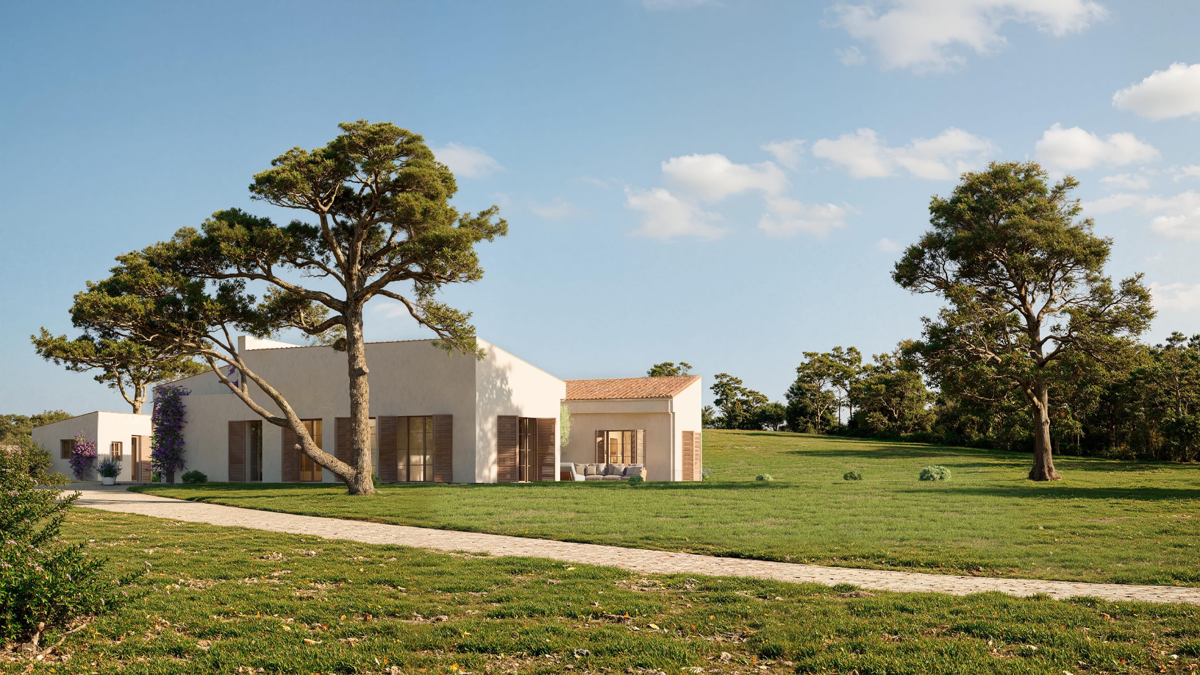 La finca s'assenta sobre una parcel·la elevada de 14.400 m2, protegida enfront de futures edificacions, la qual cosa garanteix vistes obertes, amplitud i un alt grau de privacitat. La topografia del terreny crea una sensació d'espai propi i aïllament, poc habitual a la zona.