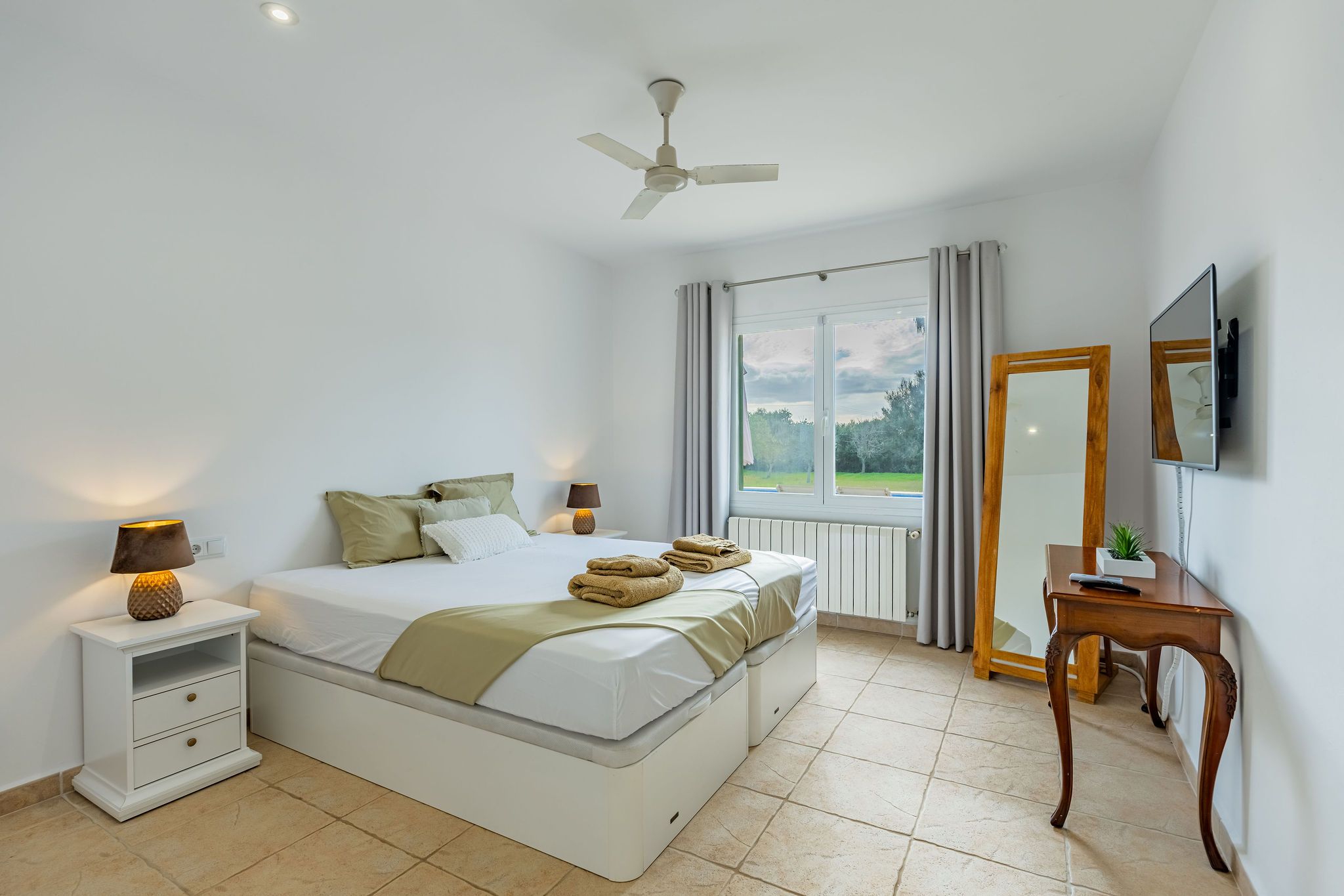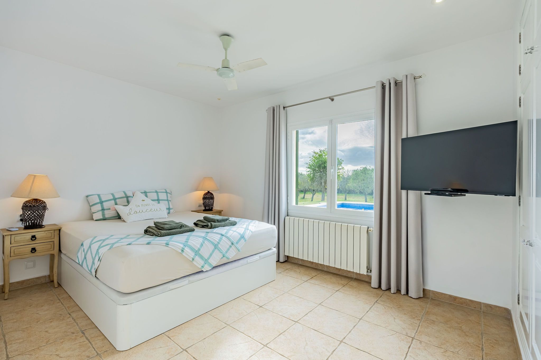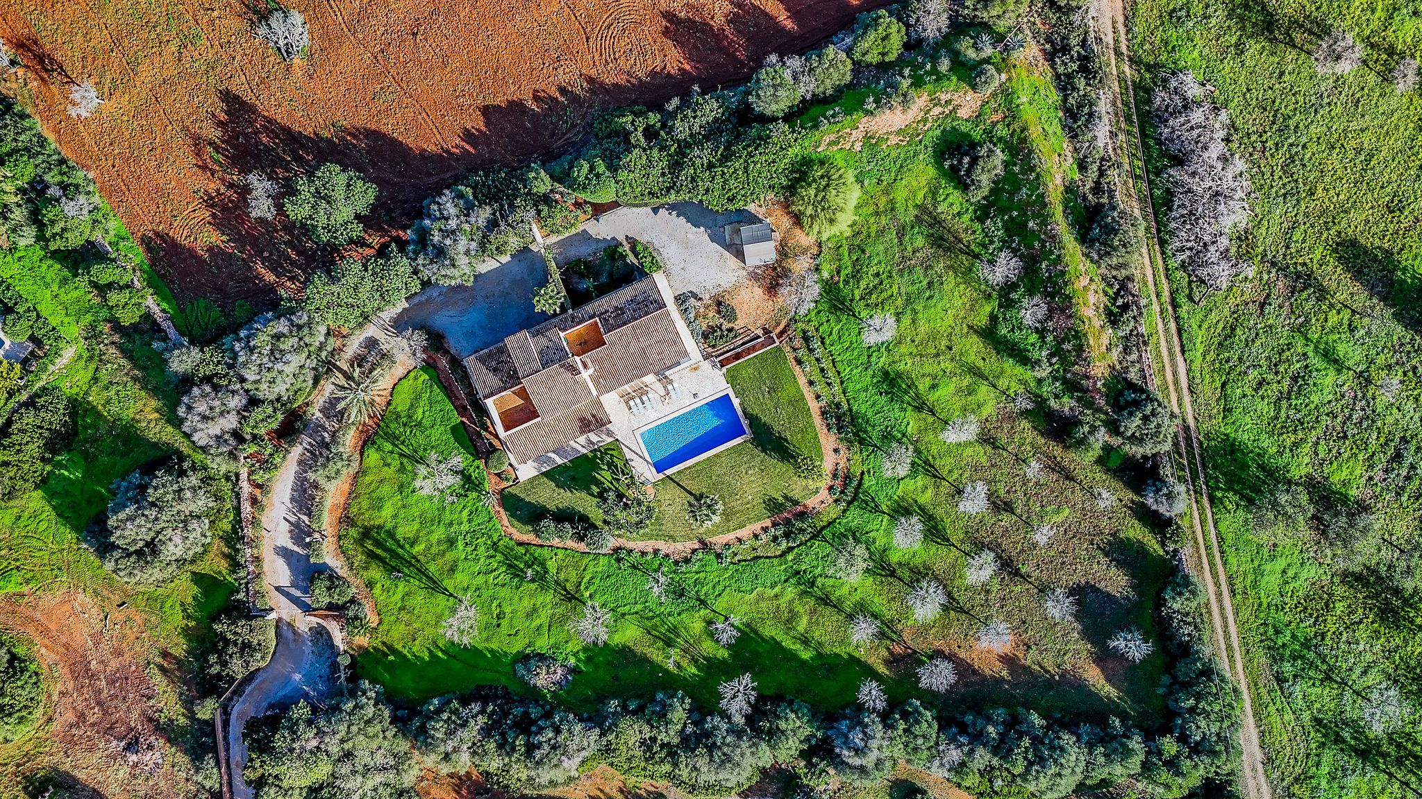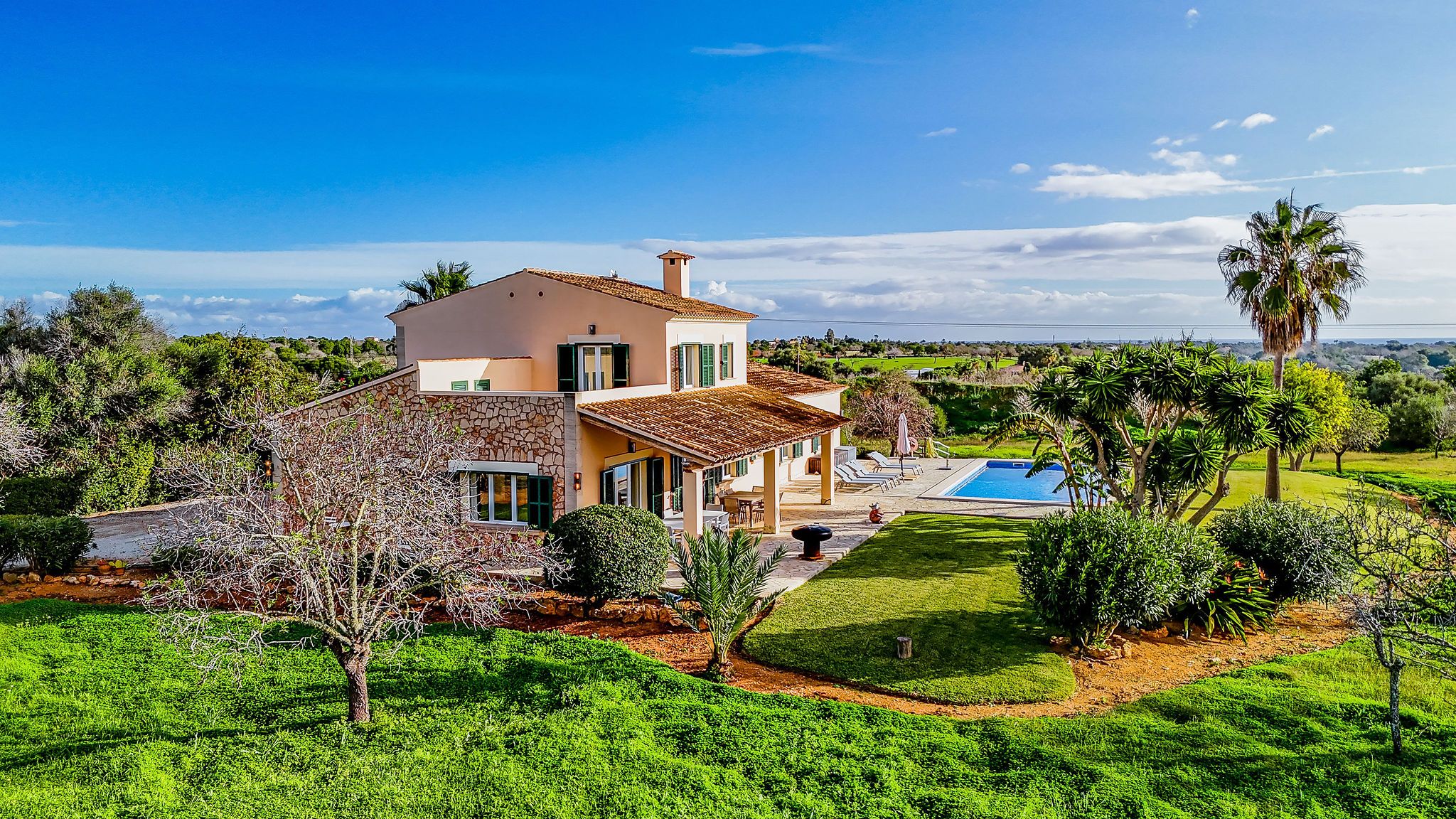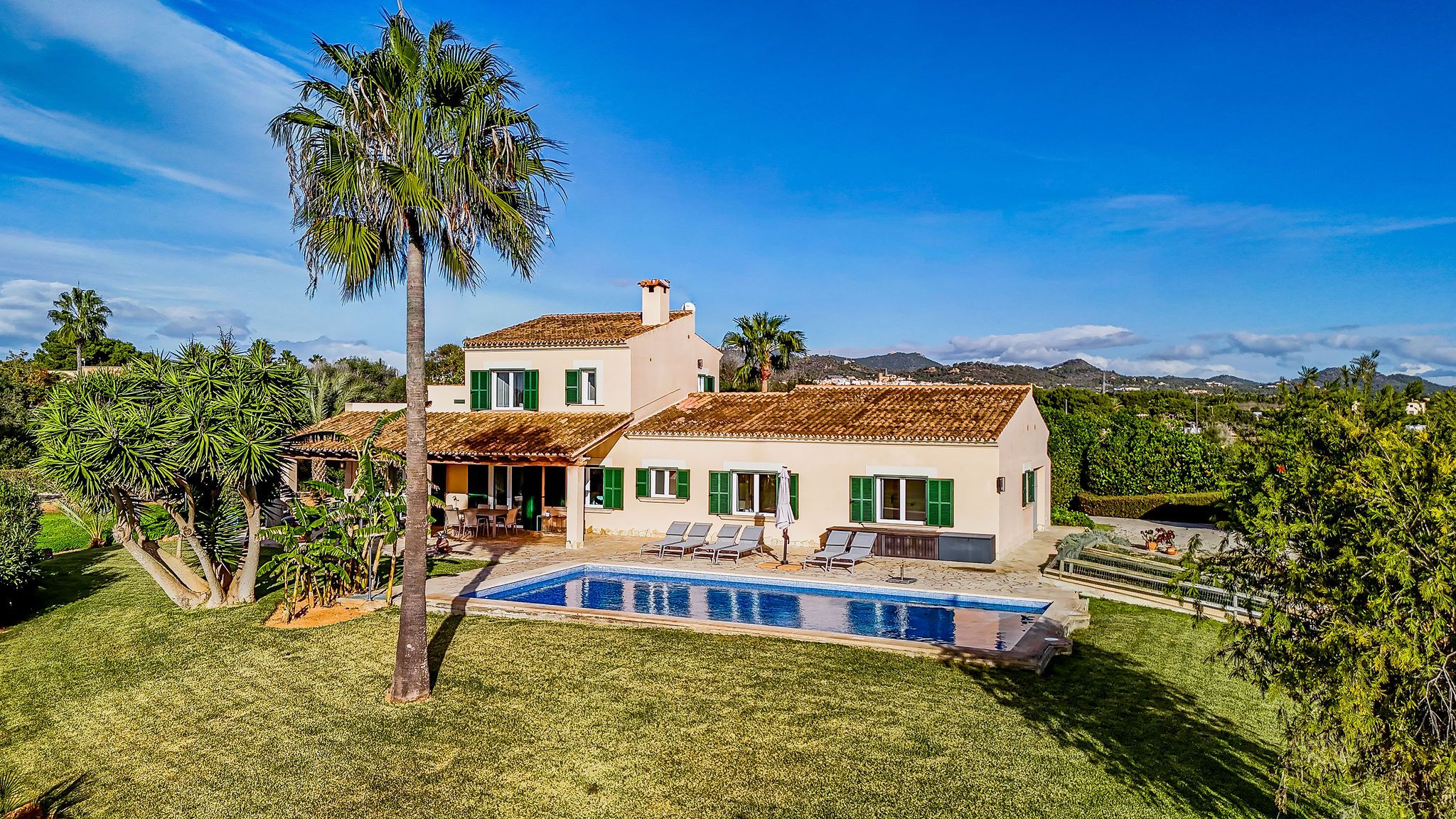 Aquesta finca es troba entre Calonge i Cala d'Or en un terreny d'aprox. La superfície total d'al voltant de 192 m2 es distribueix en dos nivells i destaca per un disseny funcional i harmoniós. Una cobdícia llicència ETV per fins a set llits també fa que aquesta propietat sigui ideal per a lloguers vacacionals. En entrar a la finca, a la dreta es troba la sala d'estar i menjador oberta, que està inundada de llum a través de grans finestrals i ofereix accés directe a la terrassa. La cuina està dissenyada de manera individual i compta amb una illa de cuina acollidora. La terrassa parcialment coberta estén l'espai habitable a l'aire lliure i condueix directament a la zona de la piscina. L'ala esquerra de la planta baixa alberga dos dormitoris i dos banys, oferint un retir agradablement separat. A la planta superior, trobarà el dormitori principal amb bany en suite, així com una altra habitació que actualment s'utilitza com a dormitori. Des d'aquest nivell, també es pot gaudir d'una bella vista al mar sobre el paisatge circumdant. Les característiques tècniques inclouen calefacció per sòl radiant i unitats d'aire condicionat de tipus split, assegurant un clima interior agradable durant tot l'any. Un garatge proporciona comoditat i espai d'emmagatzematge addicional. Aquesta finca combina arquitectura clàssica, un pla ben pensat i una ubicació privilegiada entre Calonge i Cala d'Or, ideal com a residència privada o com una propietat vacacional d'alt rendiment.