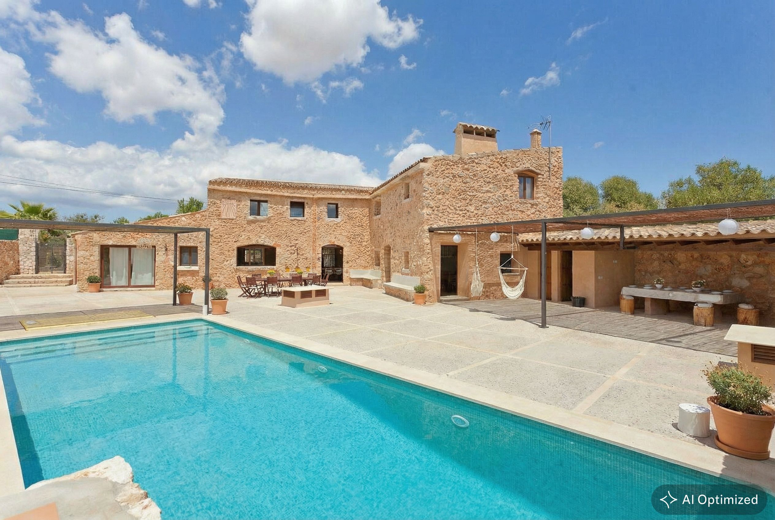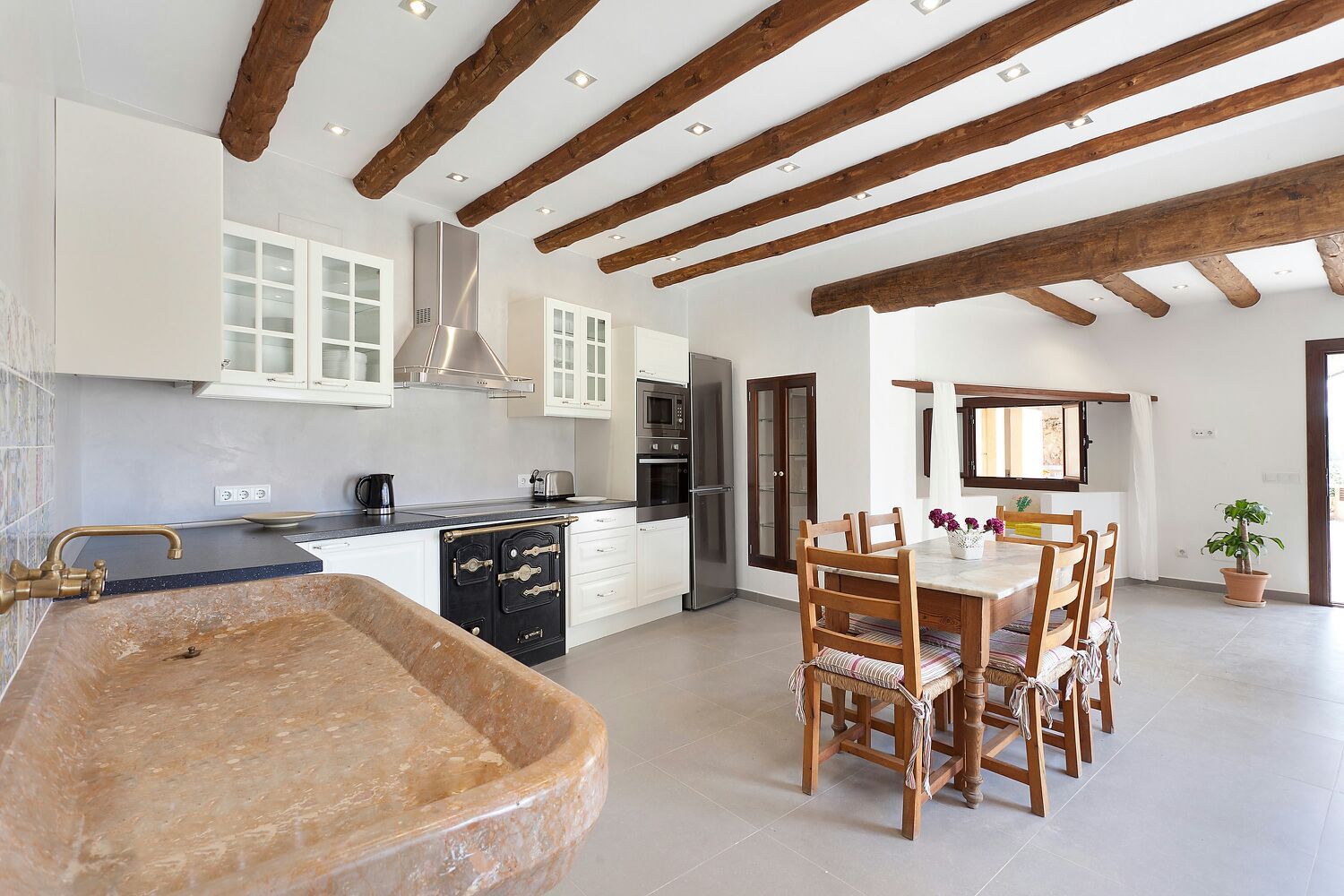 La propietat ofereix un ambient càlid i acollidor, combinant un exterior rústic amb comoditats modernes. Les parets de pedra vistes, els grans rajoles, els sostres alts i les bigues de fusta exposades creen un equilibri harmoniós entre el caràcter tradicional mallorquí i la vida contemporània.
