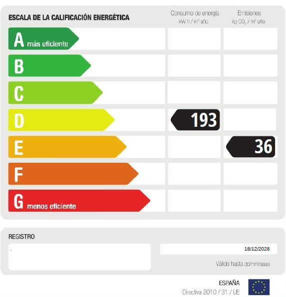 • Valor de consum energètic: 193.0 kWh/(m2*a) • Escala de Emissions de CO2: E • Tipus de calefacció: Gasoil • Classe d'eficiència energètica: D