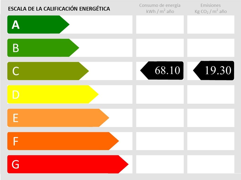 Any de construcció: 2019 • Emissions CO2: 19.03 kg/m2 • Escala de Emissions de CO2: C • Tipus de calefacció: Bomba de calor • Classe d'eficiència energètica: C