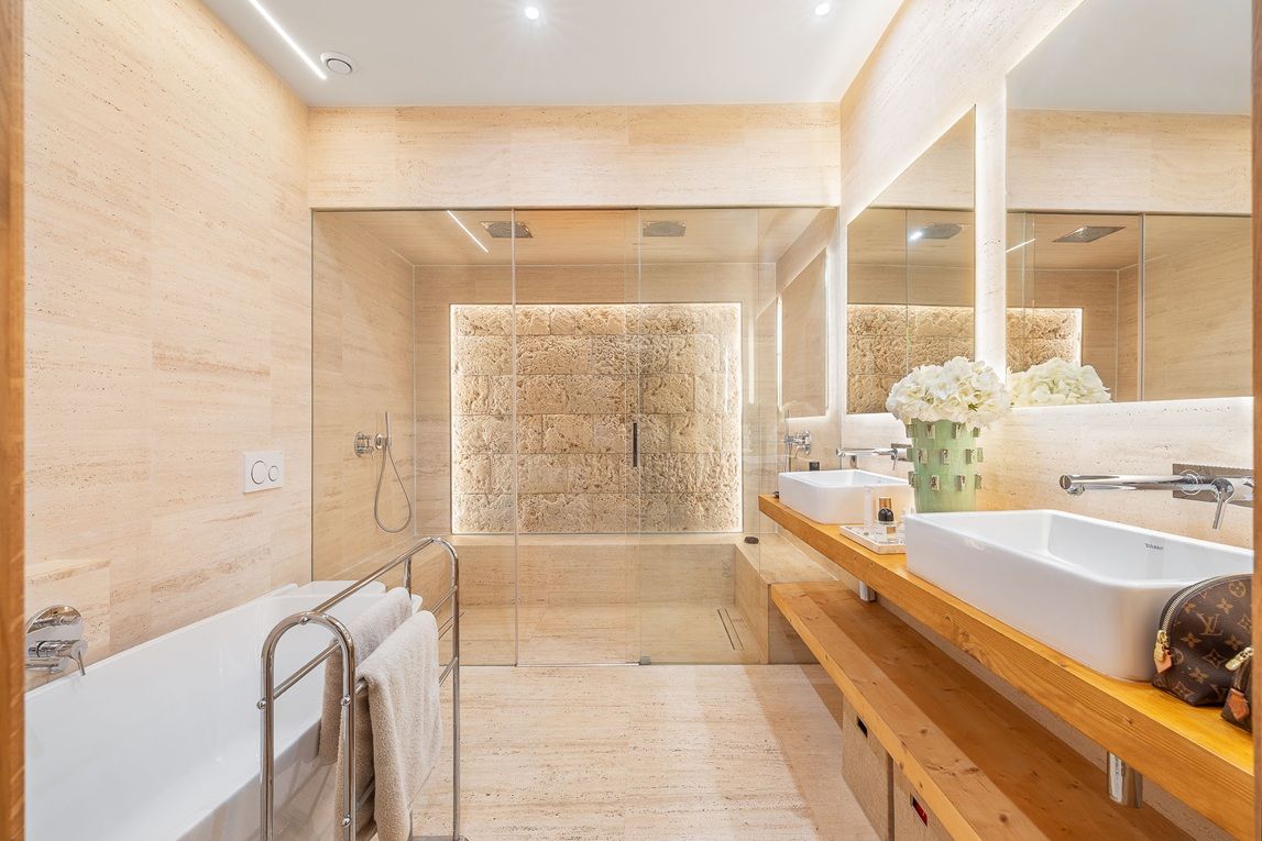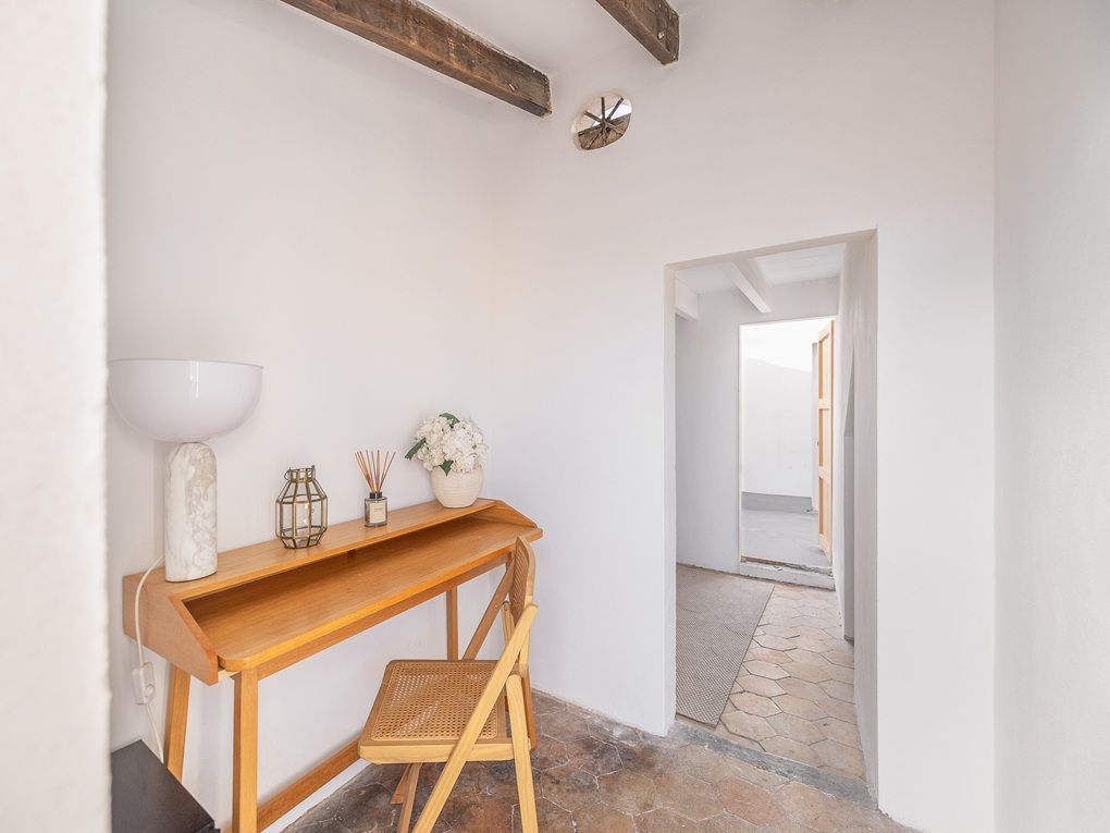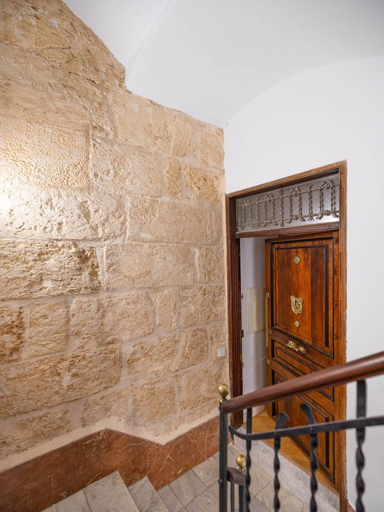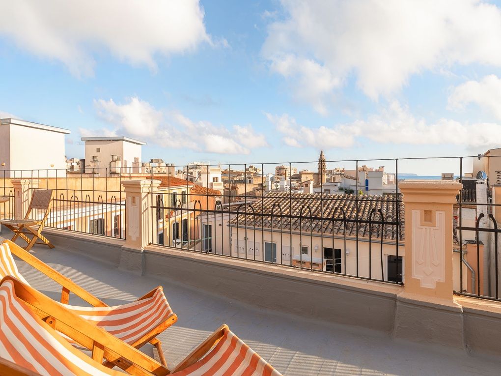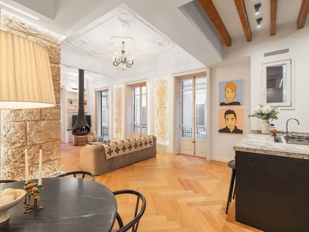 Aquest impressionant apartament d'aproximadament 180 m2 es troba en la primera planta d'un edifici històric a Sa Gerreria, el nou barri de moda de Palma, on actualment sorgeixen nombrosos hotels boutique, restaurants i tendes. La bella porta d'entrada antiga, igual que la porta del propi apartament, ja anticipen que es tracta d'una propietat veritablement especial. L'habitatge està format per la unió de dos apartaments del nucli antic i ofereix ara tres dormitoris, tres banys, una neteja de convidats, un vestidor, un traster, un jardí d'hivern i diversos balcons. Grans finestres modernistes recorren la façana exterior, permetent que la llum natural inundi tots els espais interiors. Els clàssics sostres amb estuc, les bigues de fusta vistes i els característics murs de pedra Mares aporten un encant arquitectònic únic a la propietat. L'elegant sòl de parqué de roure transmet calidesa i sofisticació, mentre que la moderna xemeneia suspesa crea un ambient especialment acollidor durant els mesos més frescos. Un altre dels grans atractius és l'àmplia terrassa comunitària en el terrat, des de la qual es gaudeixen vistes panoràmiques sobre el casc antic i fins al mar. A més, a la terrassa hi ha dues petites estades amb un total d'uns 20 m2 que pertanyen exclusivament a l'apartament i ofereixen múltiples possibilitats d'ús.