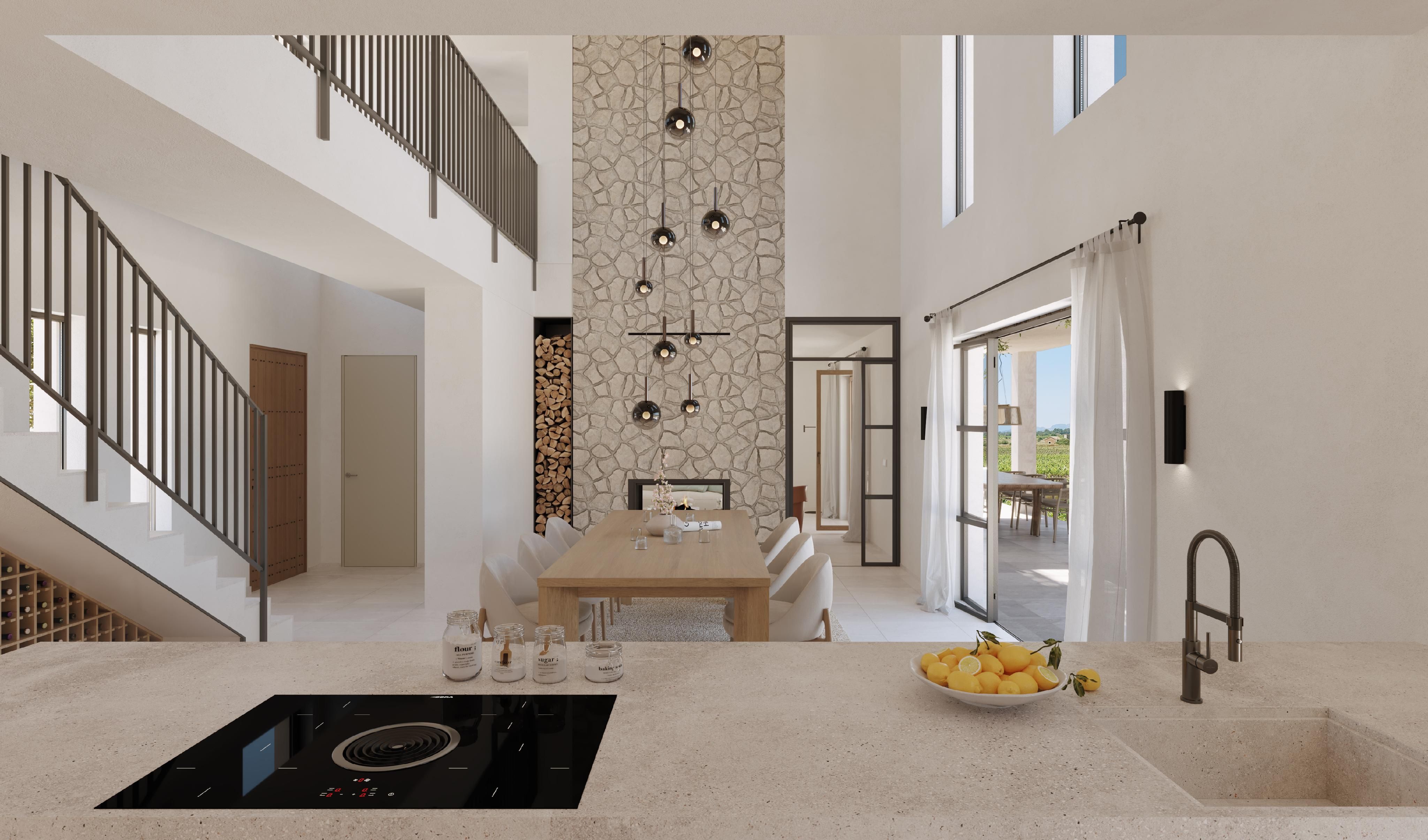 Amb aquesta finca neix una joia arquitectònica que combina, en perfecta harmonia, l'elegància moderna i la tradició mallorquina. Envoltada d'autèntics murs de pedra natural i amb una vista panoràmica a la Serra de Tramuntana, aquesta propietat s'erigeix com un refugi atemporal de la més alta qualitat. El cor de la casa el conforma un imponent saló la planta oberta del qual, realçada per una galeria i sostres de doble altura, ofereix una amplitud extraordinària. Destaca especialment la paret de pedra natural de dos nivells amb una xemeneia de túnel integrada, que no només dota de calidesa al saló sinó també a la cuina i al menjador, mentre que les bigues de fusta vistes subratllen el seu genuí caràcter mediterrani.