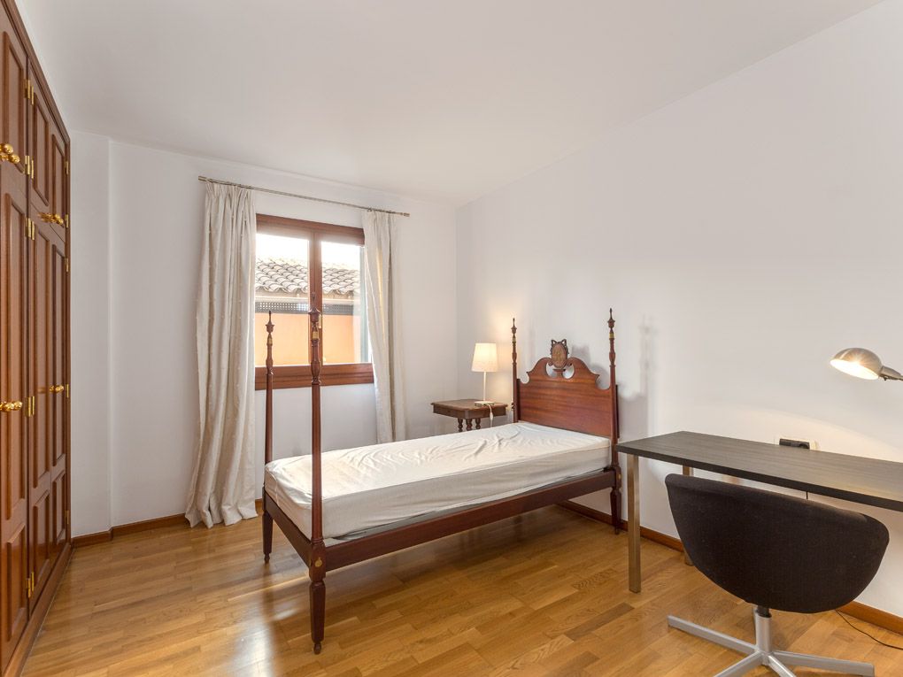 Els aproximadament 140 m2 de superfície habitable estan distribuïts de manera funcional i inclouen un ampli saló-menjador, una cuina independent, tres dormitoris i dos banys, un d'ells en suite. A més, l'apartament compta amb diversos balcons i una petita terrassa coberta orientat al sud amb vista a la cura jardí comunitària. Les habitacions estan connectades de forma clàssica i funcional mitjançant un passadís. L'apartament s'ofereix moblat, no obstant això, si es desitja, també es podria llogar sense moblar. Els sòls de parquet i ceràmica d'alta qualitat aporten una atmosfera càlida i acollidora, mentre que l'aire condicionat central (fred/calor) i les finestres de doble envidrament asseguren temperatures agradables durant tot l'any. Diversos armaris encastats proporcionen ampli espai d'emmagatzematge i major funcionalitat. L'edifici compta amb ascensor per a major comoditat. Així mateix, es disposa d'una plaça d'aparcament en el mateix edifici per 180 y/mes i un traster inclòs en el preu del lloguer. Una autèntica oasi en el cor de Palma El període mínim de lloguer és d'un any.