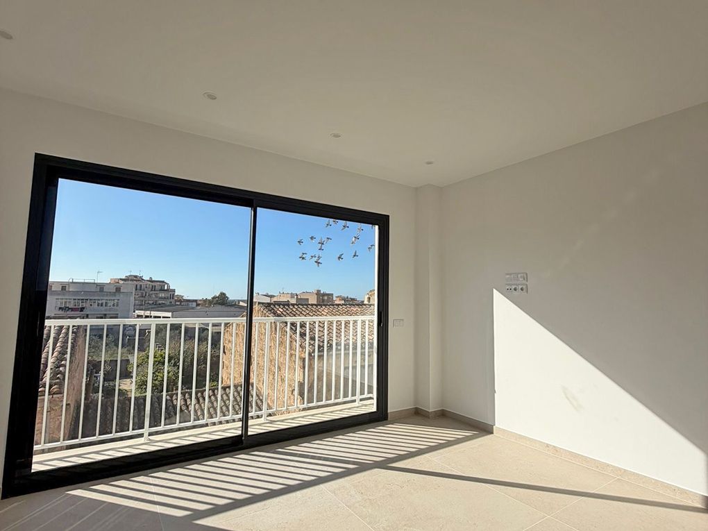 The interior stands out for its clean, contemporary aesthetic, where high-quality tiled floors provide elegance and continuity throughout the space. The layout features two bright bedrooms, a modern bathroom with a shower, and a cozy integrated living-dining area and kitchen designed for social living. While the apartment includes a pleasant terrace on the main floor, the true standout feature is its impressive private roof terrace. From this exclusive space, you can enjoy captivating, unobstructed views of Llucmajor’s iconic church and the silhouette of Mount Randa—the perfect setting to relax at sunset or enjoy outdoor gatherings in total privacy. Additional features: Air conditioning pre-installation.