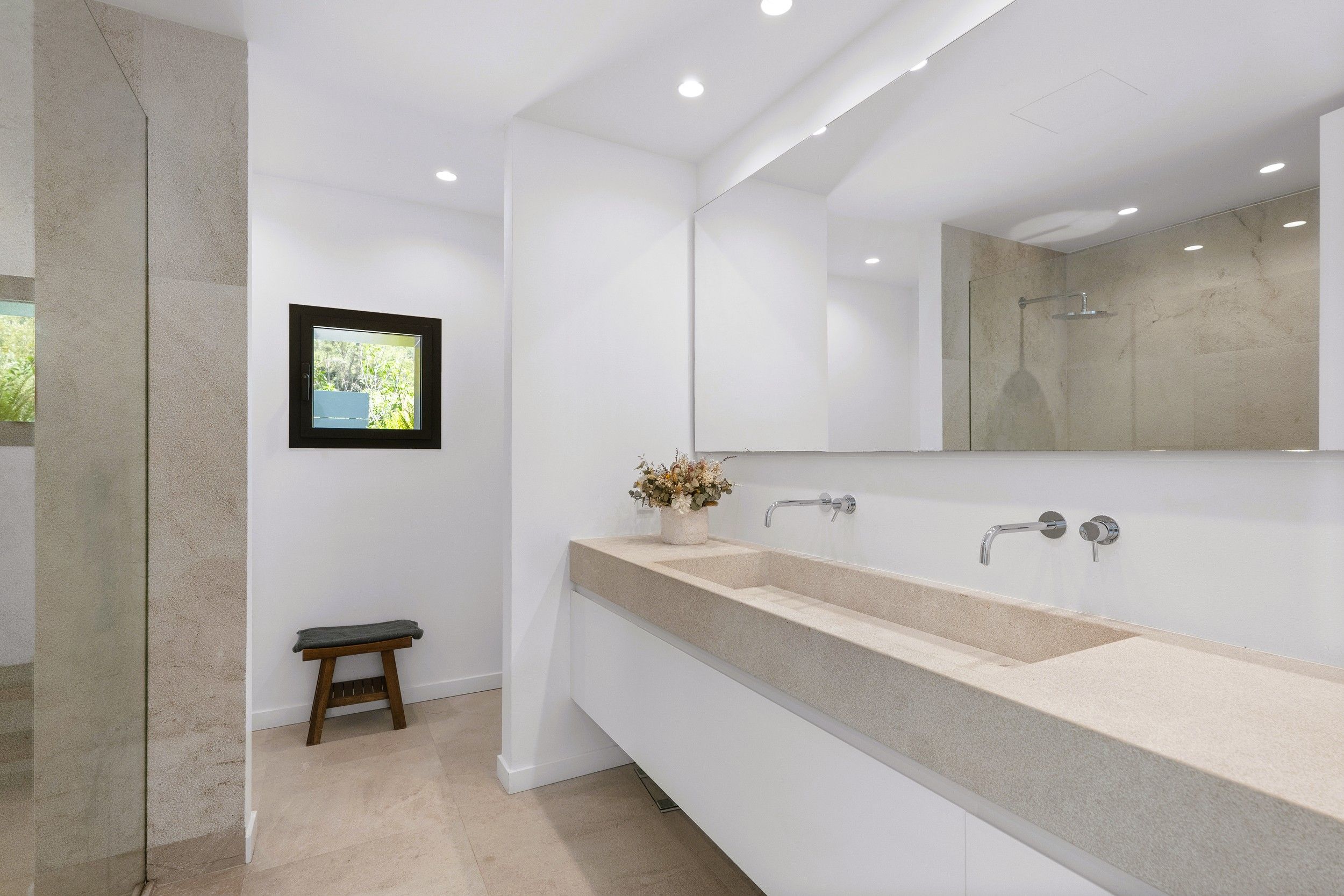 L'equipament i els acabats de la casa responen als més alts estàndards de qualitat. L'elegant sòl interior de grans lloses de marbre aporta un caràcter sofisticat i atemporal. A l'exterior, la façana combina la pedra natural d'estil mediterrani amb línies arquitectòniques modernes, creant un equilibri harmoniós entre tradició i avantguarda.