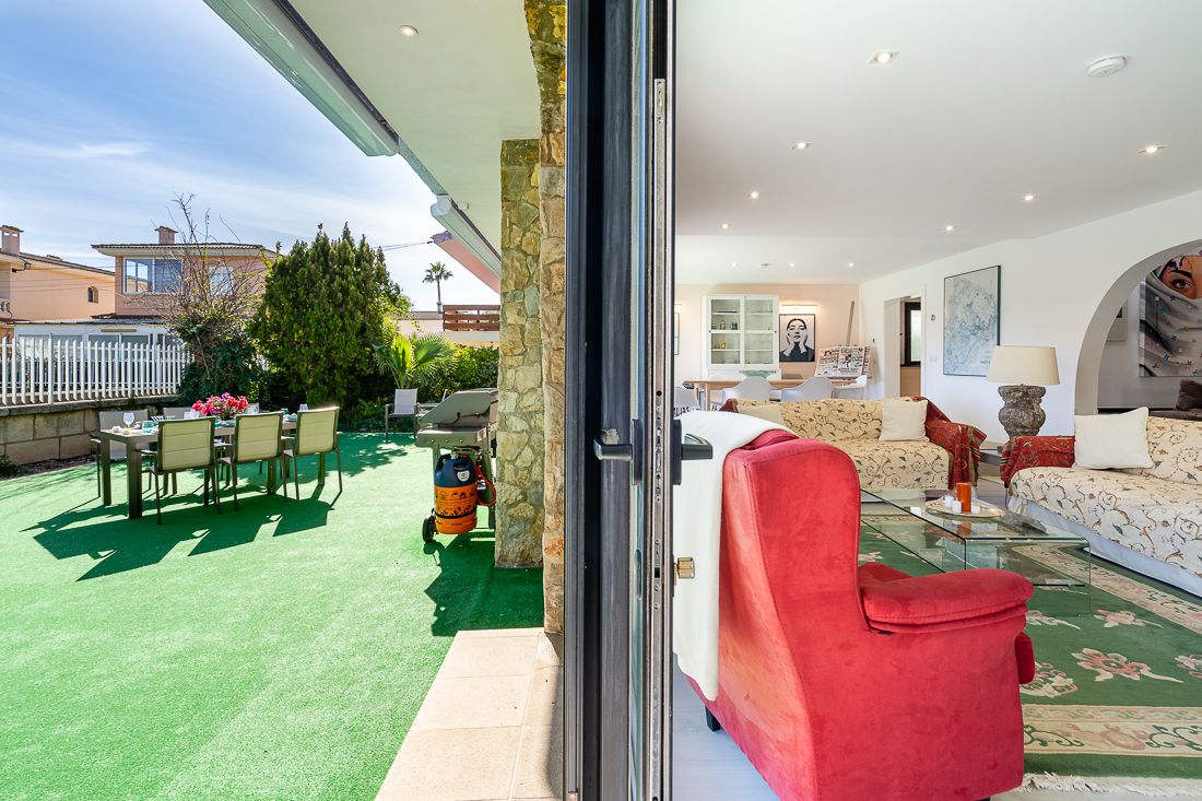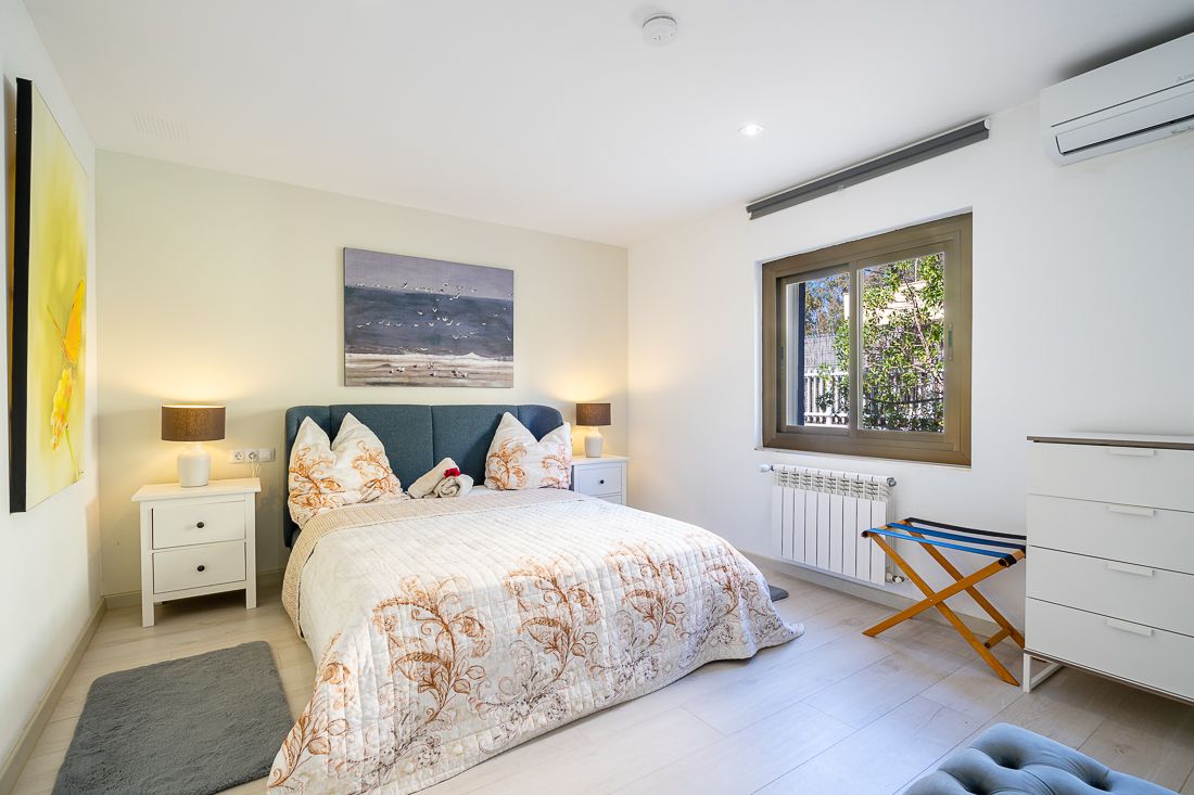 La majoria dels dormitoris estan a la planta baixa: tres dormitoris, un d'ells amb bany en suite, així com un altre bany addicional. En entrar a la casa, a mà esquerra s'obre una àmplia i lluminosa sala d'estar i menjador amb una moderna cuina adjacent. Les portes corredisses de finestra de pis a sostre asseguren un ambient lluminós i acollidor. Un antic pati interior ha estat elegantment transformat en un acollidor saló.