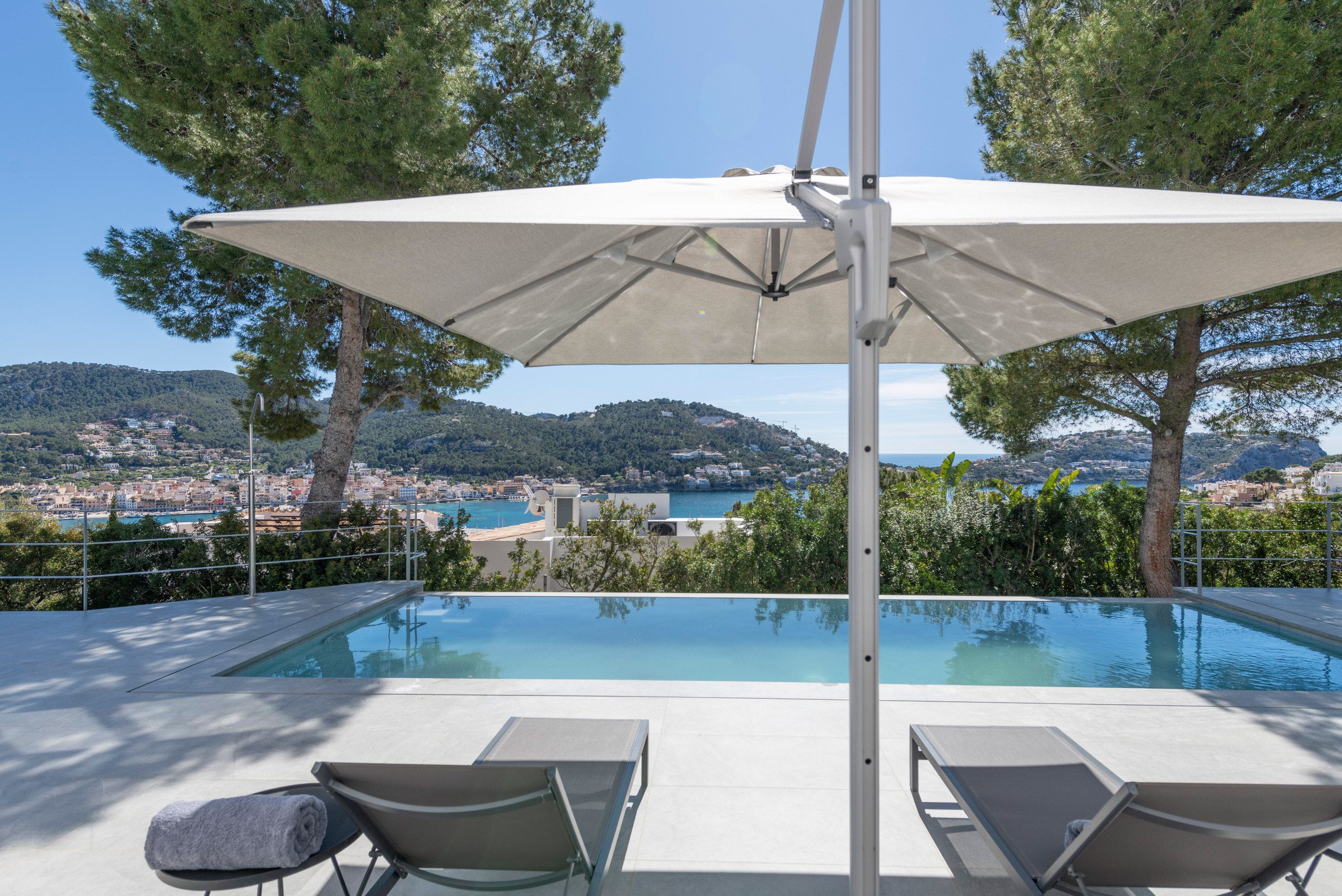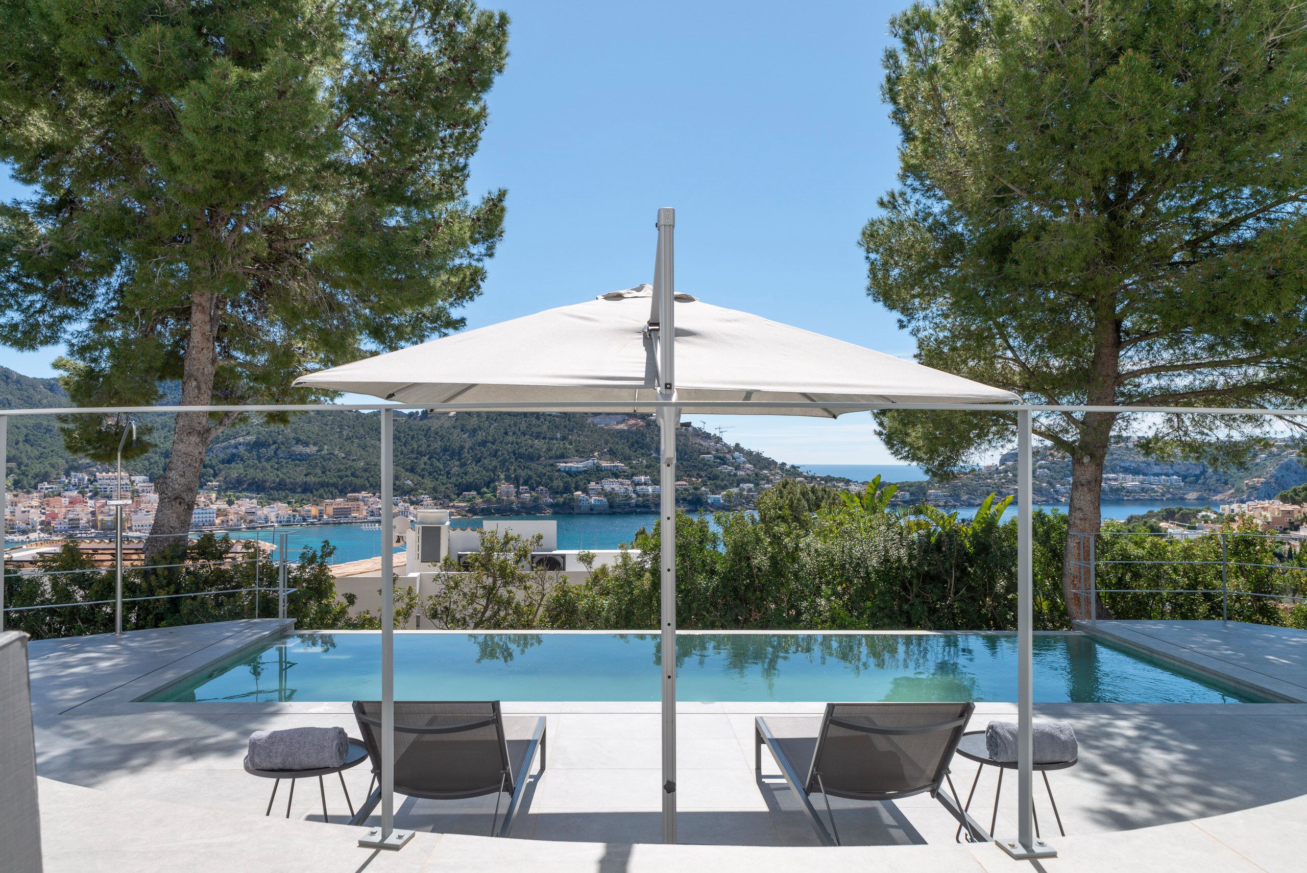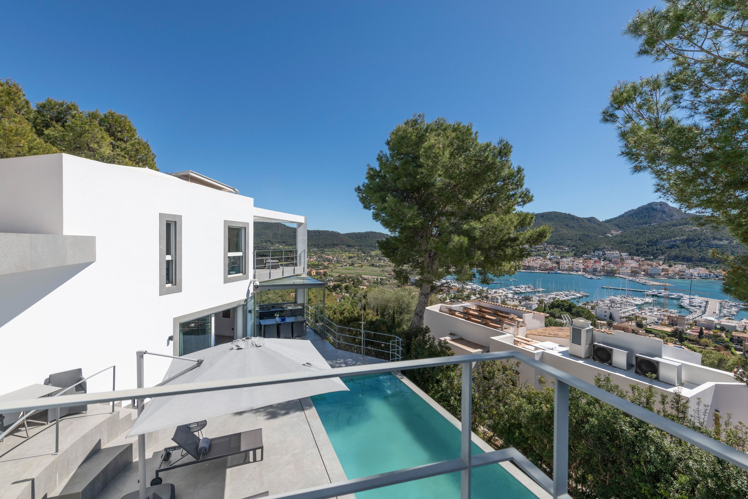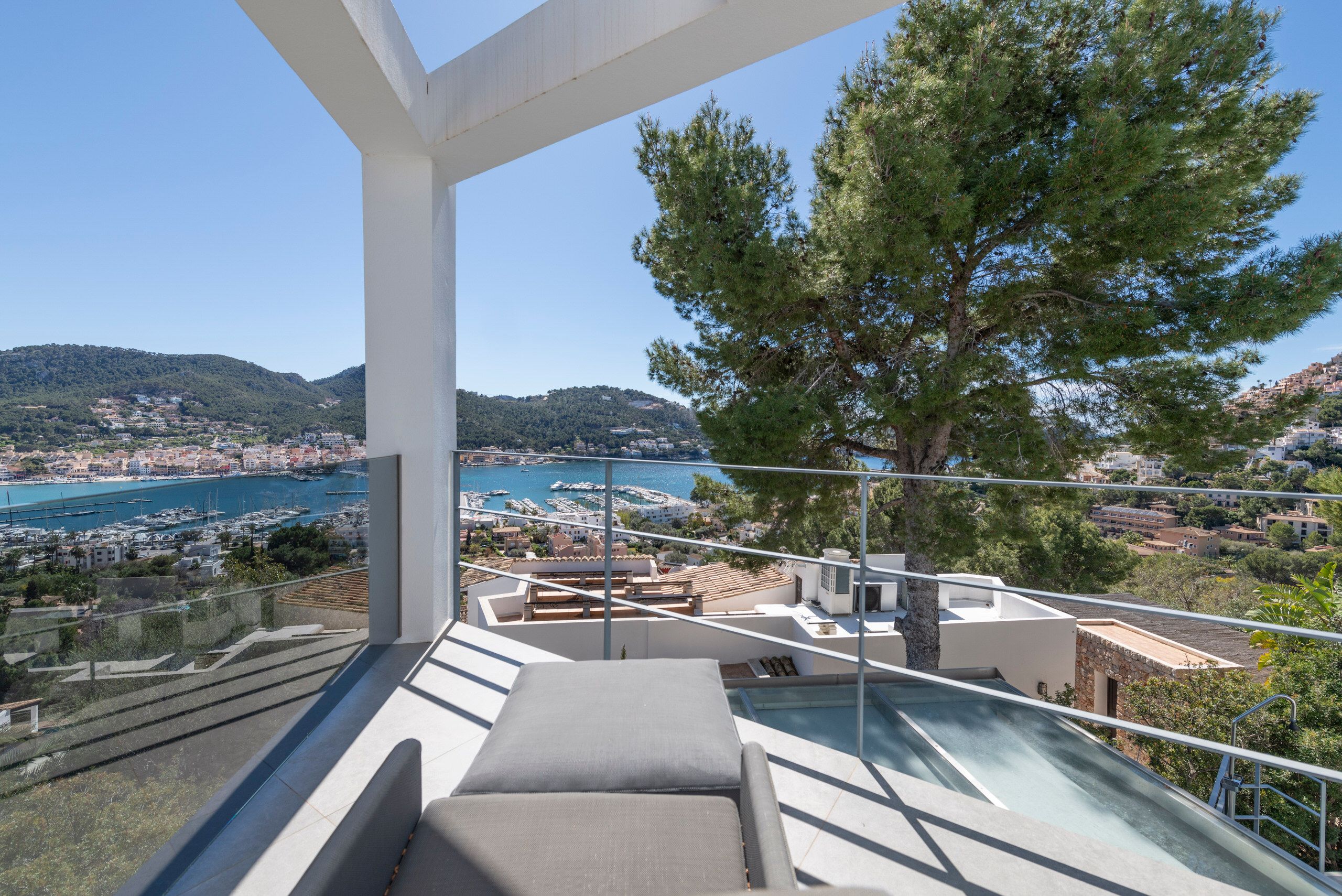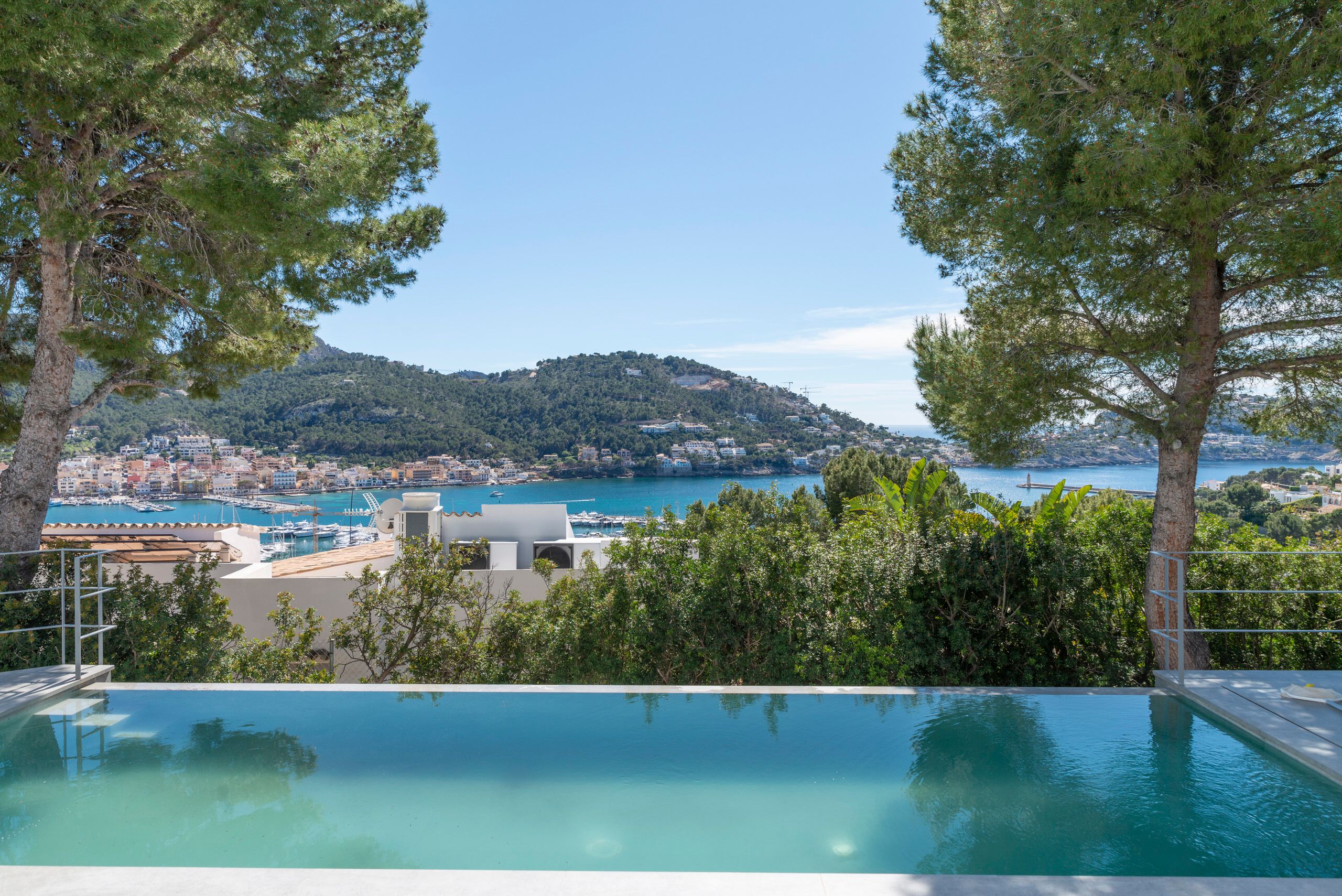Aquesta vila de disseny a Port Andratx es troba en un vessant orientat al sud per sobre del Club de Vela i ofereix meravelloses vistes al port. A la planta baixa hi ha un ampli saló amb xemeneia, una cuina oberta amb accés al menjador a l'hivernacle i una cuina a l'aire lliure, dos dormitoris amb banys en suite, una neteja i una zona de piscina amb terrassa i zona d'estar coberta. A la planta superior es troba la zona principal amb un ampli dormitori, bany en suite, vestidor i terrassa privada amb vistes al mar. Dos dormitoris més, cadascun amb la seva pròpia cambra de bany, completen aquesta planta. Al soterrani hi ha una sala de fitness, una sauna, un safareig i un traster. Aquesta casa ofereix totes les comoditats per a una vida còmoda i moderna en una de les zones més cobejades de Mallorca. El club nàutic i el costat de Port d'Andratx amb tendes, bars i restaurants estan a poca distància. La ubicació ofereix total privacitat i vistes parcials al port d'Andratx i al mar.