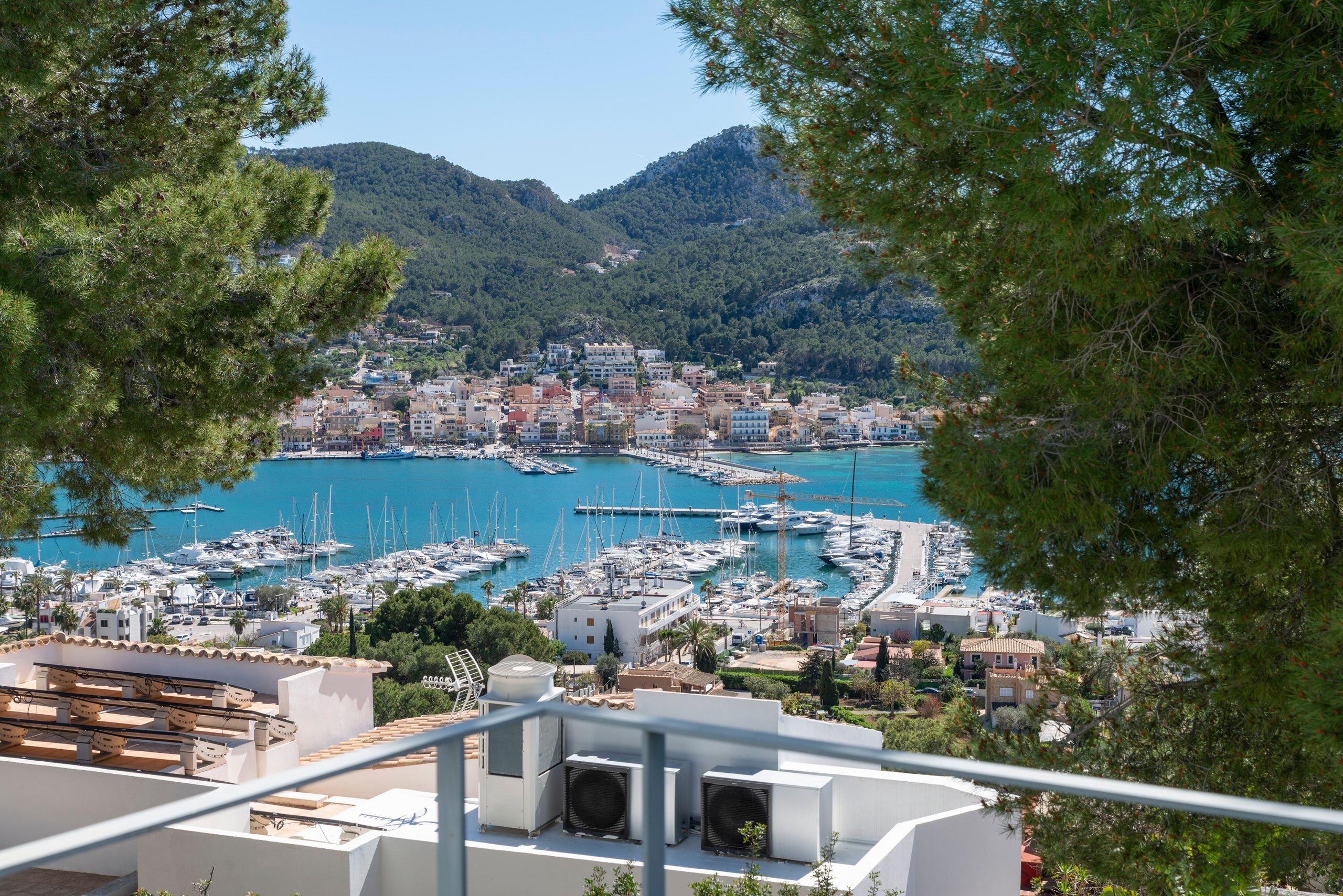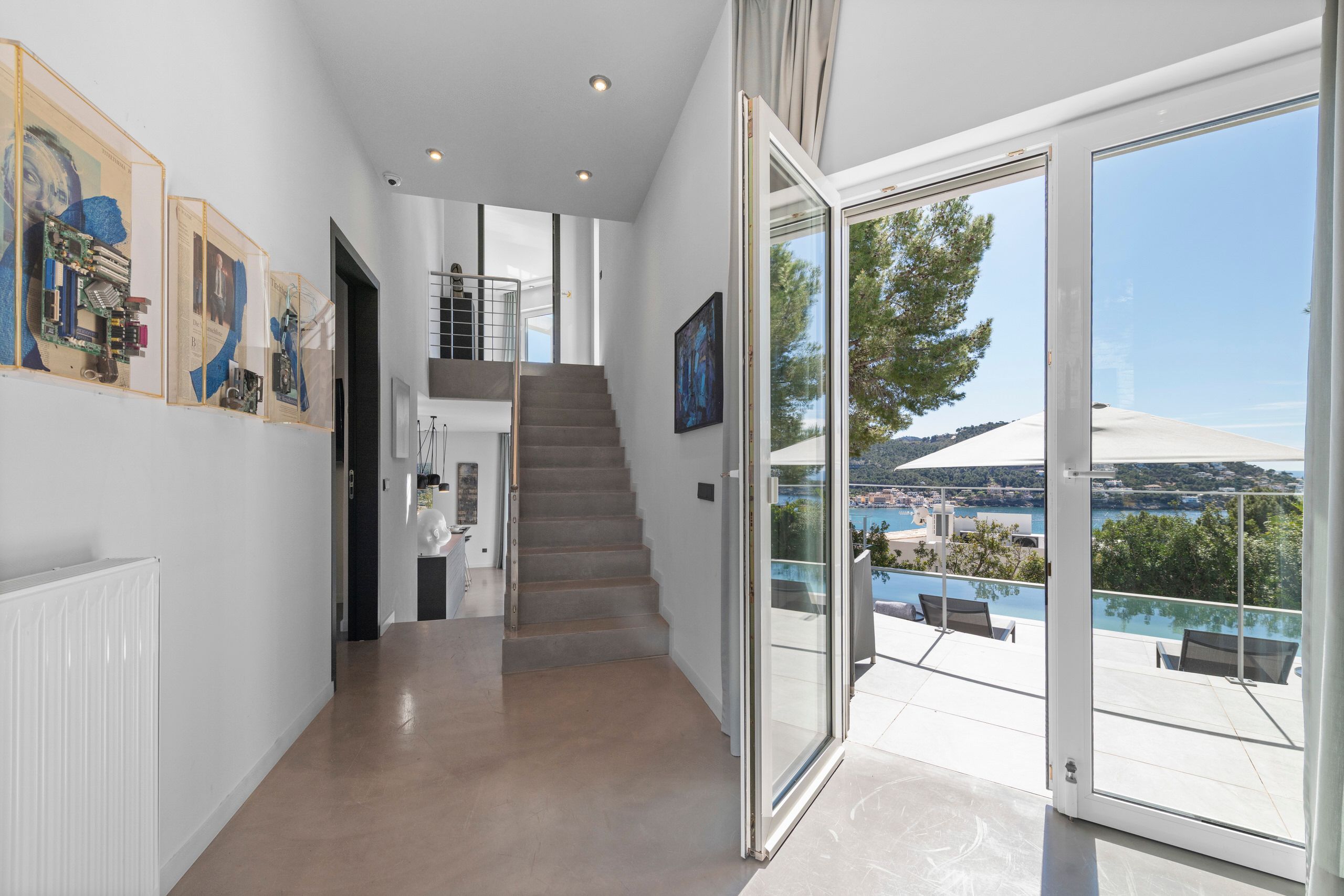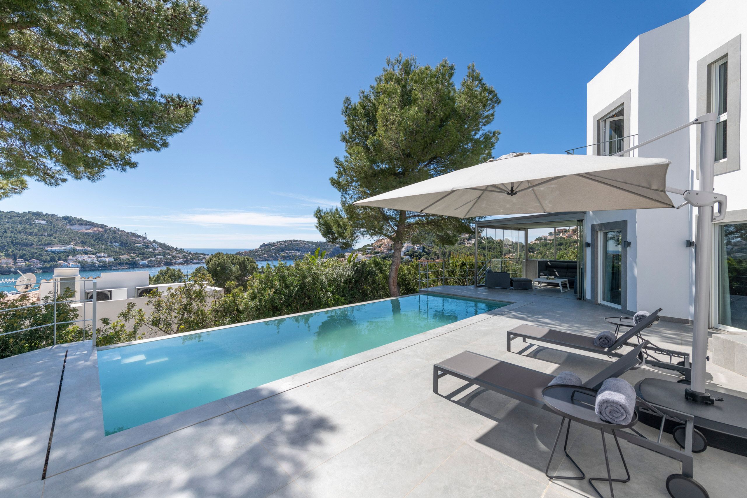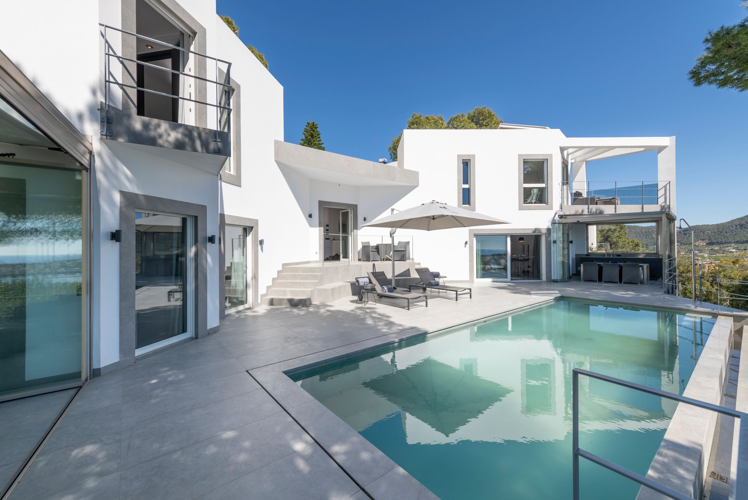 Aquesta vila de disseny a Port Andratx es troba en un vessant orientat al sud per sobre del Club de Vela i ofereix meravelloses vistes al port. A la planta baixa hi ha un ampli saló amb xemeneia, una cuina oberta amb accés al menjador a l'hivernacle i una cuina a l'aire lliure, dos dormitoris amb banys en suite, una neteja i una zona de piscina amb terrassa i zona d'estar coberta. A la planta superior es troba la zona principal amb un ampli dormitori, bany en suite, vestidor i terrassa privada amb vistes al mar. Dos dormitoris més, cadascun amb la seva pròpia cambra de bany, completen aquesta planta. Al soterrani hi ha una sala de fitness, una sauna, un safareig i un traster. Aquesta casa ofereix totes les comoditats per a una vida còmoda i moderna en una de les zones més cobejades de Mallorca. El club nàutic i el costat de Port d'Andratx amb tendes, bars i restaurants estan a poca distància. La ubicació ofereix total privacitat i vistes parcials al port d'Andratx i al mar.