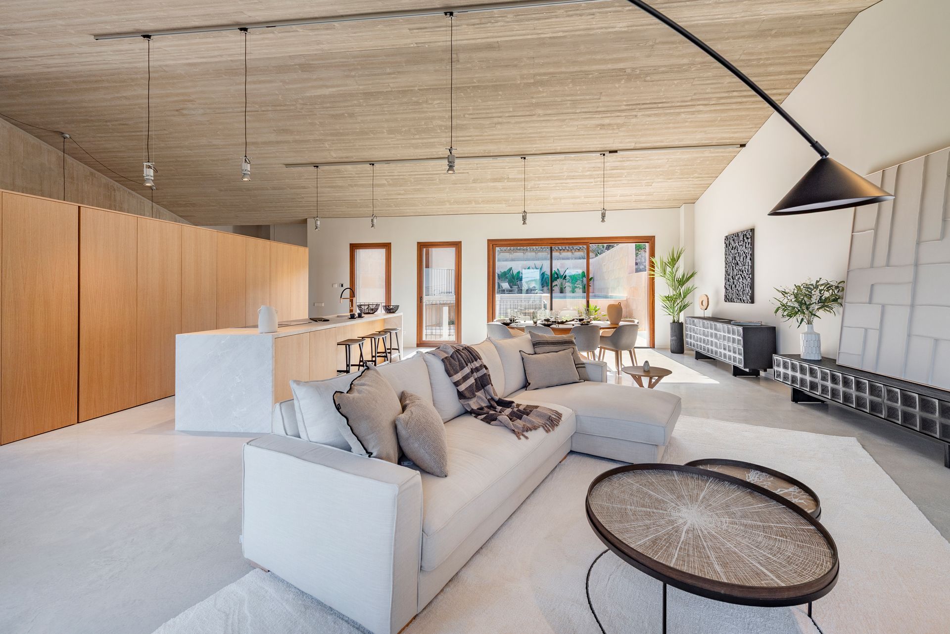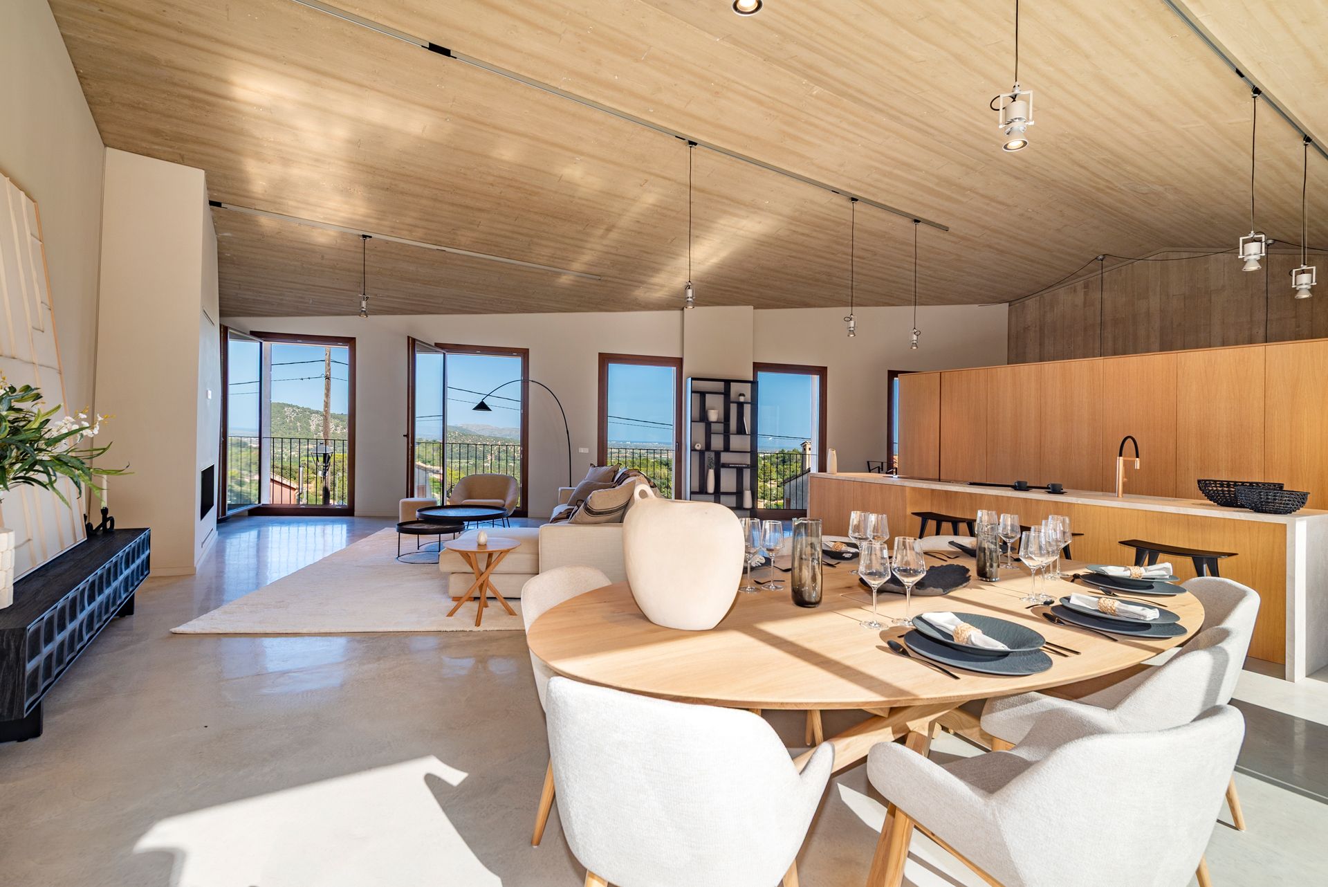 La segona, la de dia, és un ampli i lluminós espai obert, on la cuina es fusiona amb el saló, gaudint d'unes vistes espectaculars gràcies als seus grans finestrals. A més, es distingeix pels seus sostres alts amb bigues de fusta vista, que realcen el caràcter mallorquí i aporten calidesa a l'ambient. Aquest espai diàfan i acollidor convida a la convivència i al gaudiment.