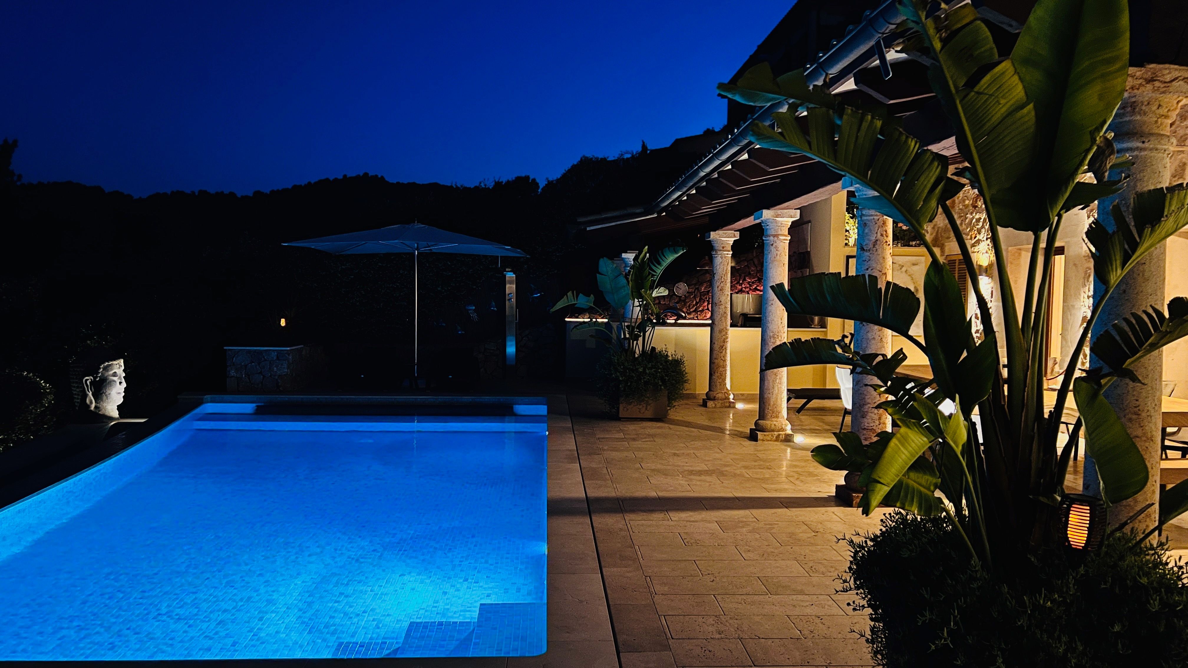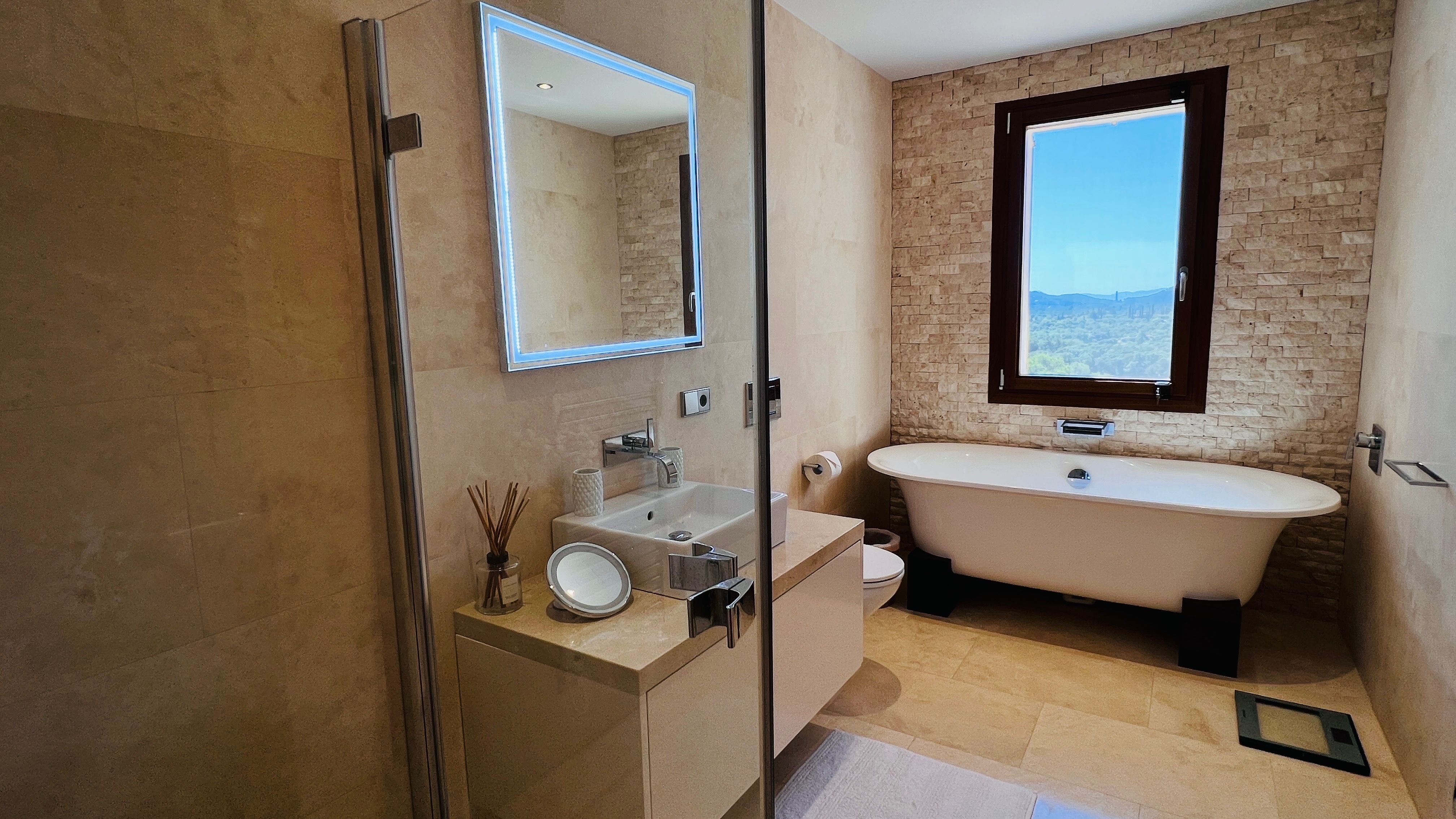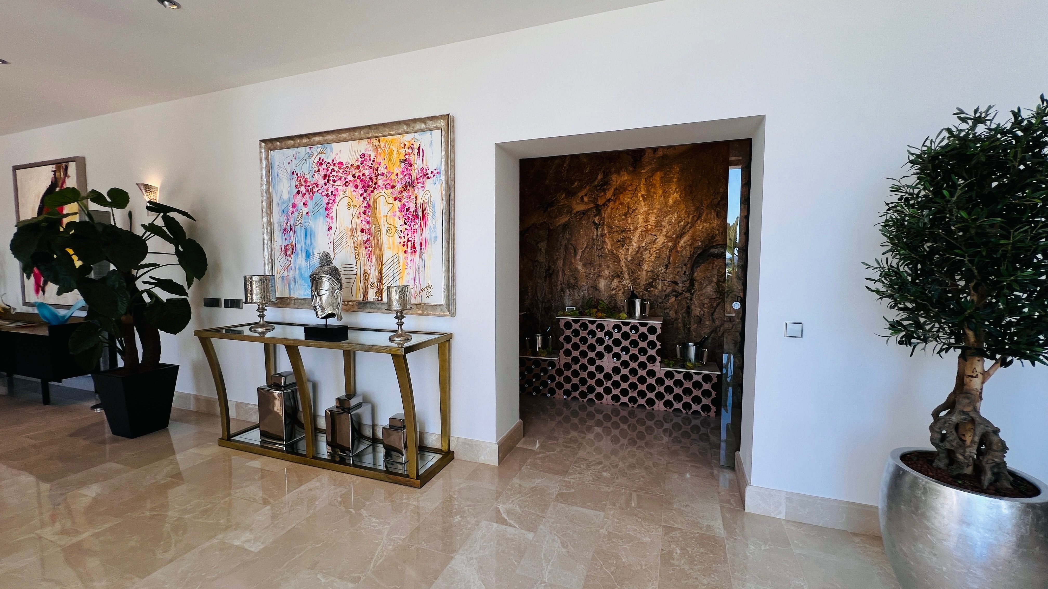 La zona exterior és igualment impressionant, amb una piscina infinity climatitzada (5 x 10 m) equipada amb bomba de calor i coberta elèctrica, envoltada d'àmplies terrasses amb vistes espectaculars. A més, compta amb una exclusiva zona wellness amb bany turc i jacuzzi, convertint la propietat en un autèntic oasi privat.