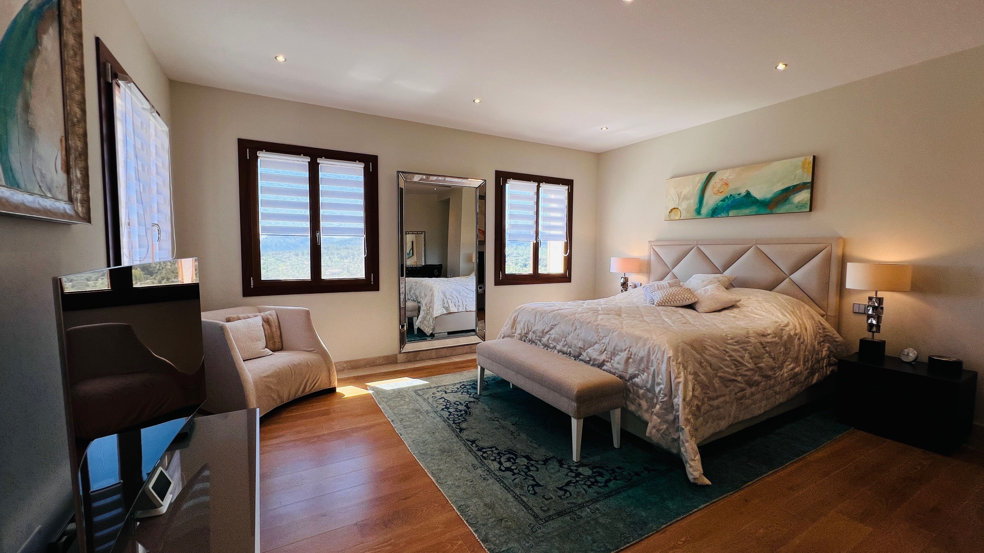 Situada en una posició privilegiada —a només un minut del camp de golf, tres minuts de Pollensa i aproximadament deu minuts de la platja de sorra de Port Pollensa— aquesta propietat excepcional combina una construcció d'última generació amb materials de primera qualitat i un disseny sofisticat.