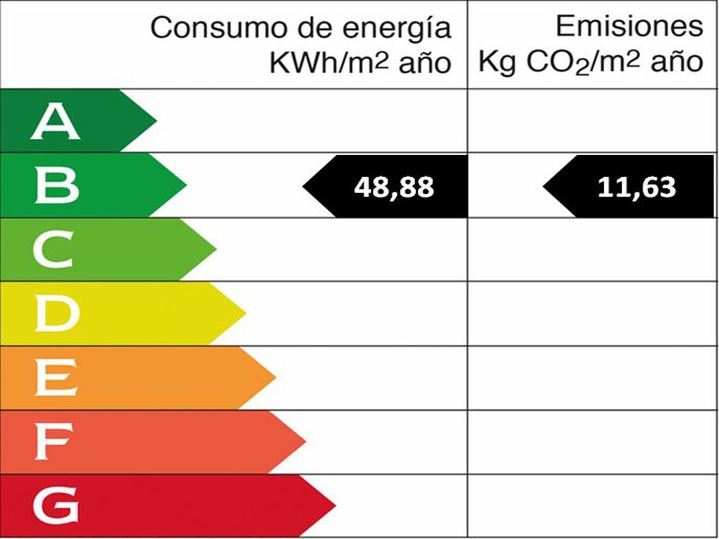 Any de construcció: 2022 • Valor de consum energètic: 48.88 kWh/(m2*a) • Emissions CO2: 11.63 kg/m2 • Escala de Emissions de CO2: B • Tipus de calefacció: Bomba de calor • Classe d'eficiència energètica: B