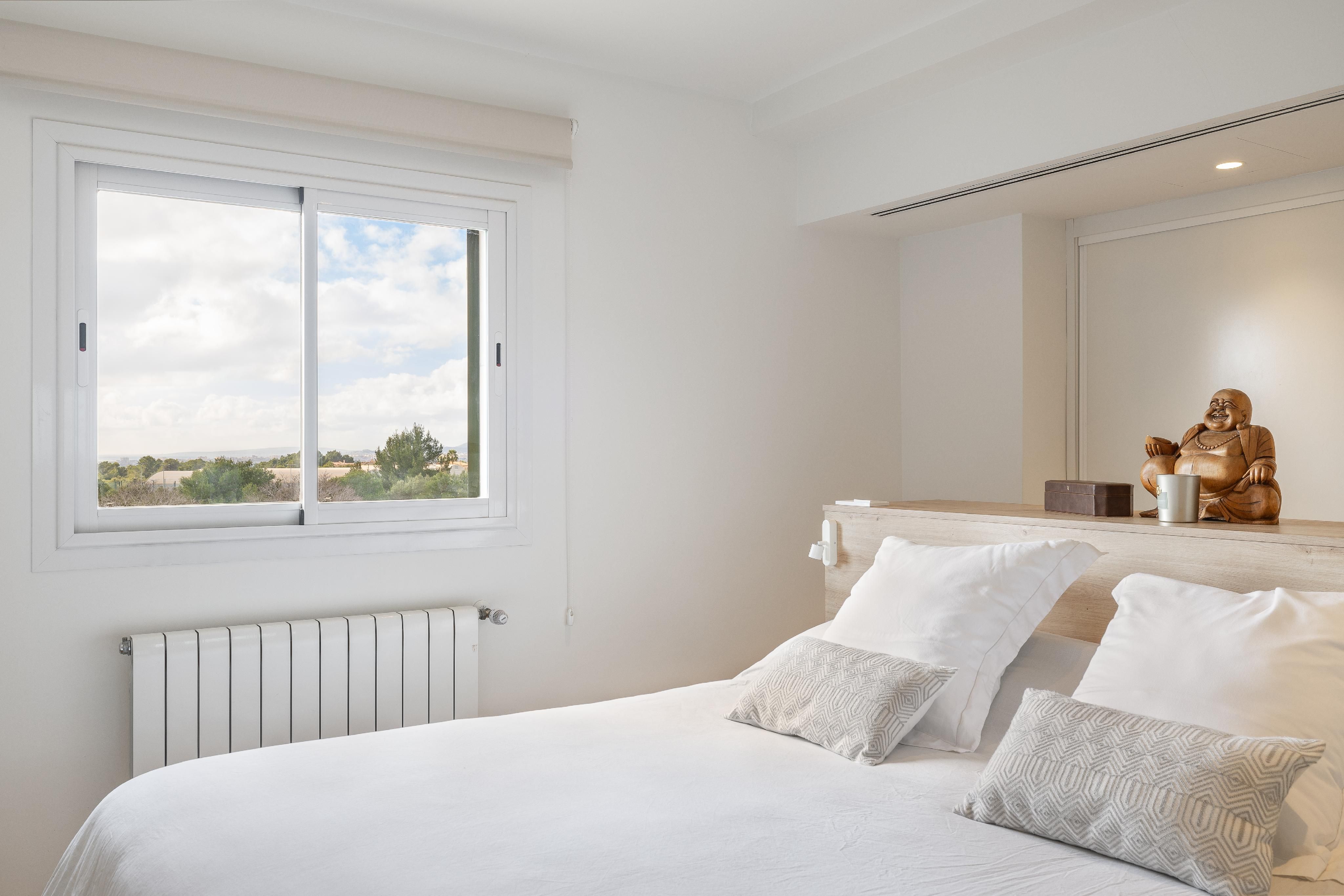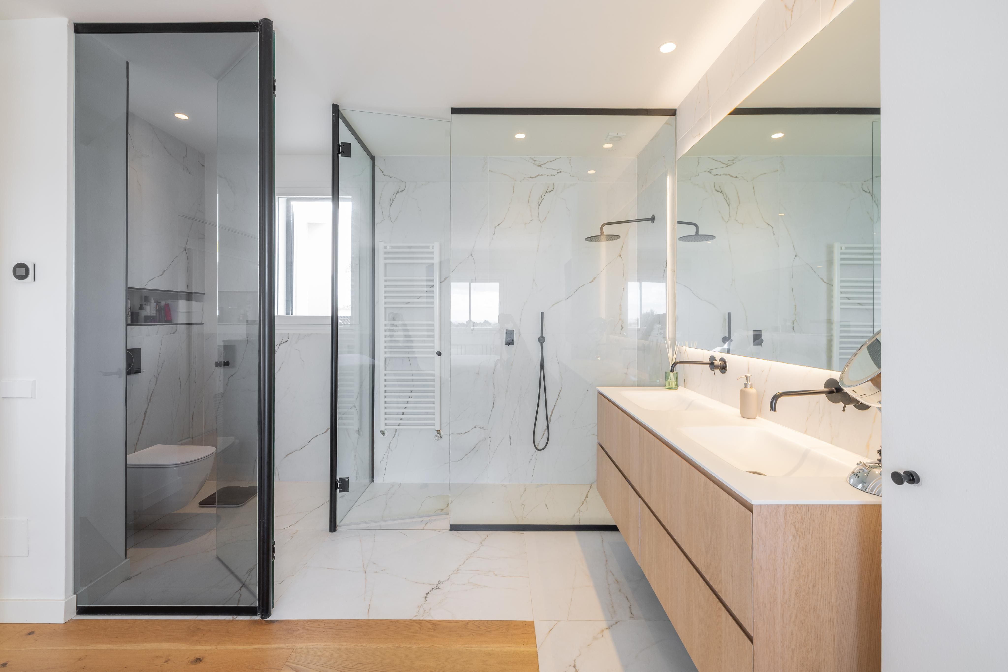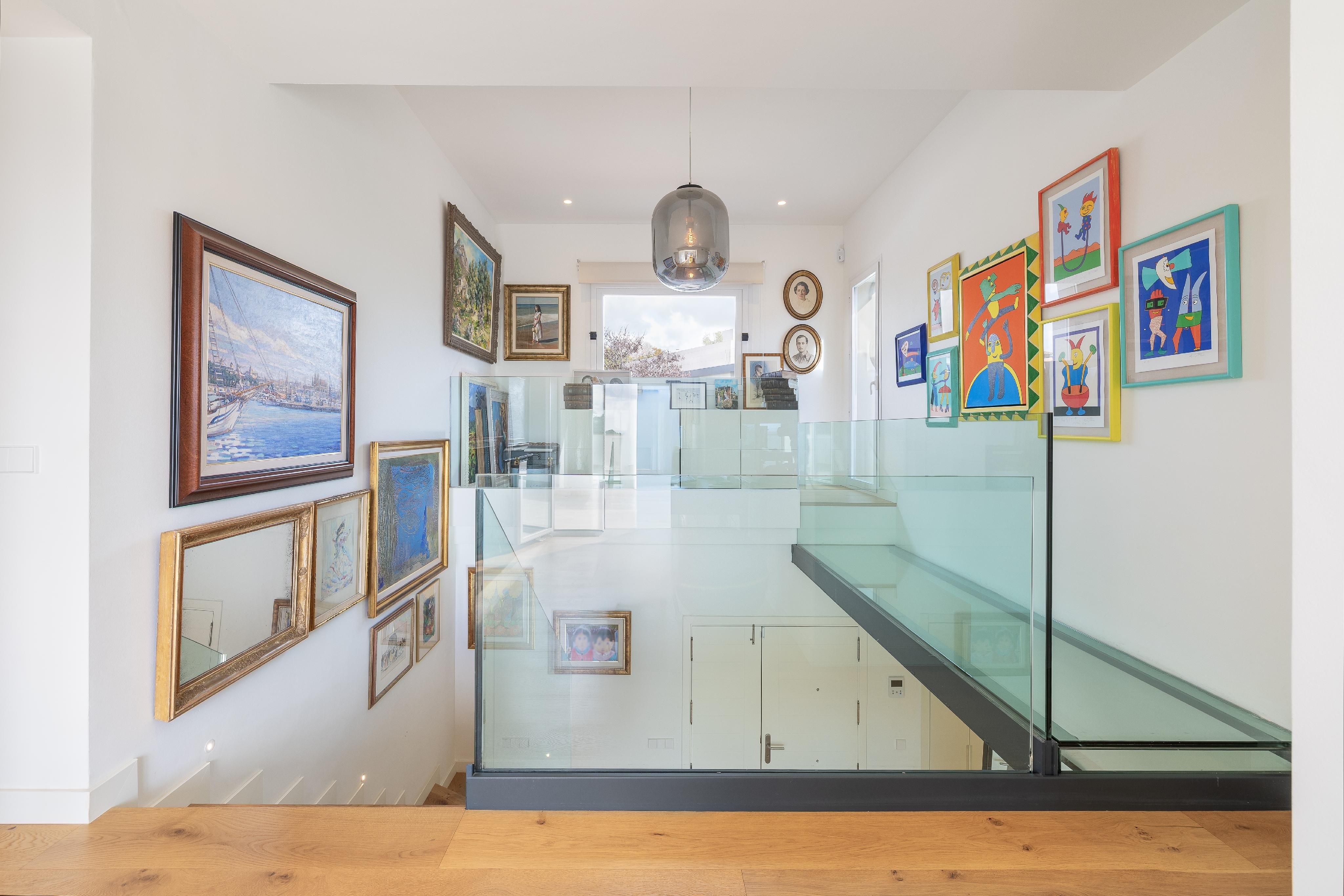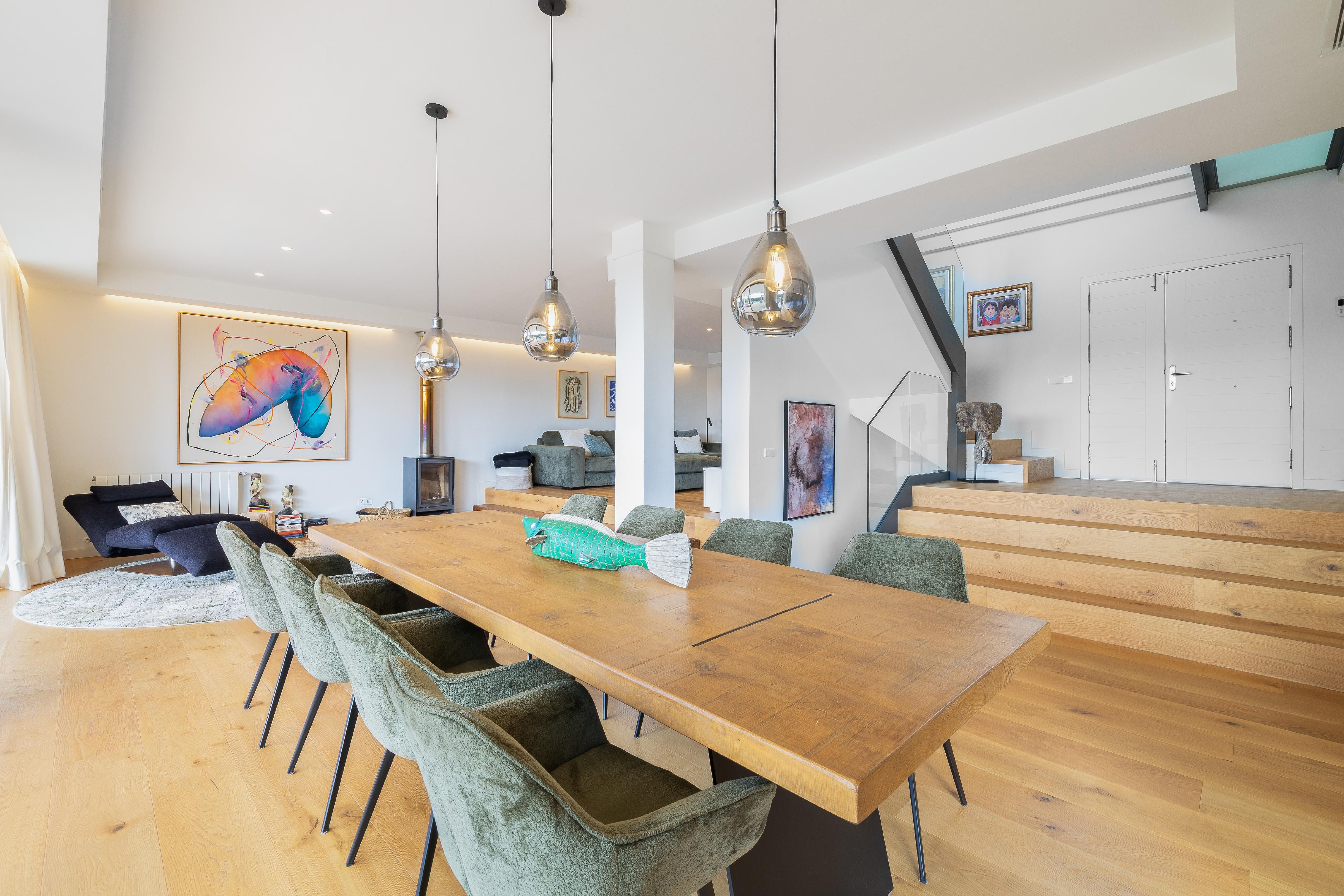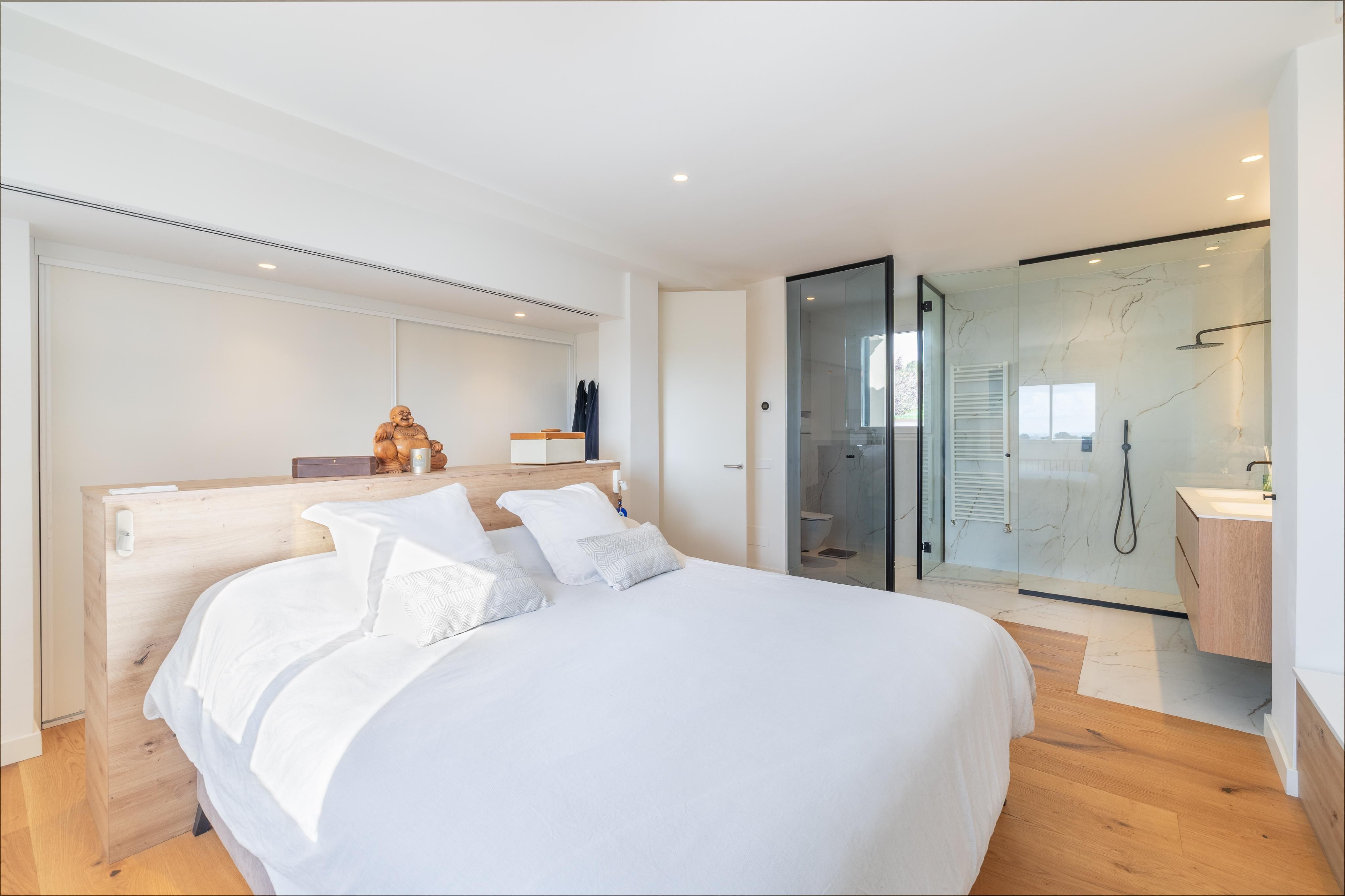 A la planta baixa es distribueix la zona de dia, que inclou un primer dormitori molt pràctic amb bany complet. El saló menjador, de concepte obert, s'integra de forma natural amb una cuina d'estètica moderna que es manté lleugerament independent però connectada visualment. La planta superior està dedicada al descans i alberga l'habitació principal amb bany en suite, a més d'altres dos dormitoris que comparteixen un bany complet. Des d'aquest nivell es pot gaudir de vistes panoràmiques a la badia de Palma. Tots els espais interiors destaquen per la seva lluminositat i una distribució equilibrada.