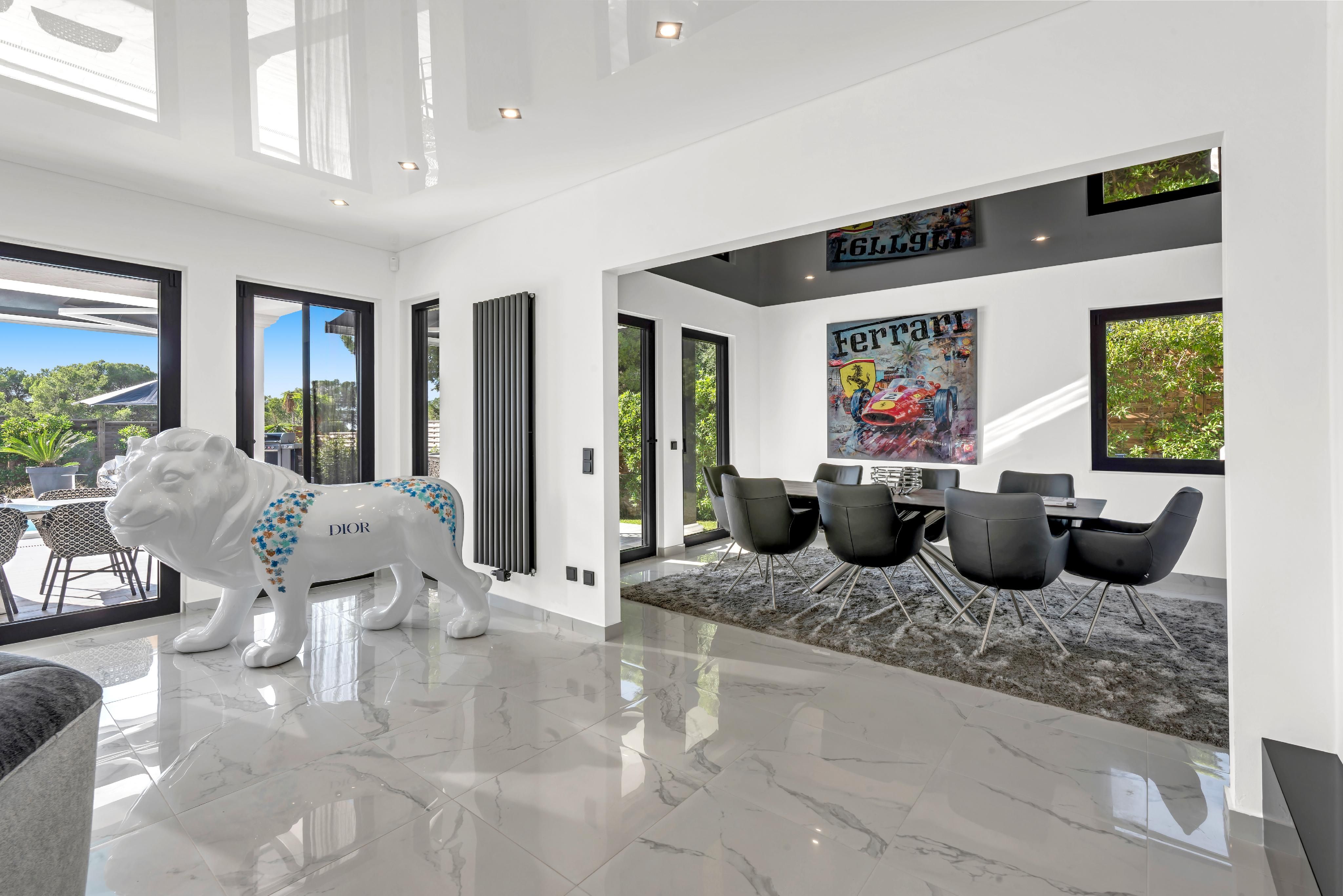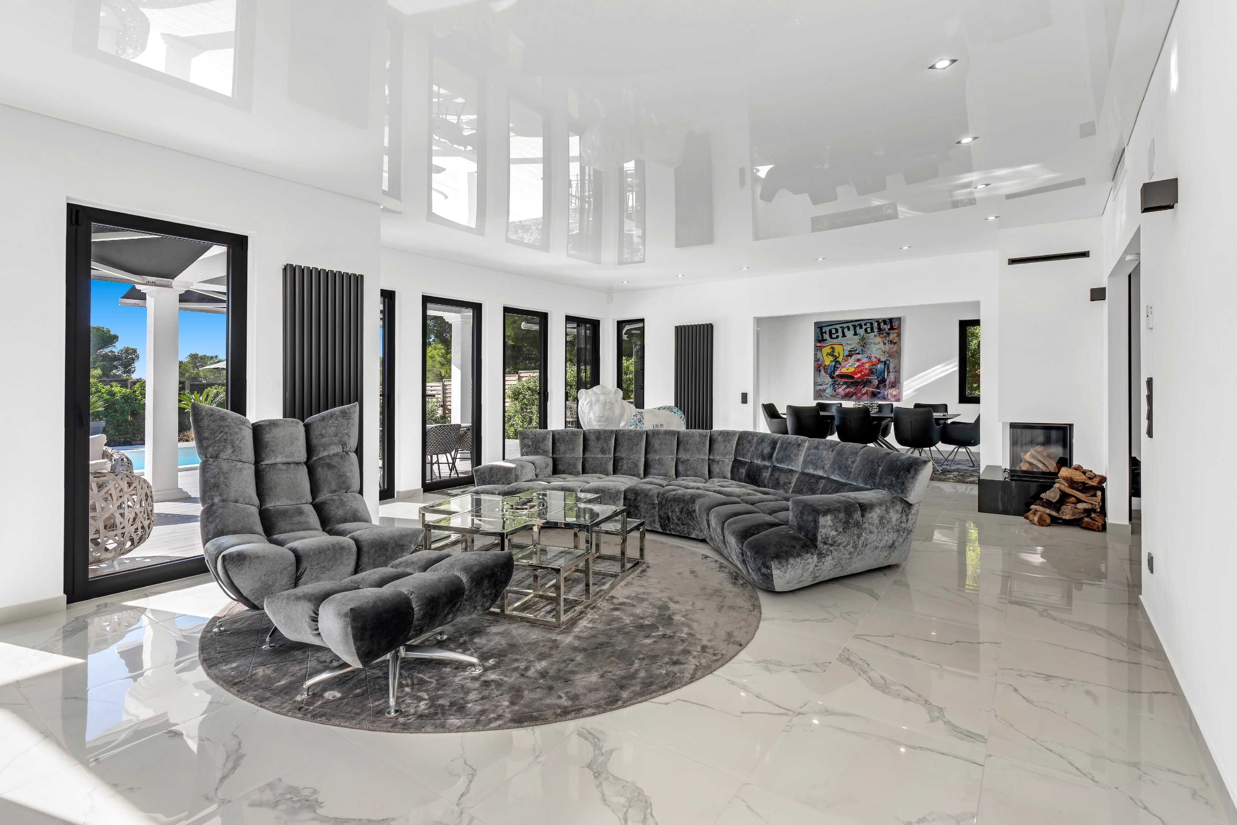 Aquesta exclusiva vila independent, completament renovada en 2023, combina a la perfecció l'elegància moderna, l'encant mediterrani i el màxim confort en cada detall. La propietat ofereix amplis espais interiors, una privacitat excepcional i un estil de vida relaxat en una de les zones residencials més sol·licitades de Santa Ponsa. La lluminosa zona d'estar i menjador de planta oberta impressiona amb falsos sostres d'alt lluentor, acabats de gran qualitat i amplis finestrals panoràmics que inunden l'interior de llum natural. Això crea una atmosfera sofisticada i alhora acollidora, ideal tant per a la vida diària com per rebre convidats. L'elegant cuina, totalment equipada amb electrodomèstics de primera qualitat, s'integra a la perfecció en la zona d'estar i es converteix en el cor de la casa per a la creativitat culinària i els moments socials. La vila compta amb quatre amplis dormitoris i tres elegants banys, incloent una luxosa suite principal amb bany en suite, accés a la terrassa i relaxants vistes al jardí. Cada estada ha estat dissenyada amb una meticulosa atenció al confort, la funcionalitat i l'estètica atemporal, oferint un equilibri harmoniós entre disseny contemporani i calidesa. A l'exterior, un jardí bellament enjardinat amb una gran piscina i diverses terrasses convida a relaxar-se, sopar a l'aire lliure o gaudir del sol mallorquí. La parcel·la plana garanteix un ús còmode i accessible, mentre que l'exuberant vegetació mediterrània i les tanques consolidades creen una sensació natural de privacitat i tranquil·litat. Gràcies al nou aïllament tèrmic, la calefacció central amb radiadors i l'aire condicionat (fred/calor), la vila ofereix un confort total durant tot l'any. Altres aspectes destacats inclouen dos garatges, places d'aparcament exteriors addicionals i àmplies zones d'emmagatzematge. Situada en un barri tranquil i consolidat de Santa Ponsa, la propietat es troba a pocs minuts de belles platges, ports esportius, camps de golf i tots els serveis diaris. Una oportunitat única per als qui busquen un habitatge elegant, llista per a entrar a viure, amb privacitat, estil i el millor de l'estil de vida mediterrani.