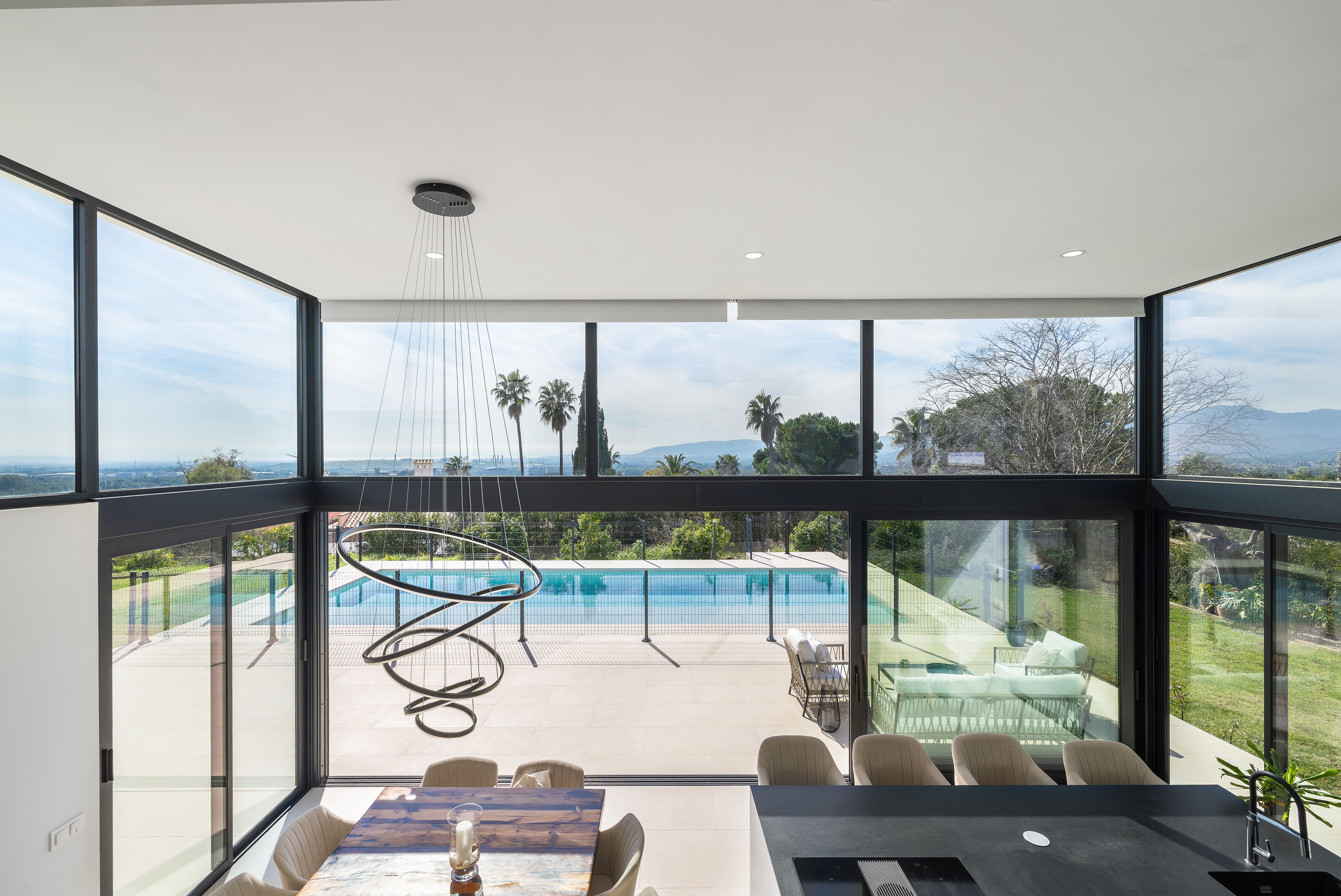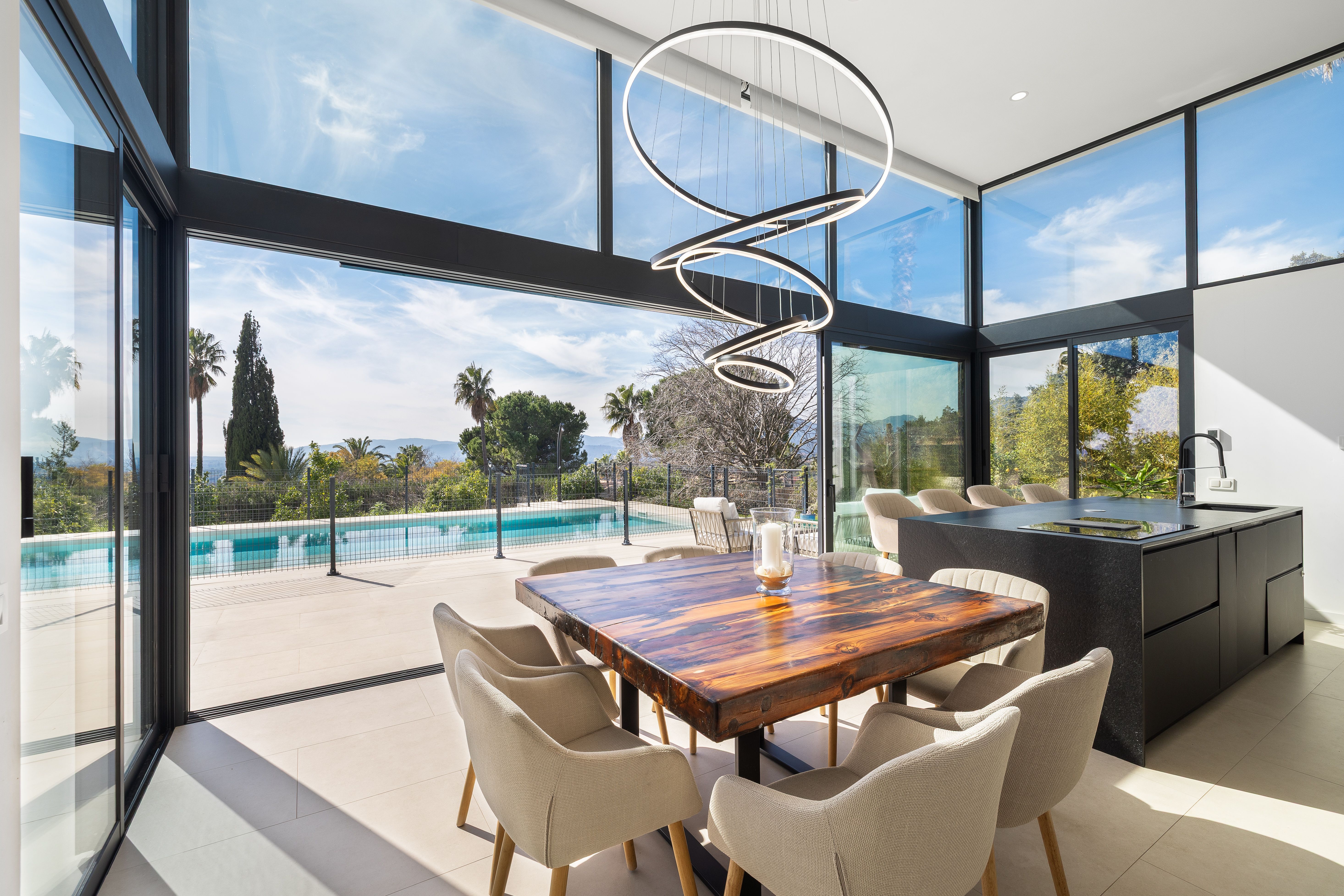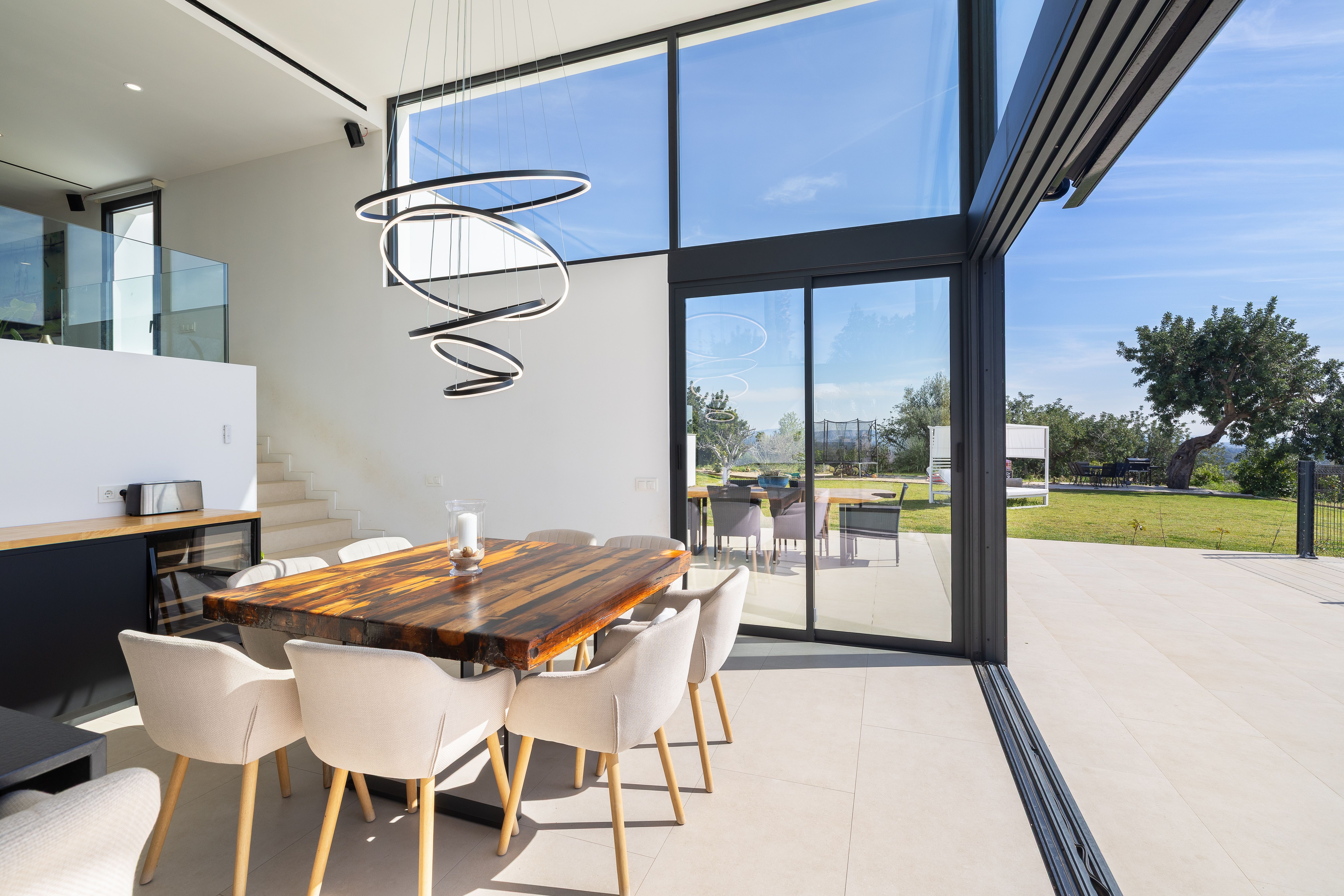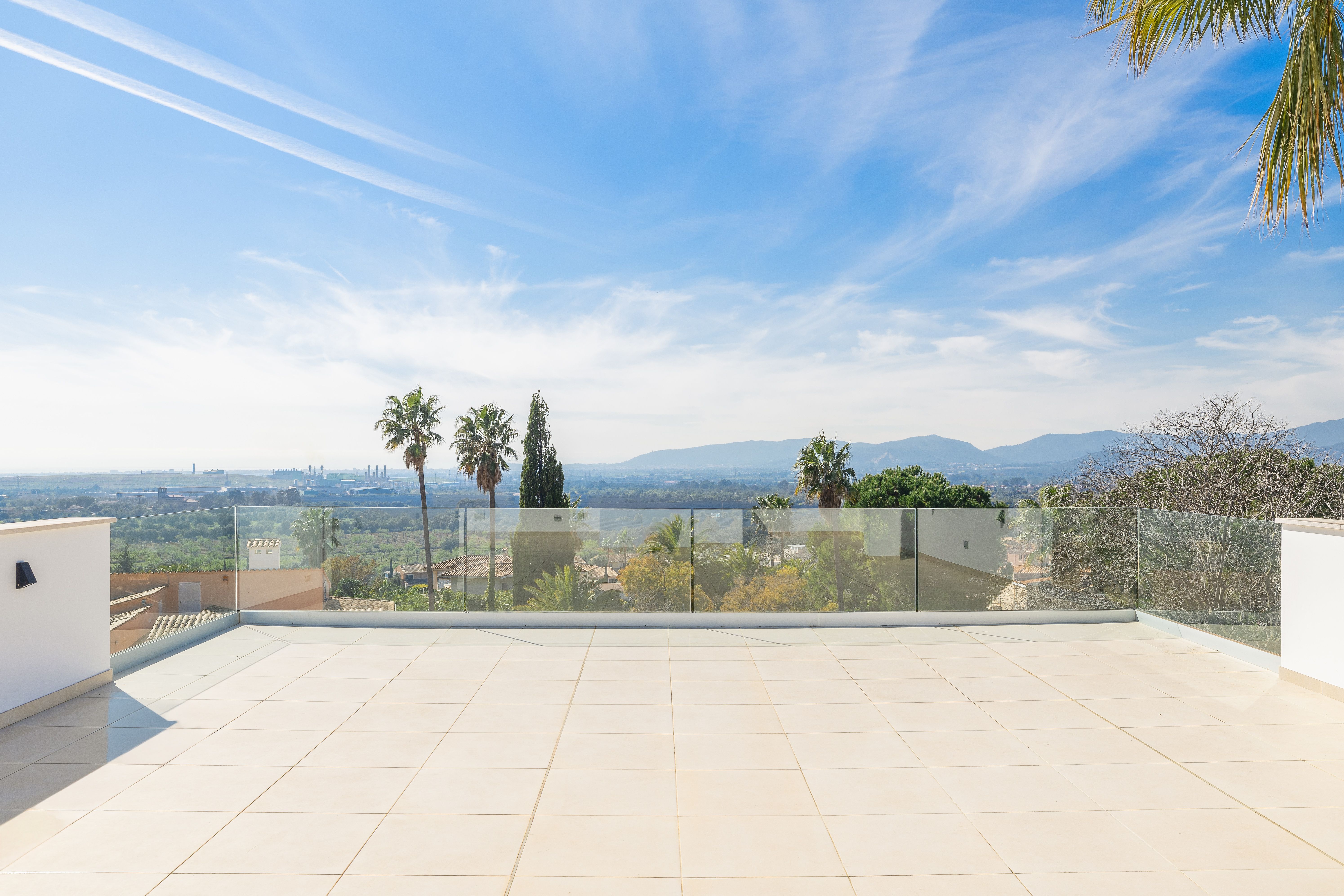 Aquesta vila de nova construcció va ser finalitzada el 2023 i ofereix unes vistes panoràmiques úniques sobre el paisatge fins a arribar a la costa. La casa va ser dissenyada de tal manera que es pot gaudir de les vistes des de totes les estades, sent el punt culminant el saló amb la cuina oberta i el menjador situat en un nivell inferior, que compta amb un enorme front envidrat que garanteix un autèntic efecte .wow La.