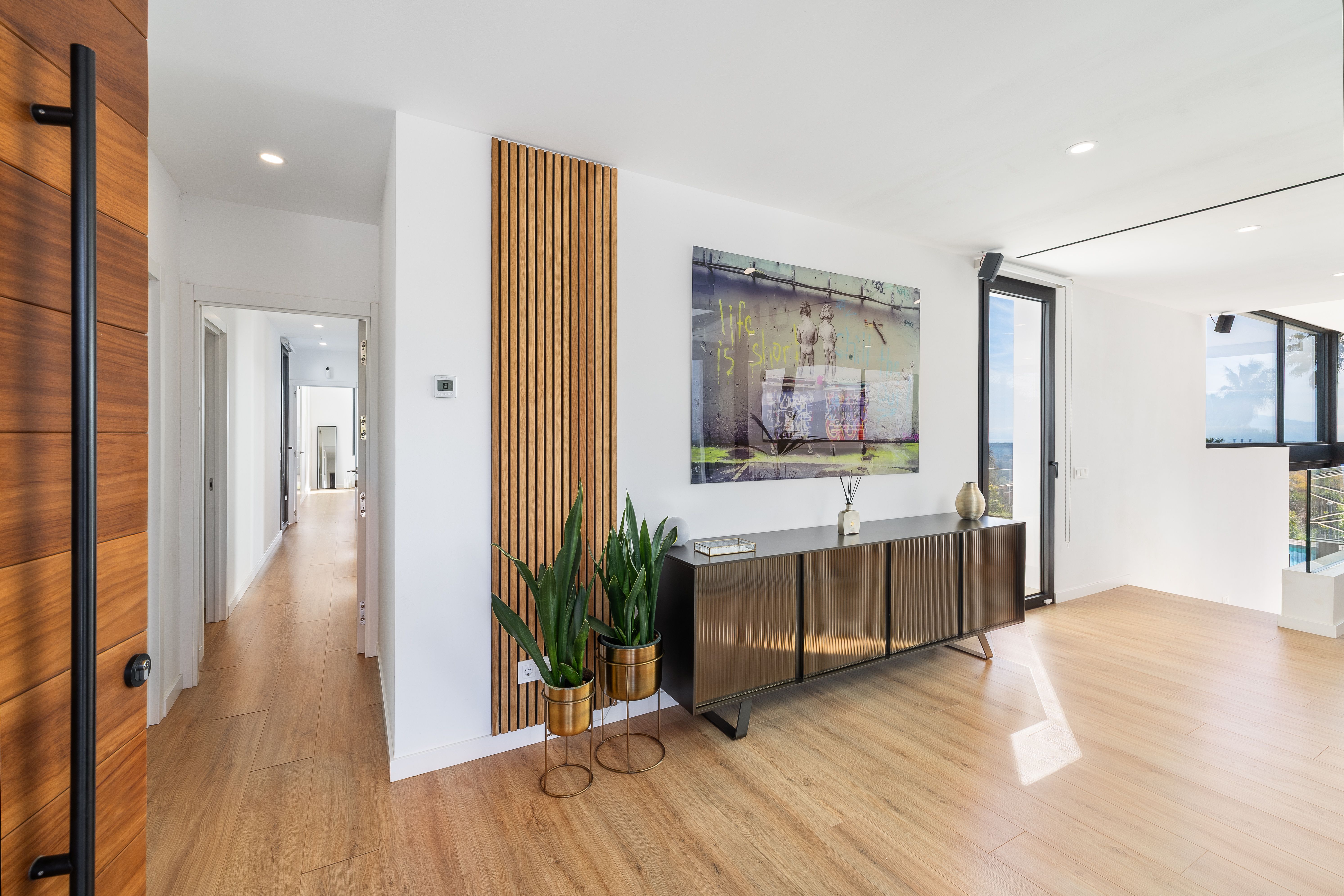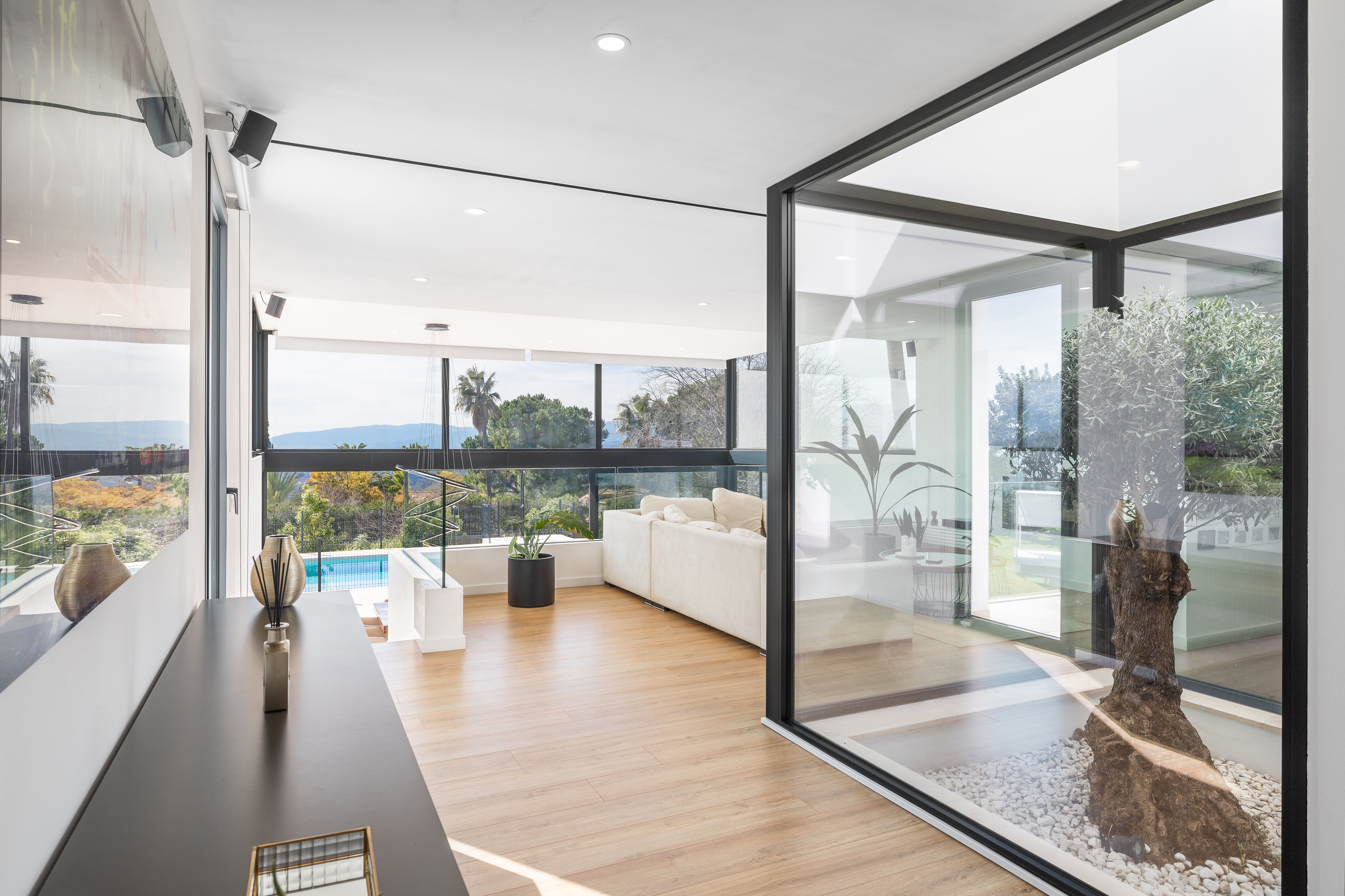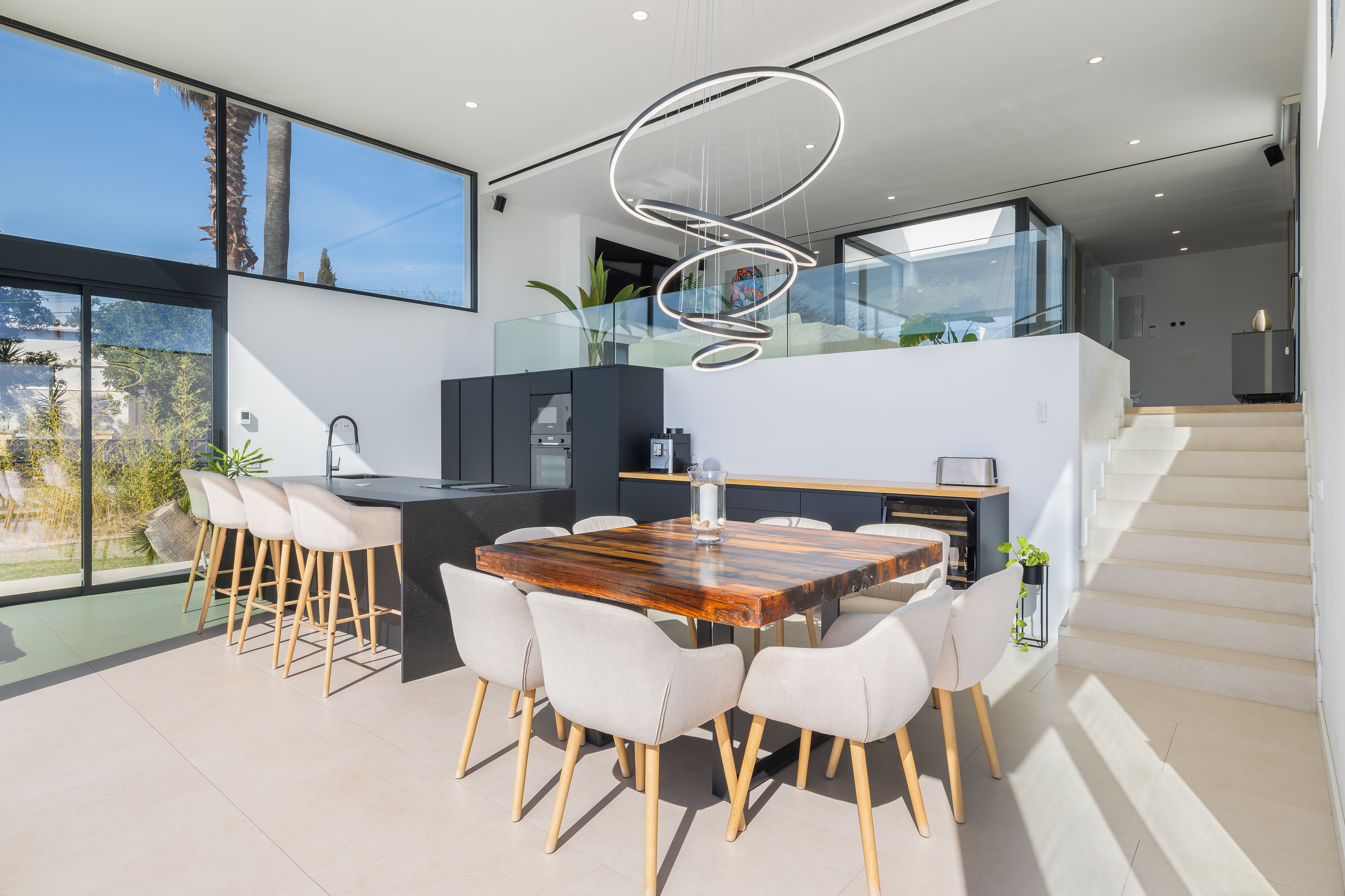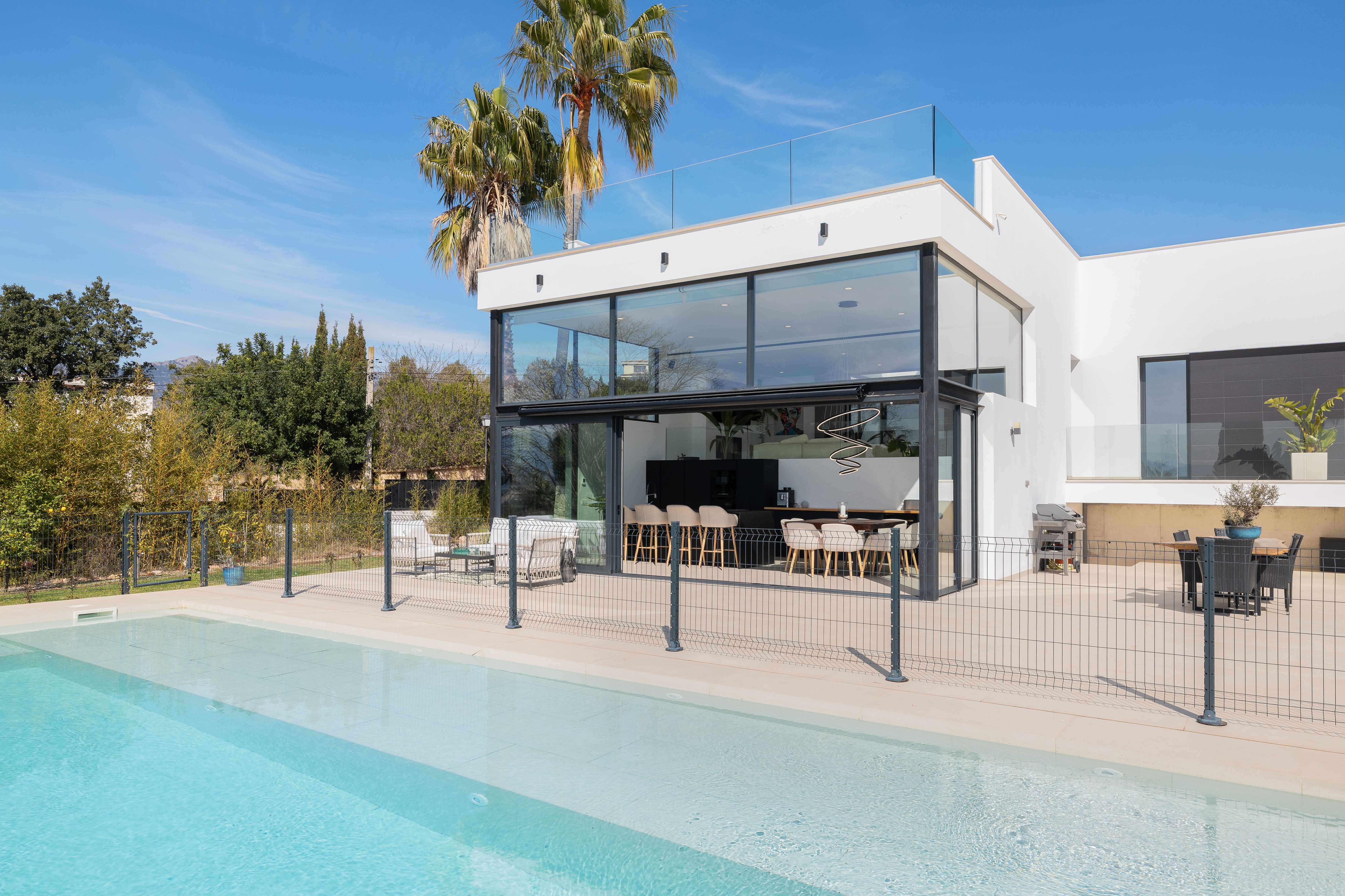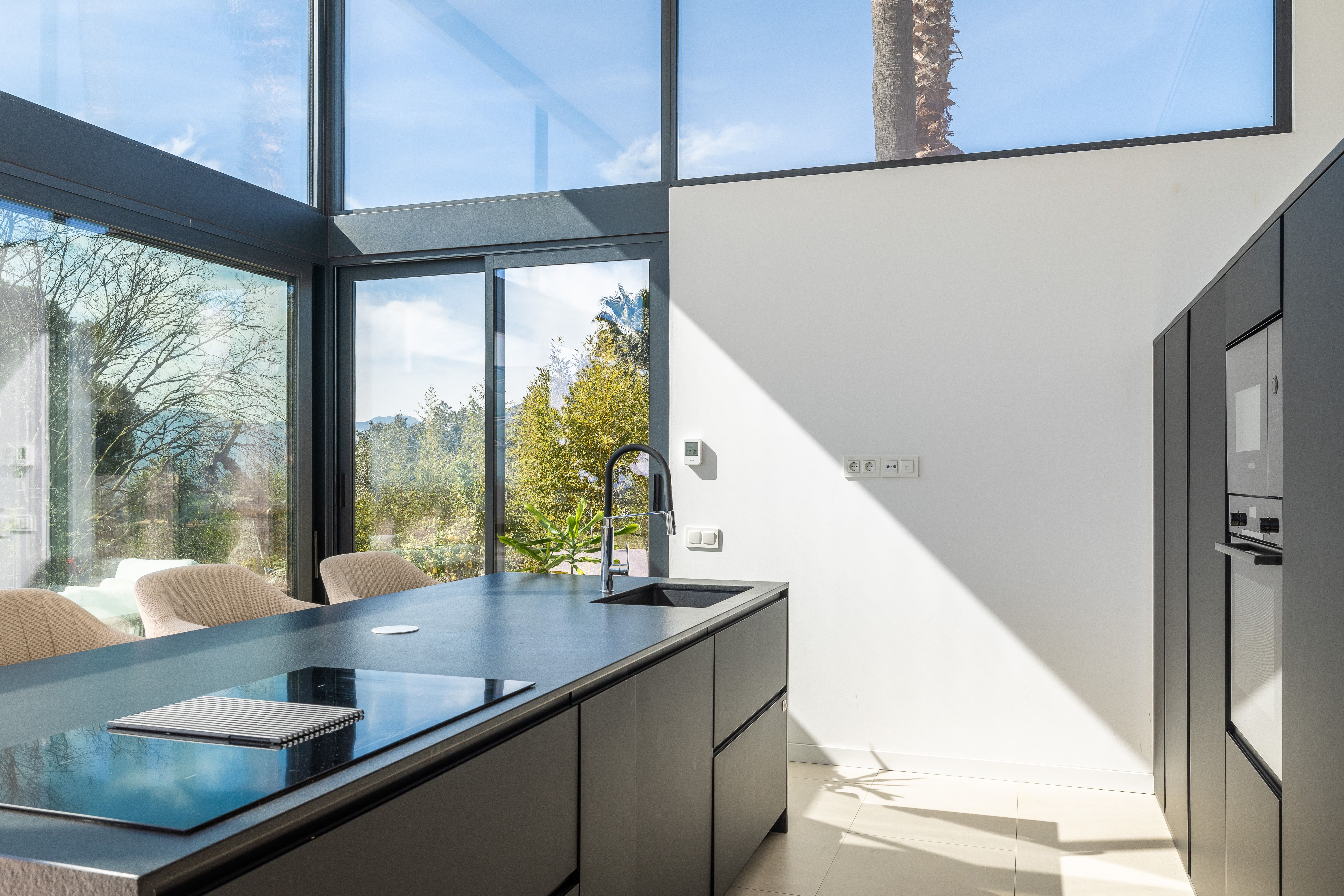 Aquesta vila de nova construcció va ser finalitzada el 2023 i ofereix unes vistes panoràmiques úniques sobre el paisatge fins a arribar a la costa. La casa va ser dissenyada de tal manera que es pot gaudir de les vistes des de totes les estades, sent el punt culminant el saló amb la cuina oberta i el menjador situat en un nivell inferior, que compta amb un enorme front envidrat que garanteix un autèntic efecte .wow La.