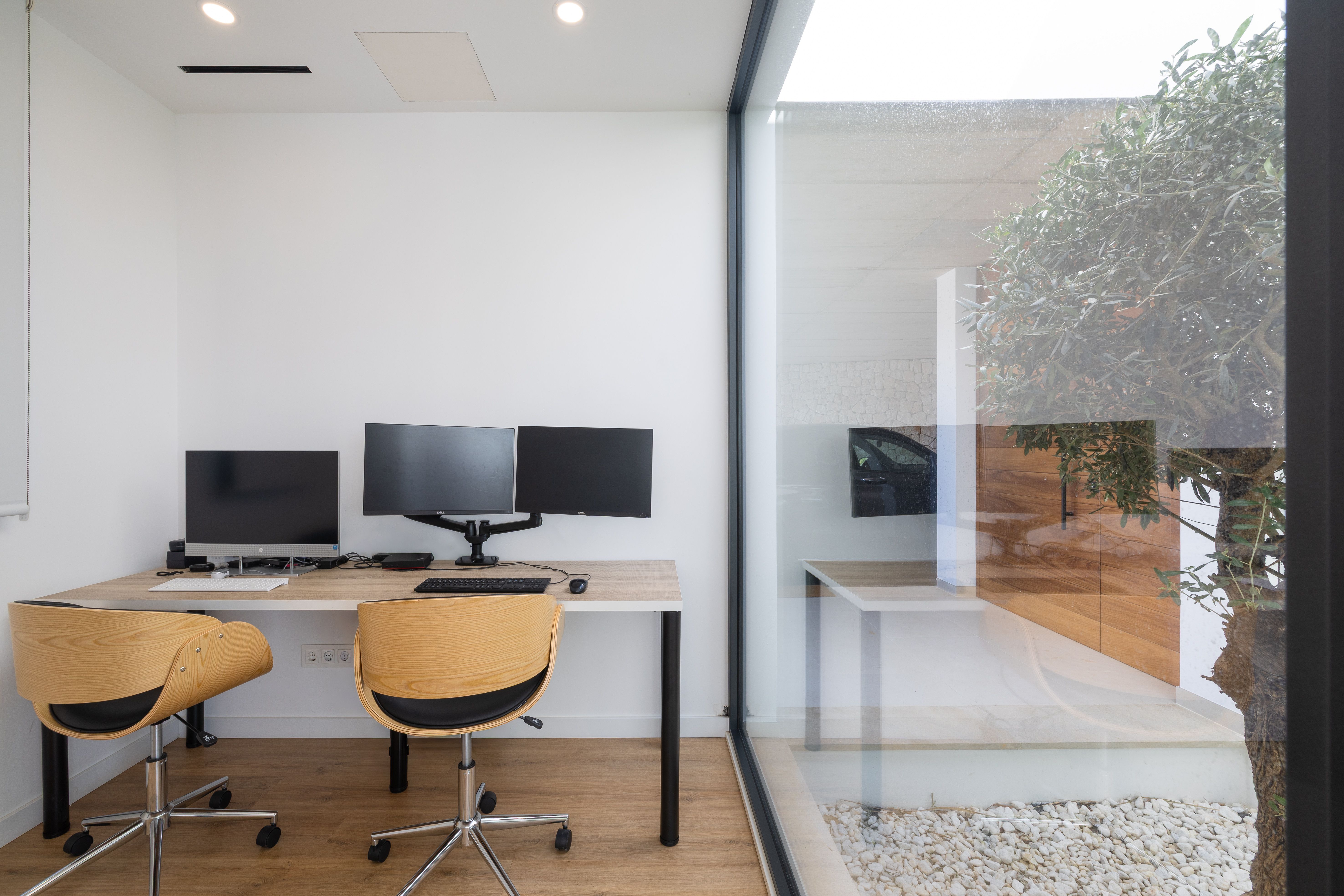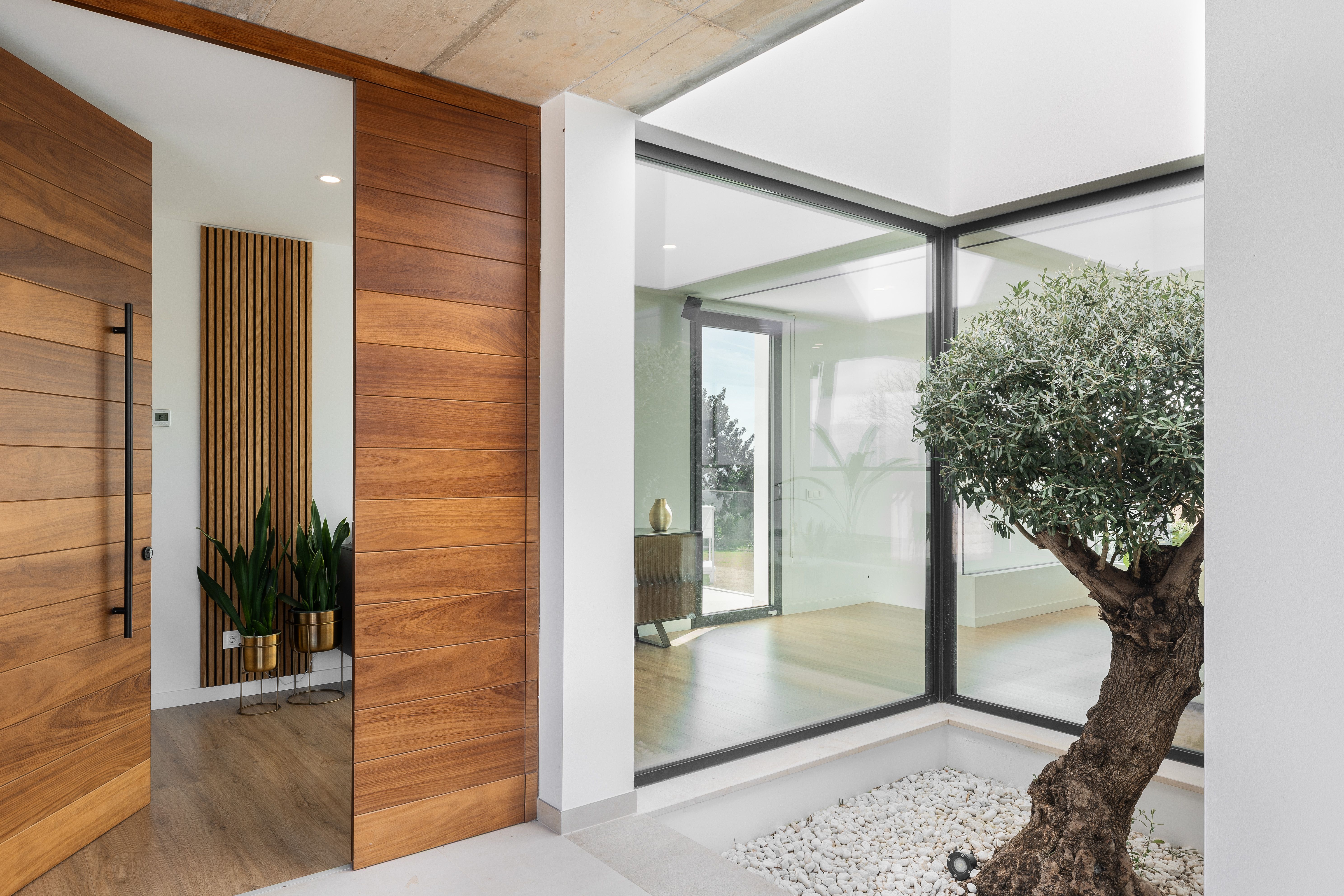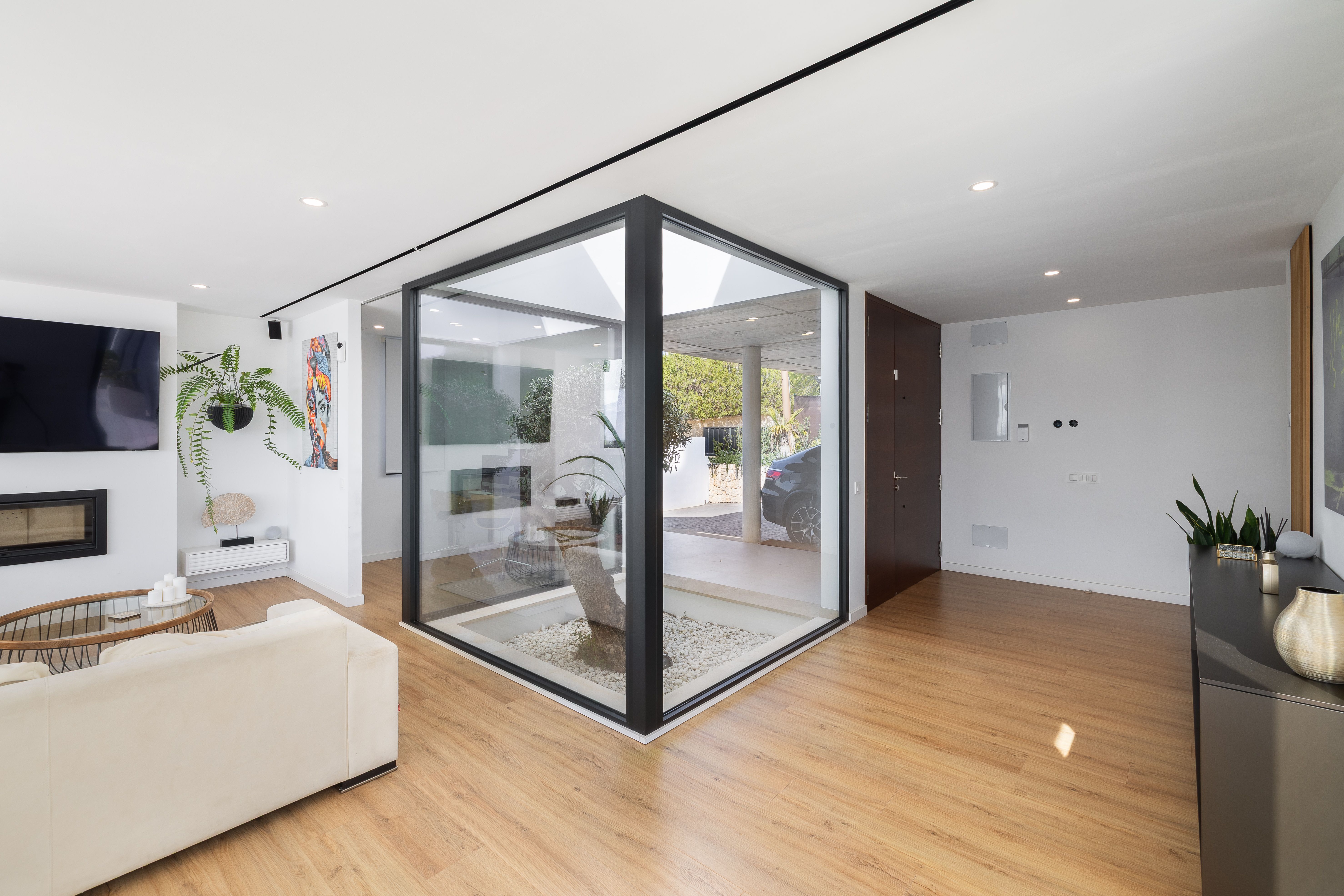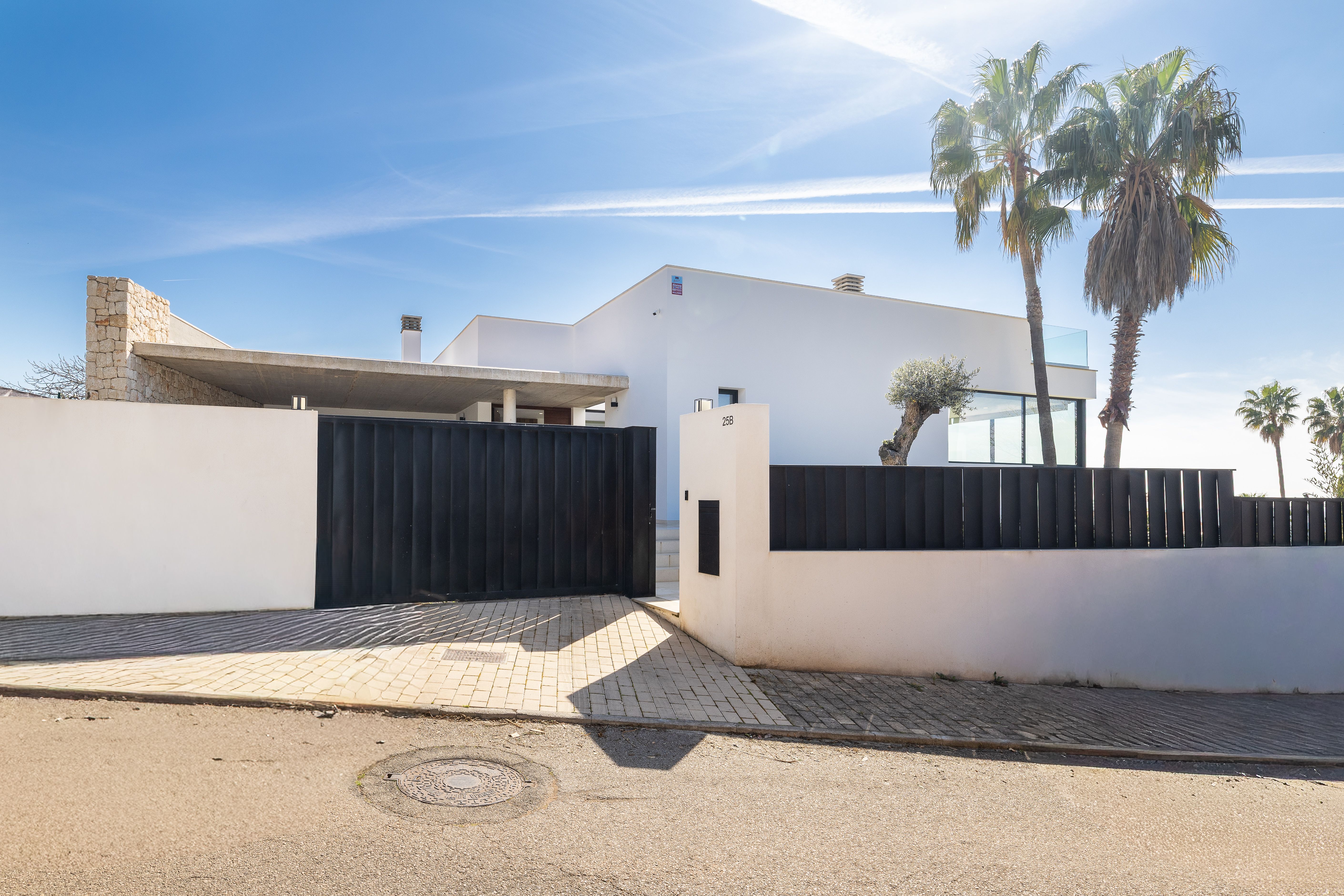 S'accedeix a la propietat a través d'un camí d'entrada vorejat de pedra natural, que ofereix una zona d'aparcament coberta per a dos vehicles. Un oliver ha estat col·locat de tal manera que pot admirar-se tant des de l'exterior com des de l'interior, la qual cosa aporta a l'espai habitable un ambient molt especial i acollidor.