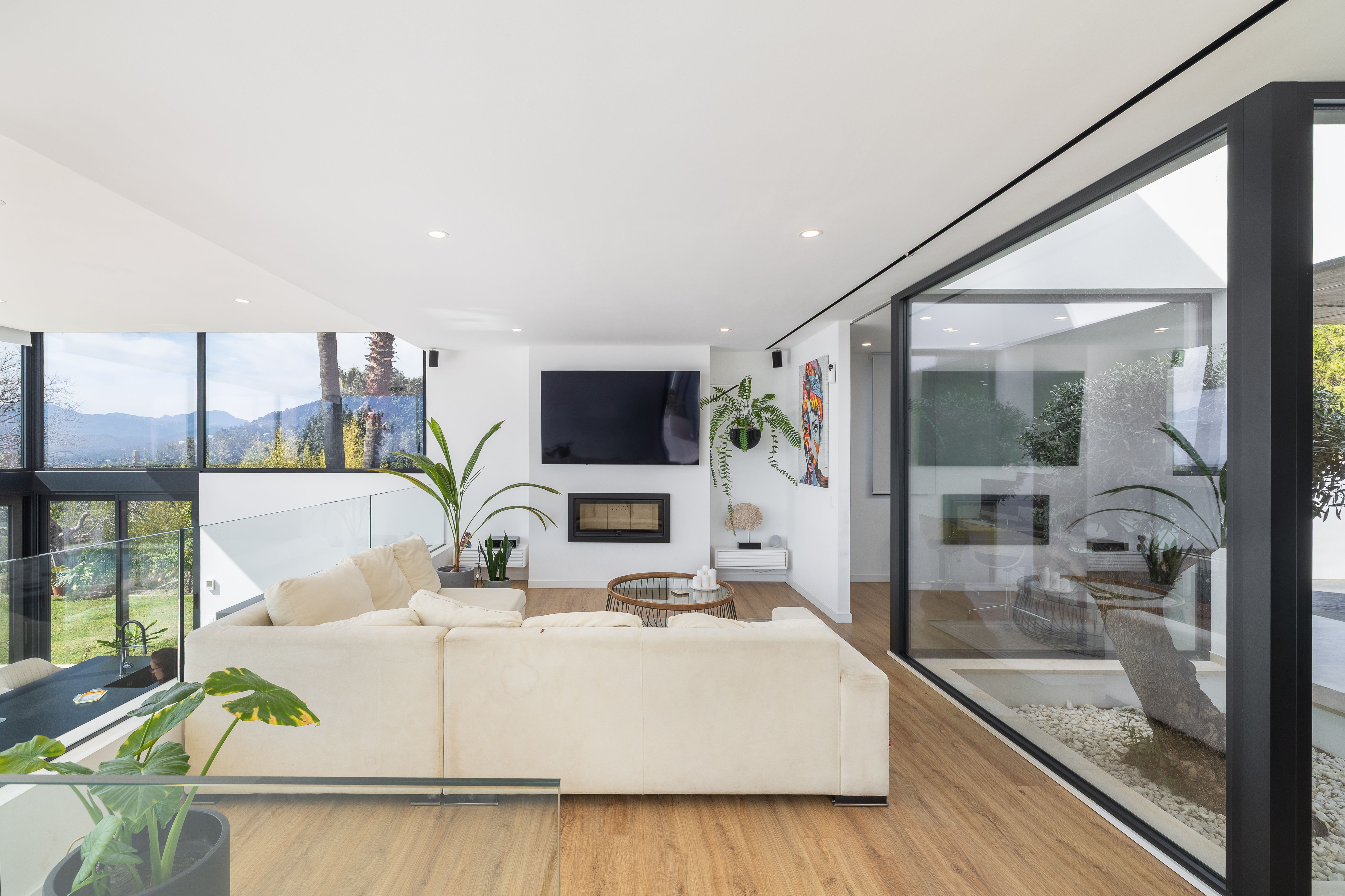 El sistema d'aire condicionat integrat garanteix un agradable clima interior en tota la casa, mentre que la calefacció per sòl radiant i la xemeneia proporcionen calor en els dies més freds.