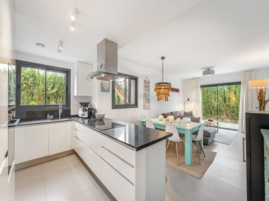 Aquesta moderna vila, construïda el 2020, es troba en una tranquil·la urbanització de Cala Murada. L'arquitectura neta, els amplis finestrals i els espais lluminosos creen una agradable sensació d'amplitud i confort. Amb una superfície total de 178,38 m2, la casa destaca per un disseny d'espais acuradament pensat tant per a la vida diària com per rebre convidats. A la planta baixa es troba la zona oberta de saló, menjador i cuina. Just al costat se situa el jardí d'hivern amb cristalls abatibles i un sostre de lames giratòries, que permet ampliar l'espai habitable de manera flexible i utilitzar-lo durant tot l'any segons les necessitats. Davant del jardí d'hivern hi ha una cuina exterior d'acer inoxidable amb aigua calenta, barbacoa a gas i frigorífic. En total, la vila compta amb tres dormitoris, un d'ells a la planta baixa, i tres banys. Tots els banys compten, a més de la bomba de calor central i aire condicionat, amb calefacció elèctrica per sòl radiant per a una temperatura agradable. L'exterior inclou una piscina d'obra i gres de 7 con 4 metres amb electròlisi salina i bomba de calor, així com una dutxa exterior d'obra amb aigua calenta. La parcel·la de 390 m2 s'accedeix mitjançant un portó elèctric i disposa d'un carport per a dos vehicles, equipat amb estació de càrrega per a cotxes elèctrics. Entre les instal·lacions tècniques s'inclouen un sistema solar amb emmagatzematge, connexió de fibra òptica i modernes instal·lacions de climatització i calefacció, que garanteixen una llar eficient i confortable durant tot l'any. Aquesta vila combina una ubicació tranquil·la, arquitectura clara i equipament modern, perfecta per als qui busquen una llar còmoda i contemporani a Cala Murada.
