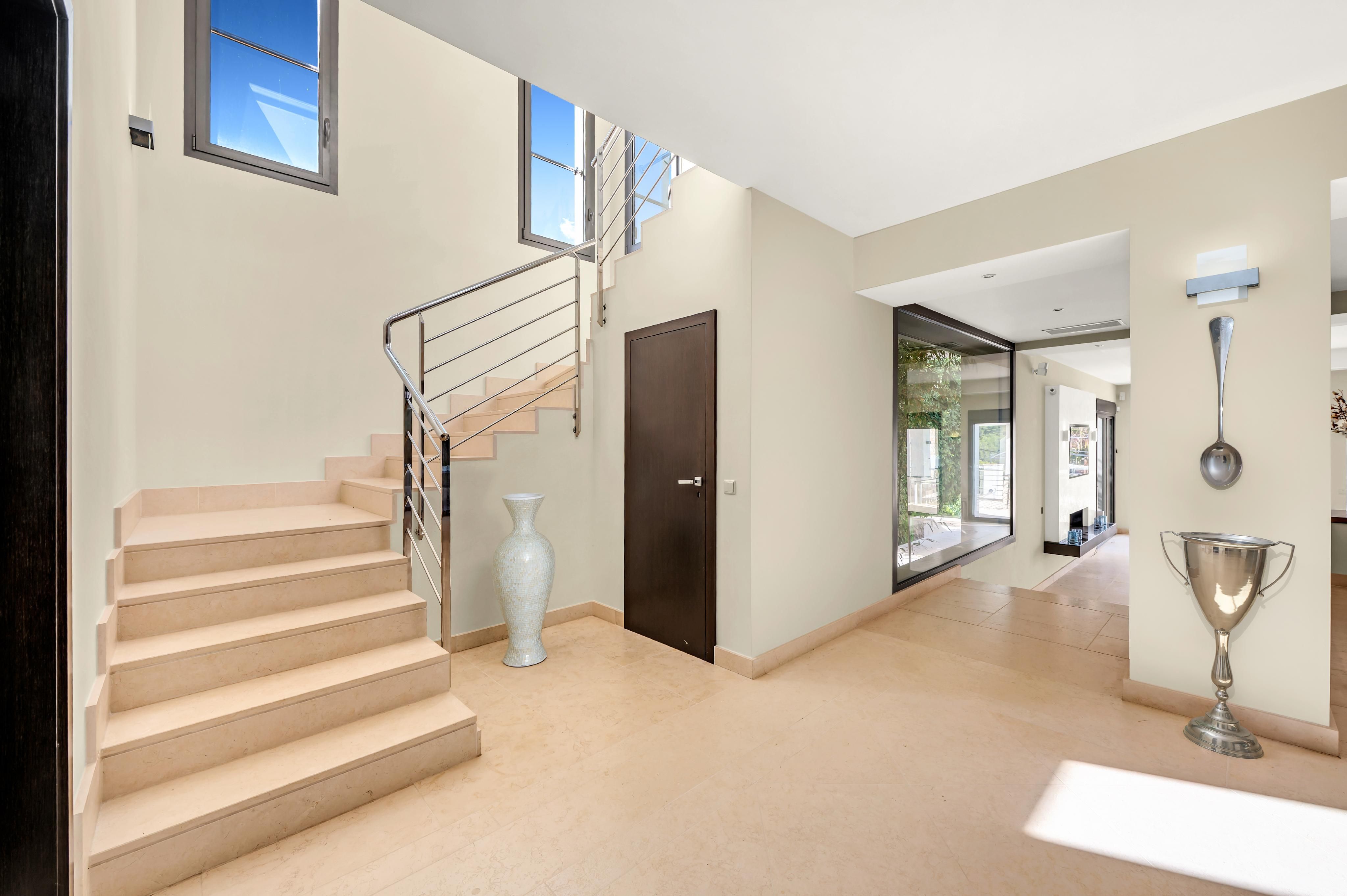 Aquesta elegant vila d'estil contemporani, destaca per les impressionants vistes al mar que es contemplen des de la majoria de les seves estades. Es troba en la luxosa zona de Costa d'en Blanes, a escassos minuts de Port Portals. Combina a la perfecció disseny, comoditat, qualitat i espais oberts, oferint un ambient acollidor i lluminós en cada racó. A la primera planta, compta amb una àmplia zona d'estar que té accés directament a la terrassa principal i a la piscina, creant un espai ideal per gaudir de l'aire lliure durant tot l'any. El menjador connecta amb una altra terrassa equipada amb zona de barbacoa, perfecta per a reunions a l'aire lliure. La cuina, moderna i funcional, s'integra harmoniosament en el conjunt. En aquesta mateixa planta es troba un dormitori amb accés a la terrassa i una neteja de cortesia. La segona planta alberga el dormitori principal, que disposa de bany en suite, vestidor i accés a una terrassa privada. En aquesta mateixa planta es troben altres dos dormitoris dobles que comparteixen un bany complet i que també tenen sortida directa a una àmplia terrassa. Des del seu solàrium, un racó privilegiat per relaxar-se, prendre el sol o gaudir dels atardits més espectaculars, es contemplen unes vistes panoràmiques impressionants.