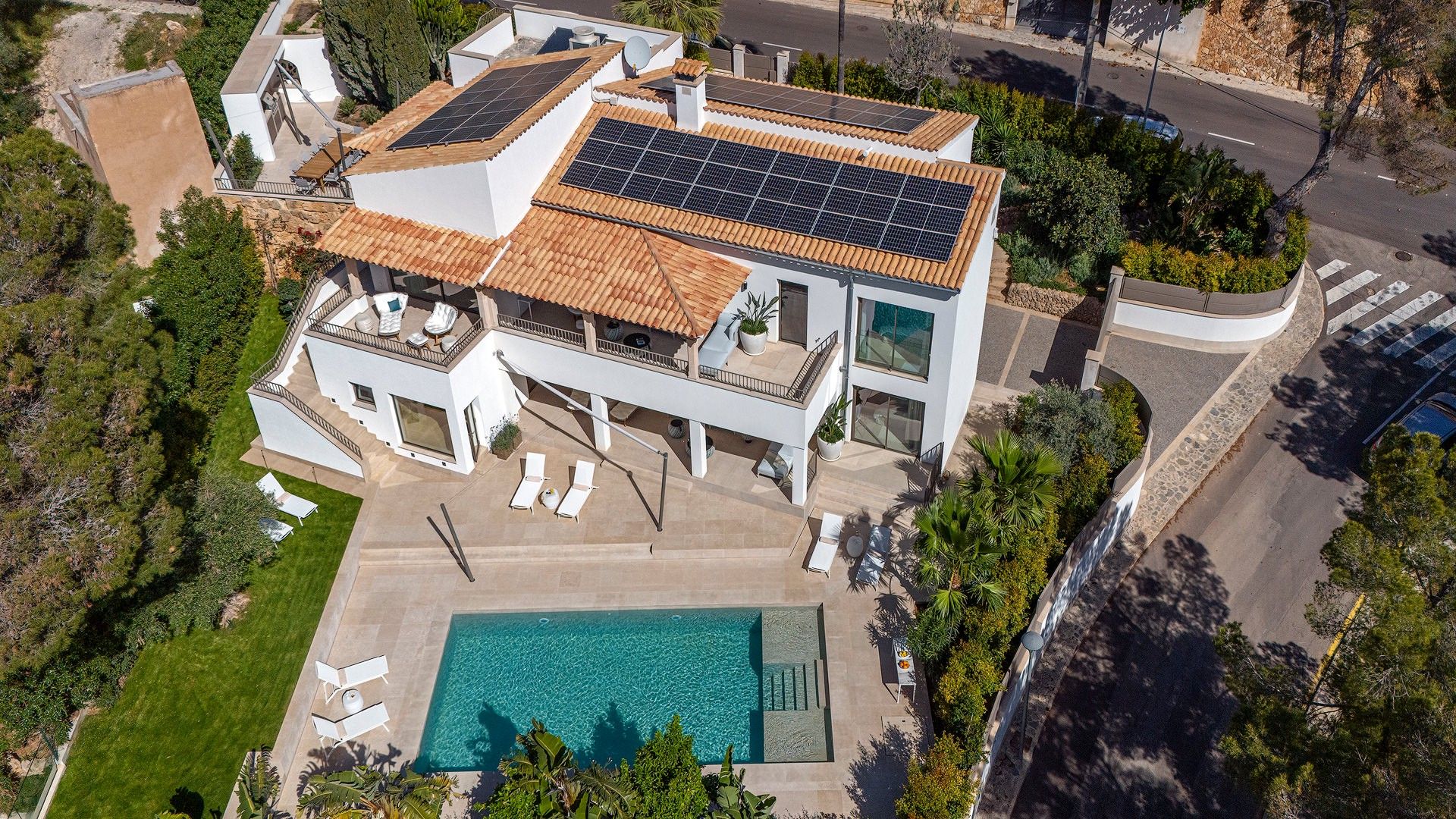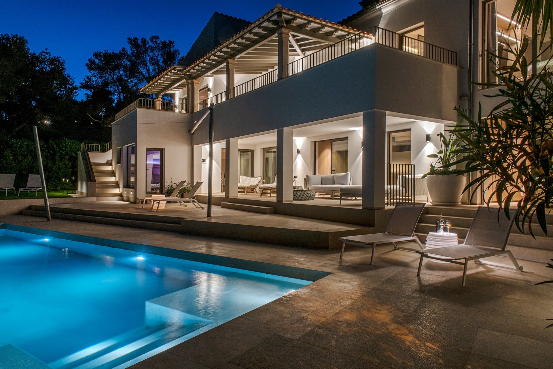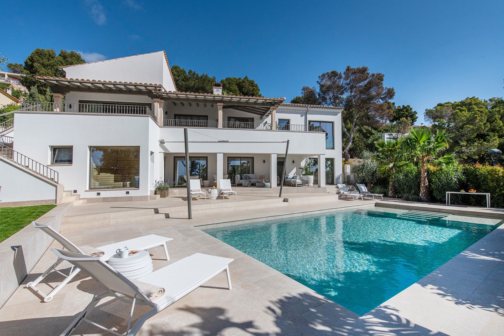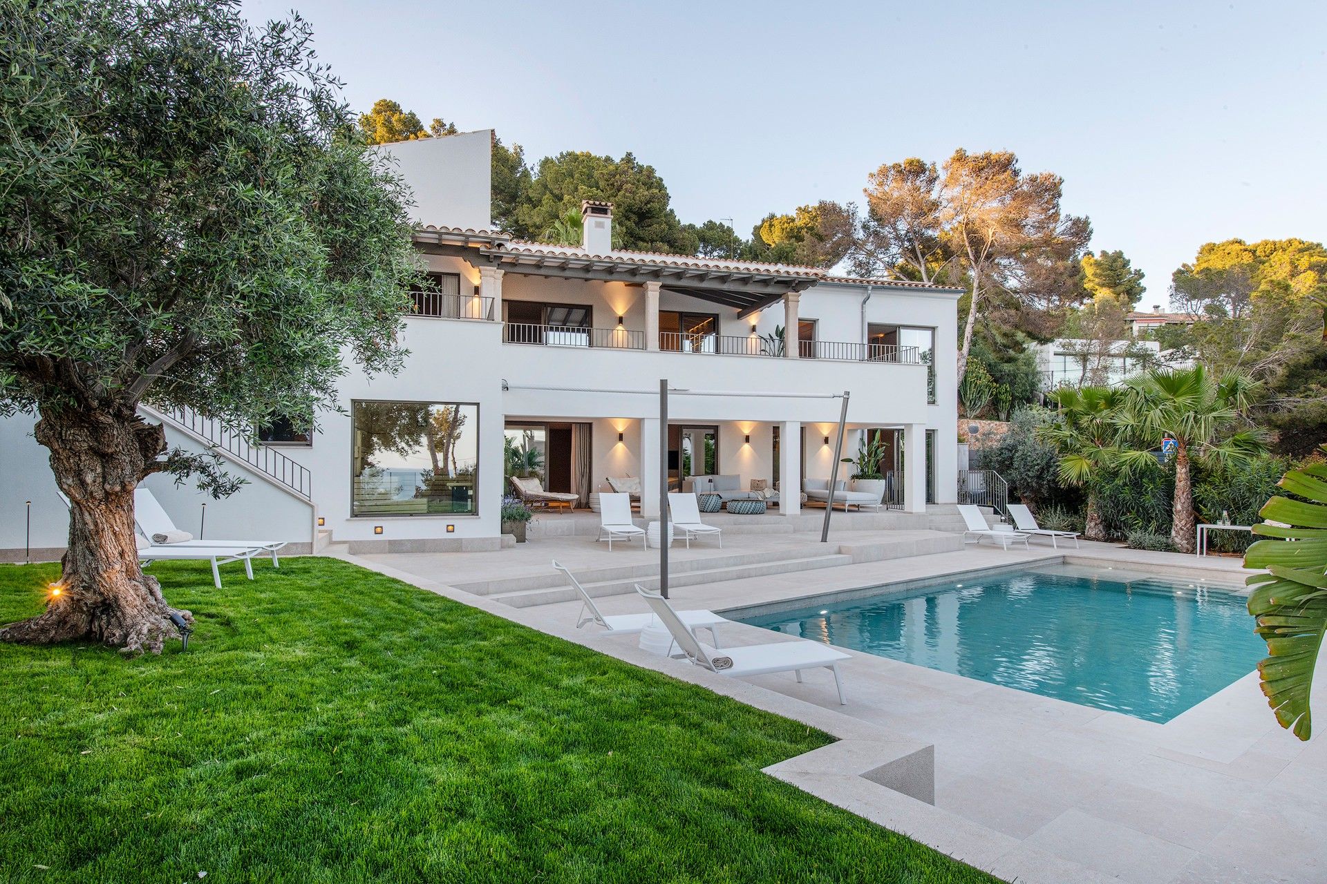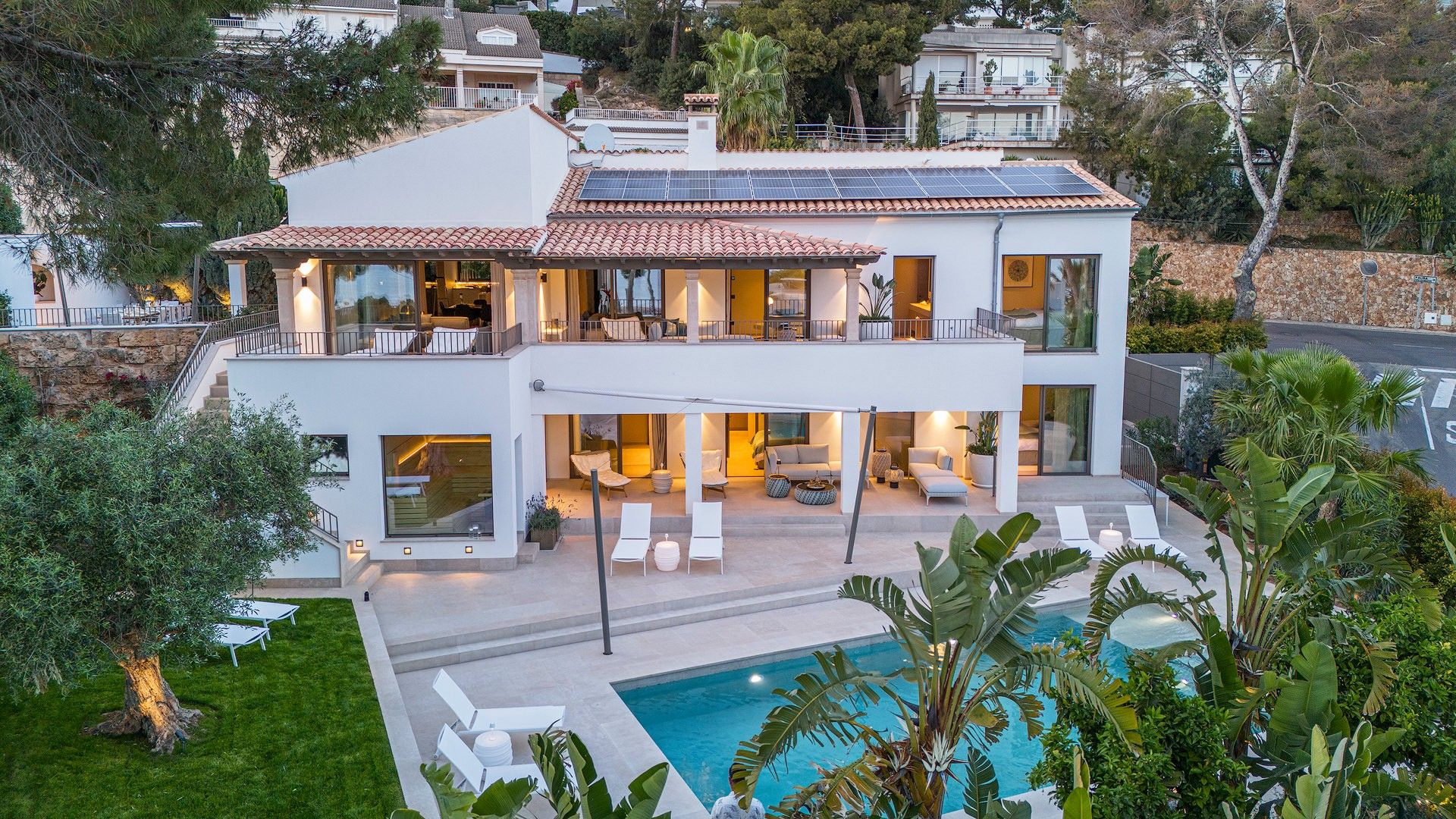 Gratis fra september 2025! Smuk villa i Costa d'en Blanes tilbyder en unik blanding af moderne luksus og middelhavscharme. Denne rummelige villa har en misundelsesværdig beliggenhed på Mallorcas sydvestkyst og er designet til at fordybe dig i øens naturlige skønhed, samtidig med at den giver alle bekvemmelighederne i et eksklusivt tilflugtssted. Med en fantastisk udsigt over havet, en stor opvarmet saltvandspool og en smukt anlagt have inviterer Villa Riviera dig til at slappe af og nyde det bedste ved at bo ved kysten. Villaen er på 280 m2 fordelt på to etager med 5 luksuriøse suiter og 4 badeværelser, som alle er fyldt med naturligt lys. Hver suite er en fredfyldt flugt, designet til ultimativ afslapning, komplet med 5-stjernede boxspring-senge, aircondition, gulvvarme og gratis Wi-Fi. Værelserne er omhyggeligt indrettet, så der er en betagende udsigt over Middelhavet, den frodige have eller den indbydende pool. Pool Suite 1 har især et fritstående badekar, så gæsterne kan nyde et roligt bad med udsigt over haven. Villaen er designet til både komfort og underholdning og har store terrasser, hvor man kan nyde solskinnet eller en kølig aftenbrise. De udendørs områder er ideelle til afslapning med en poolterrasse møbleret med liggestole og en øvre terrasse i fuld længde med loungemøbler. En udendørs sauna med udsigt over haven og poolen tilbyder et fredeligt fristed efter en lang dag i solen. Grillterrassen, der er udstyret med et stort bord og et udendørs køkken med en Napoleon-gasgrill, er perfekt til at spise i det fri og nyde Mallorcas smukke vejr. Bekvemmelighed og tilgængelighed er nøglen her. Villaen ligger kun 5 minutter fra strandene og marinaen, og du kan nemt udforske området ved hjælp af den medfølgende elektriske golfvogn, der er designet til komfort og effektivitet. For dem, der nyder at være aktive, tilbyder villaen gratis adgang til private tennisbaner og det eksklusive fitnesscenter "Singular" i Puerto Portals. Med sin perfekte kombination af luksuriøse opholdsrum, fredfyldte udendørsarealer og enestående beliggenhed tilbyder Villa Riviera en mindeværdig flugt, hvor den afslappede middelhavsstil møder moderne elegance. ETV 16047