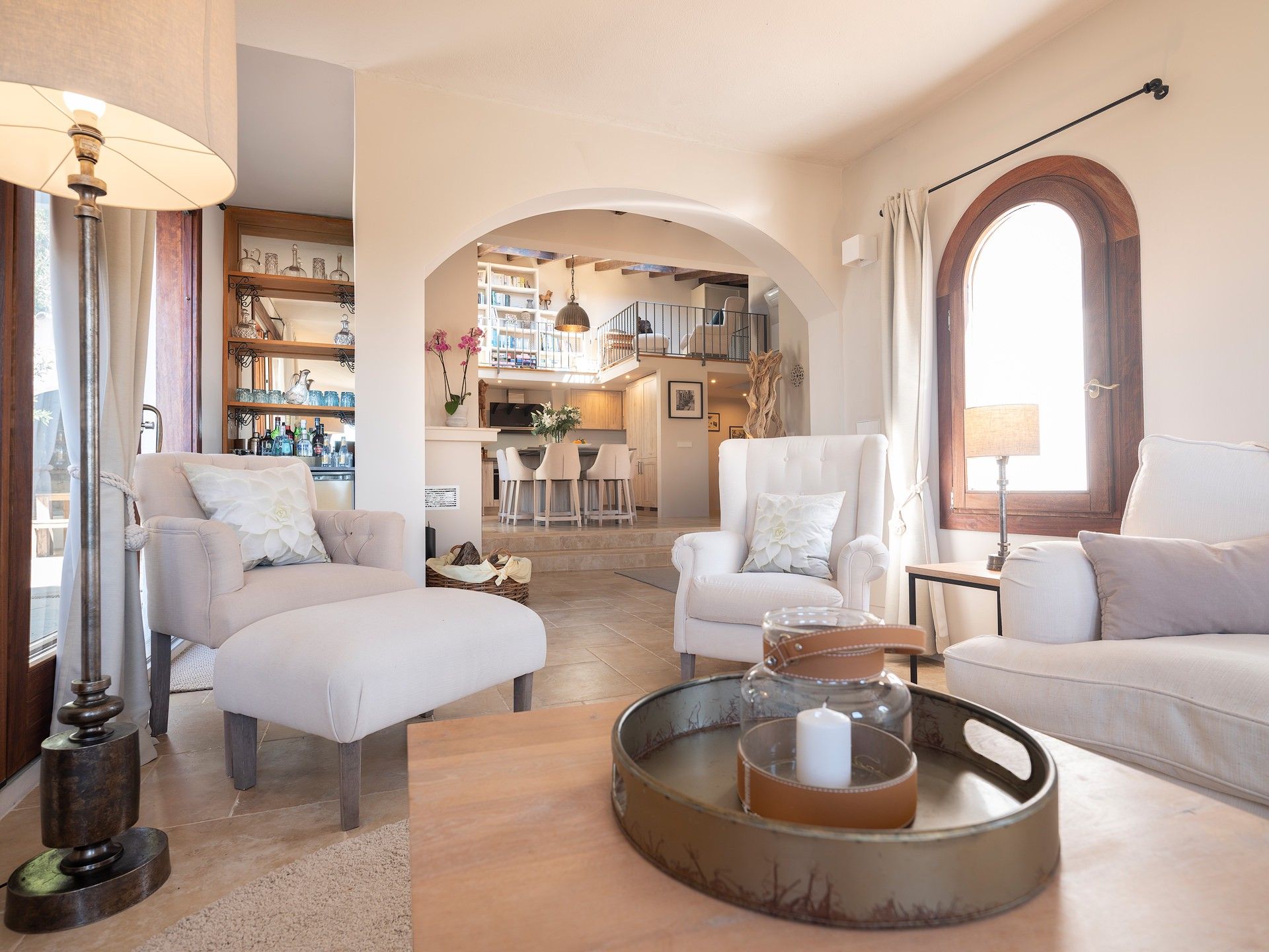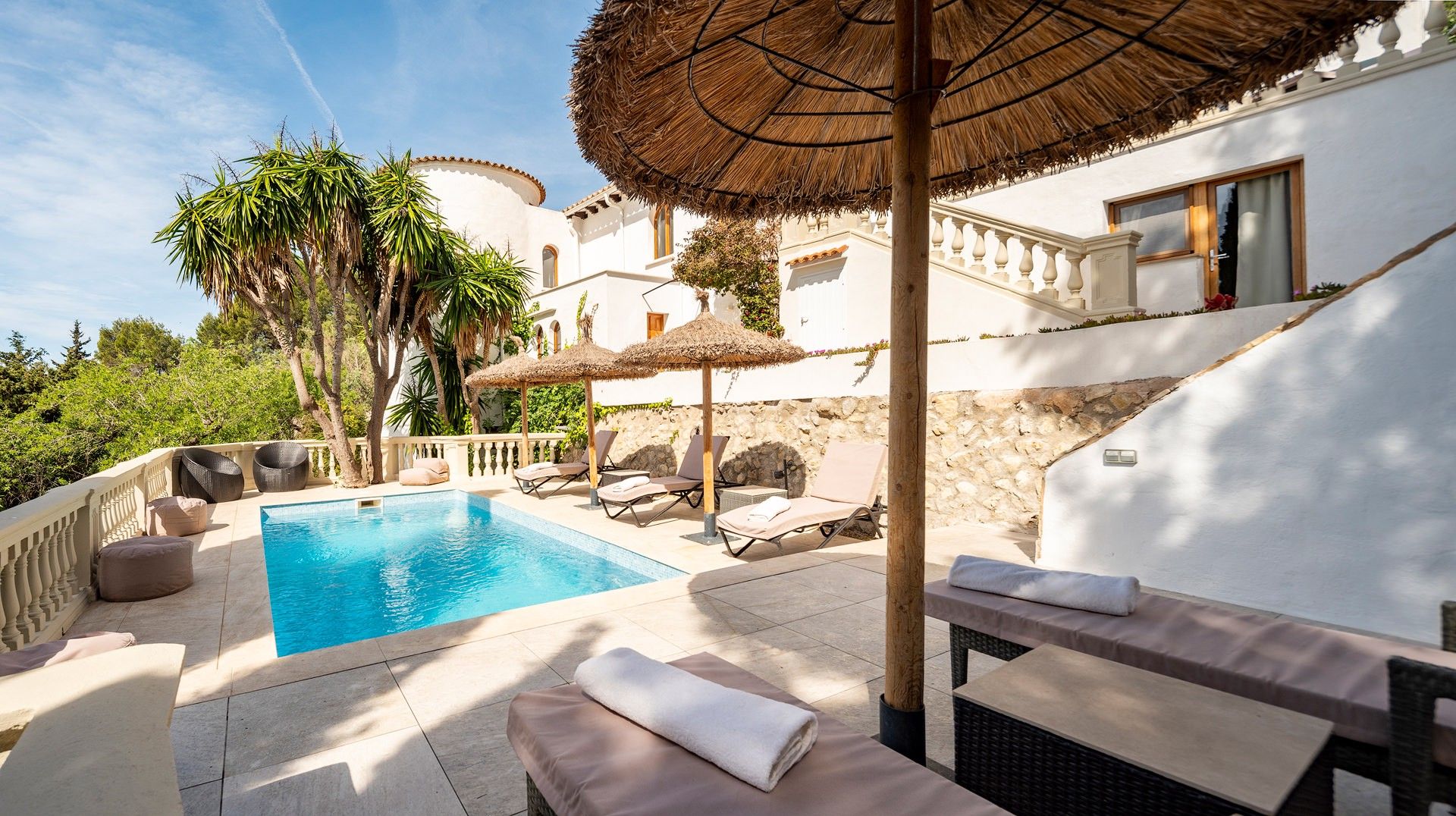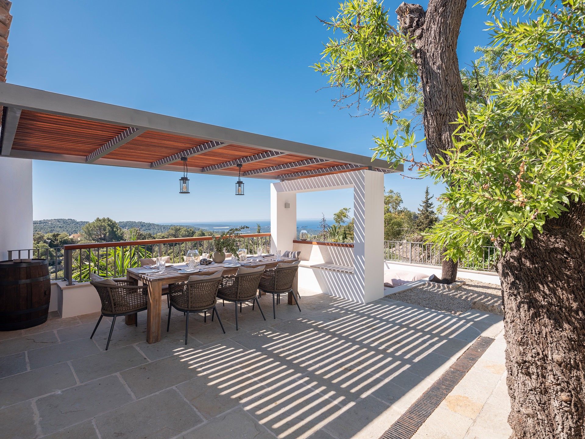 Finca Bella Roca ligger over den charmerende bjerglandsby Galilea og er et luksuriøst tilflugtssted i hjertet af de UNESCO-listede Tramuntana-bjerge. 400 meter over havets overflade byder dette eksklusive tilflugtssted på en betagende 360° udsigt over havet og bjergene og er den perfekte flugt fra hverdagen. Villaen har fire smukt designede soveværelser, hvert med eget badeværelse, 5-stjernede boxspring-senge, aircondition og en fantastisk udsigt. Et fuldt udstyret high-end køkken inviterer dig til at skabe mindeværdige måltider, mens rummelige opholdsrum sikrer afslapning med stil. Forkæl dig selv med enestående faciliteter, herunder en stor sauna med udsigt over haven, et privat fitnesscenter og en opvarmet 19 m saltvandspool med udsigt over bjergene. Villaen byder også på mange fredelige åndehuller, en fodboldbane med kunstgræs og en legeplads for familier. Uanset om man nyder et glas rosé på terrassen, lytter til fuglesang i haven eller udforsker øens naturlige skønhed, tilbyder Finca Bella Roca en sømløs blanding af luksus, komfort og privatliv for en uforglemmelig flugt. ETV 9898