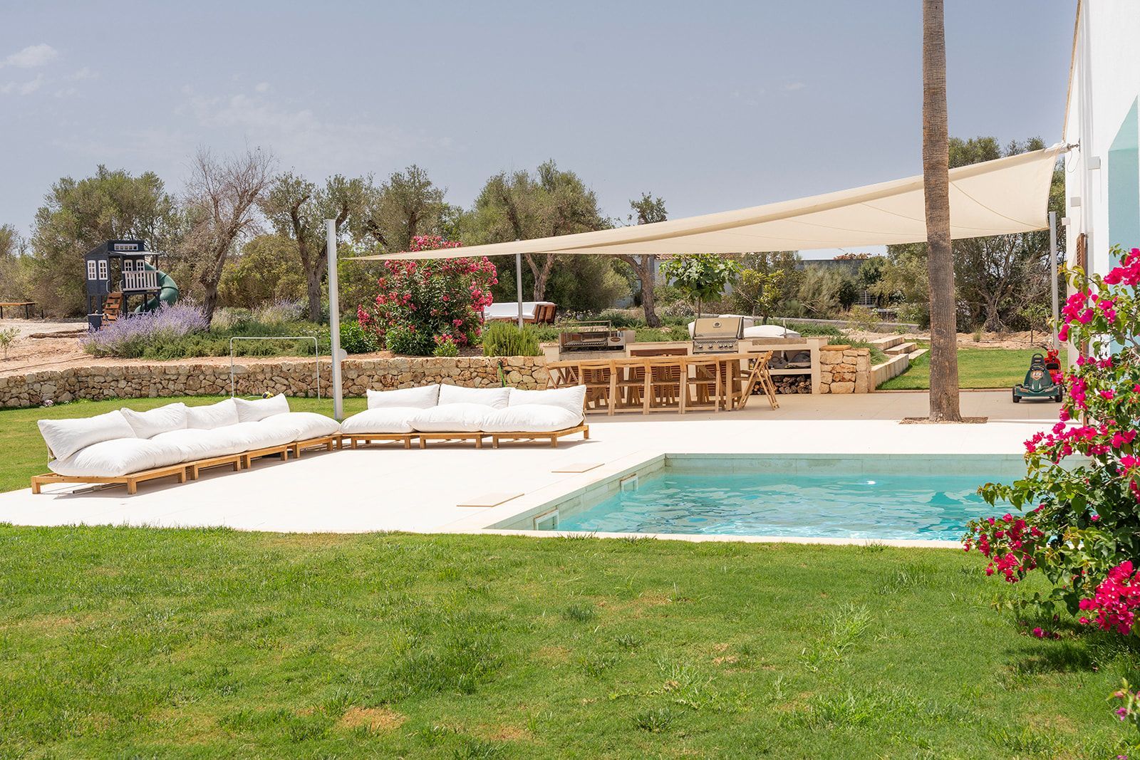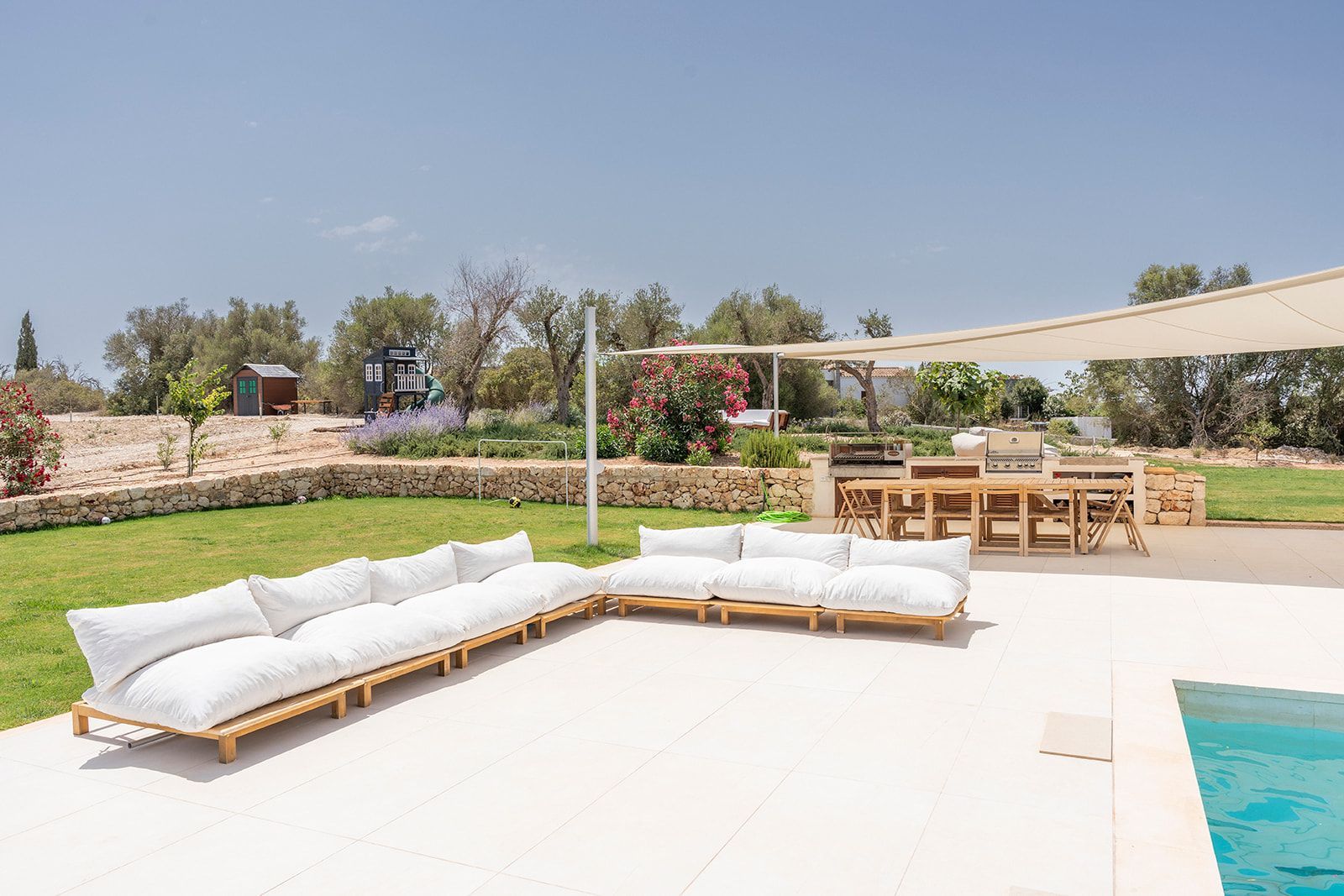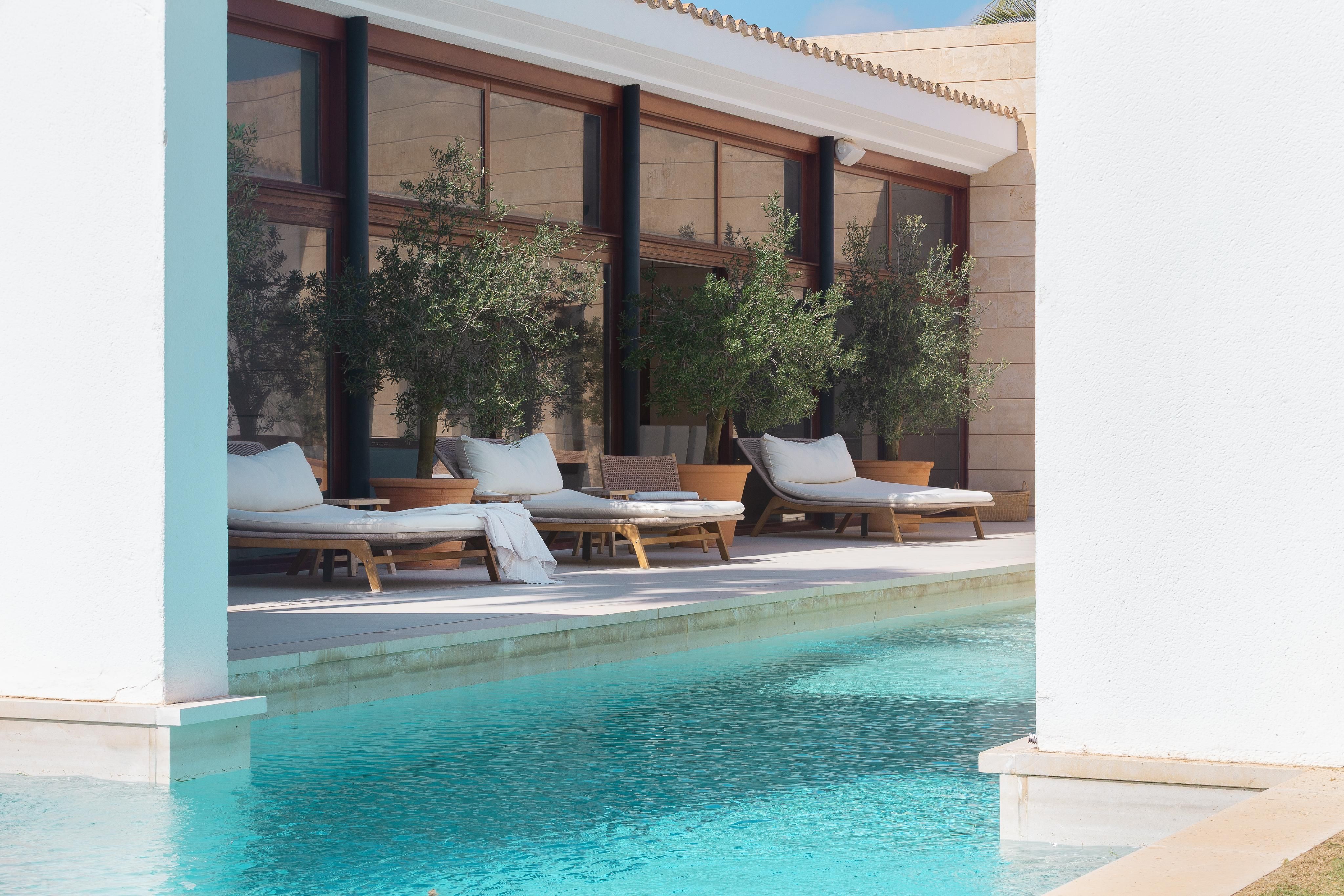 Højdepunkter: Arkitektens hus med enestående design, gårdhave med central, dyb pool, loftintegreret klimaanlæg (varmt/koldt), sikkerhedssystemer, smukt anlagt middelhavshave.