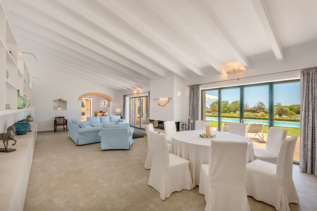 På en grund på ca. 14.200 m² finder man denne moderne finca, der er indrettet med stor sans for detaljer. Den imponerer med sit middelhavsdesign med gulv-til-loft-vinduer i hele huset og tilbyder en sensationel 360° udsigt over naturen til havet. Stueetagen har et åbent opholds-/spiseområde med pejs og et fuldt udstyret moderne køkken, som er direkte forbundet med spiseområdet. Herfra har du adgang til en terrasse, et vidunderligt sted at nyde solnedgangen. På denne etage er der to soveværelser med eget badeværelse. Ovenpå finder du det store soveværelse med eget badeværelse, påklædningsområde og en storslået udsigt til øen Cabrera og Middelhavet i den ene retning og Tramuntana-bjergene i den anden. Desuden er der et andet værelse med badeværelse en suite, som kan bruges som kontor eller soveværelse. Gulvvarme giver et behageligt indeklima selv på køligere dage. I den velholdte have finder du den 4 x 20 m store pool og delvist overdækkede terrasser med grill, hvor du kan nyde afslappende timer med familie og venner. Fra garagen, hvor der er plads til to køretøjer, har du også direkte adgang til huset. Den populære landsby SesSalines samt Santanyì med sit ugentlige marked, mange restauranter, caféer og indkøbsmuligheder kan nås på få minutter i bil.