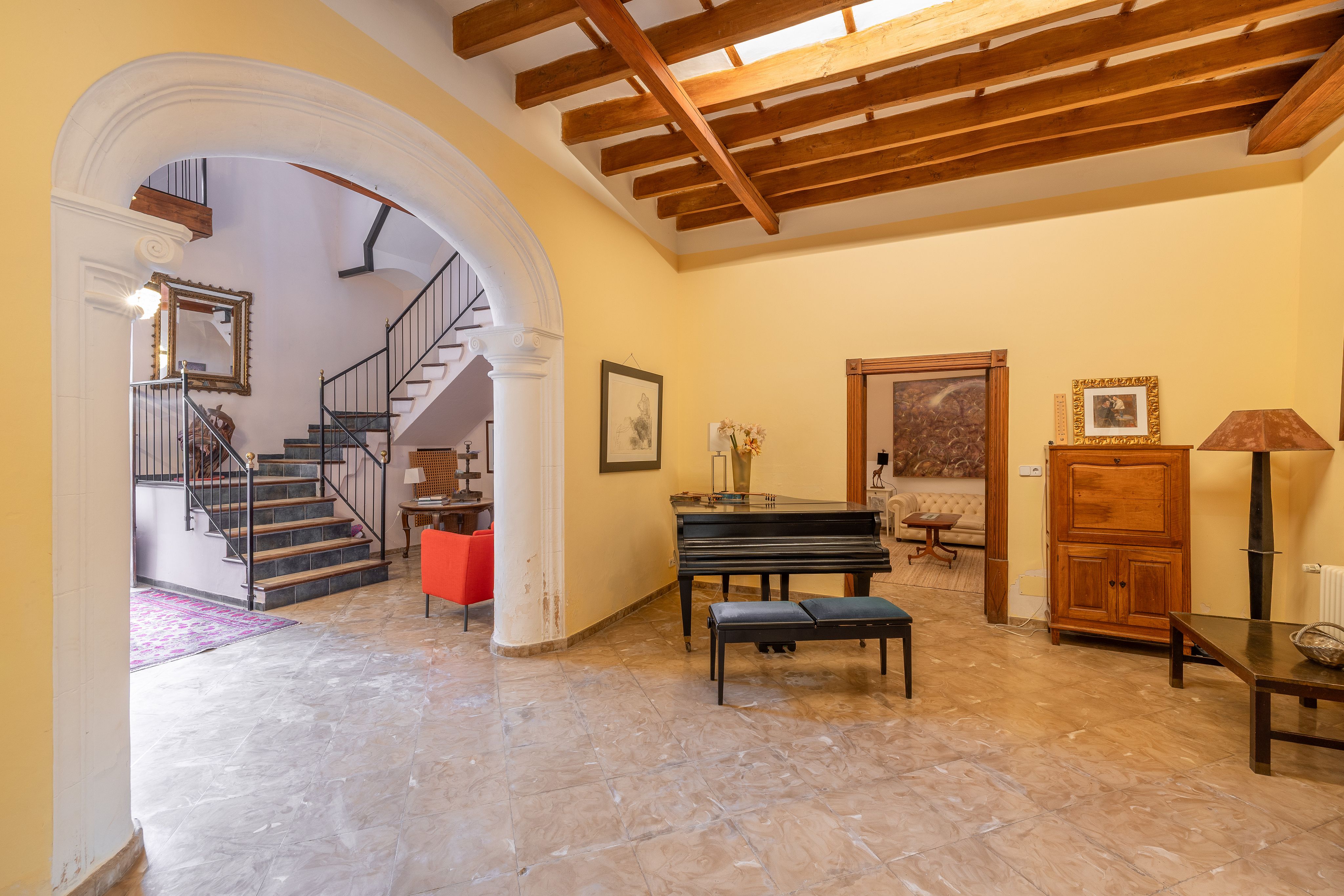 Dette imponerende byhus er en sand skat for elskere af det autentiske Mallorca. Med sine generøse dimensioner og uspolerede, rustikke karakter tilbyder det en sjælden mulighed for at erhverve et stykke øhistorie. Huset imponerer med sin storslåede loftshøjde og en fleksibel ruminddeling med 6 til 8 soveværelser (inklusive to suiter) - ideelt til en stor familie eller som et rummeligt flergenerationshjem.