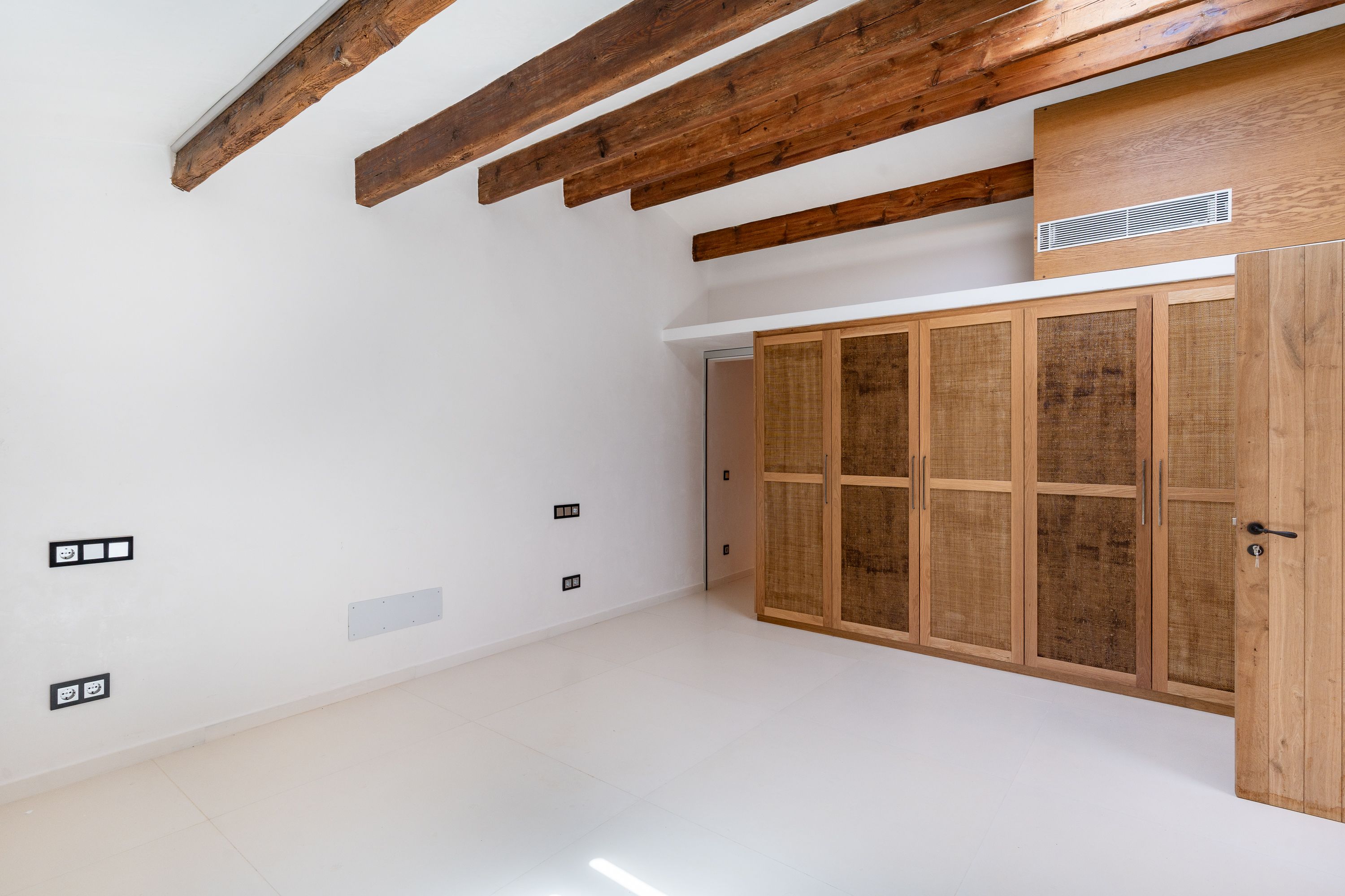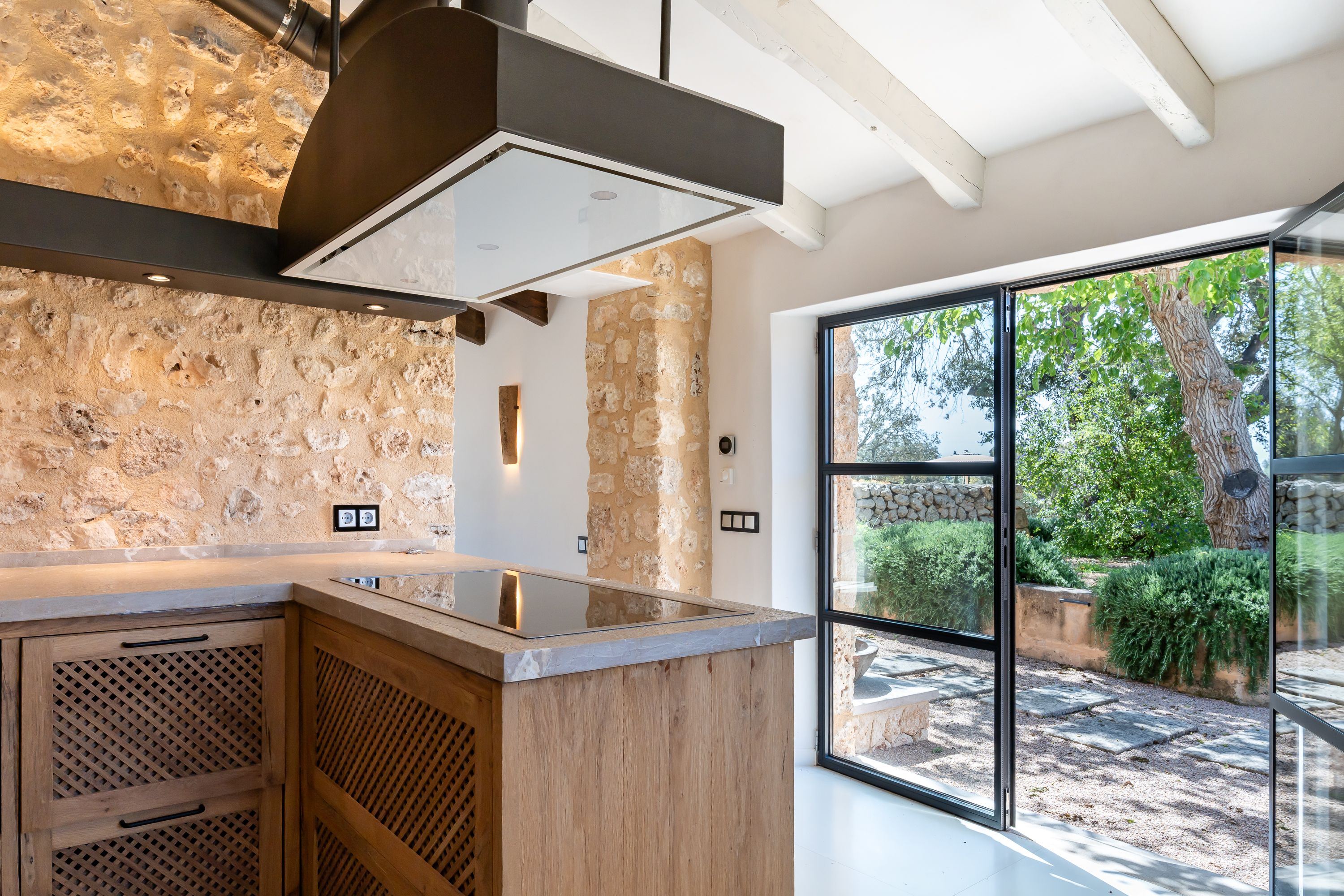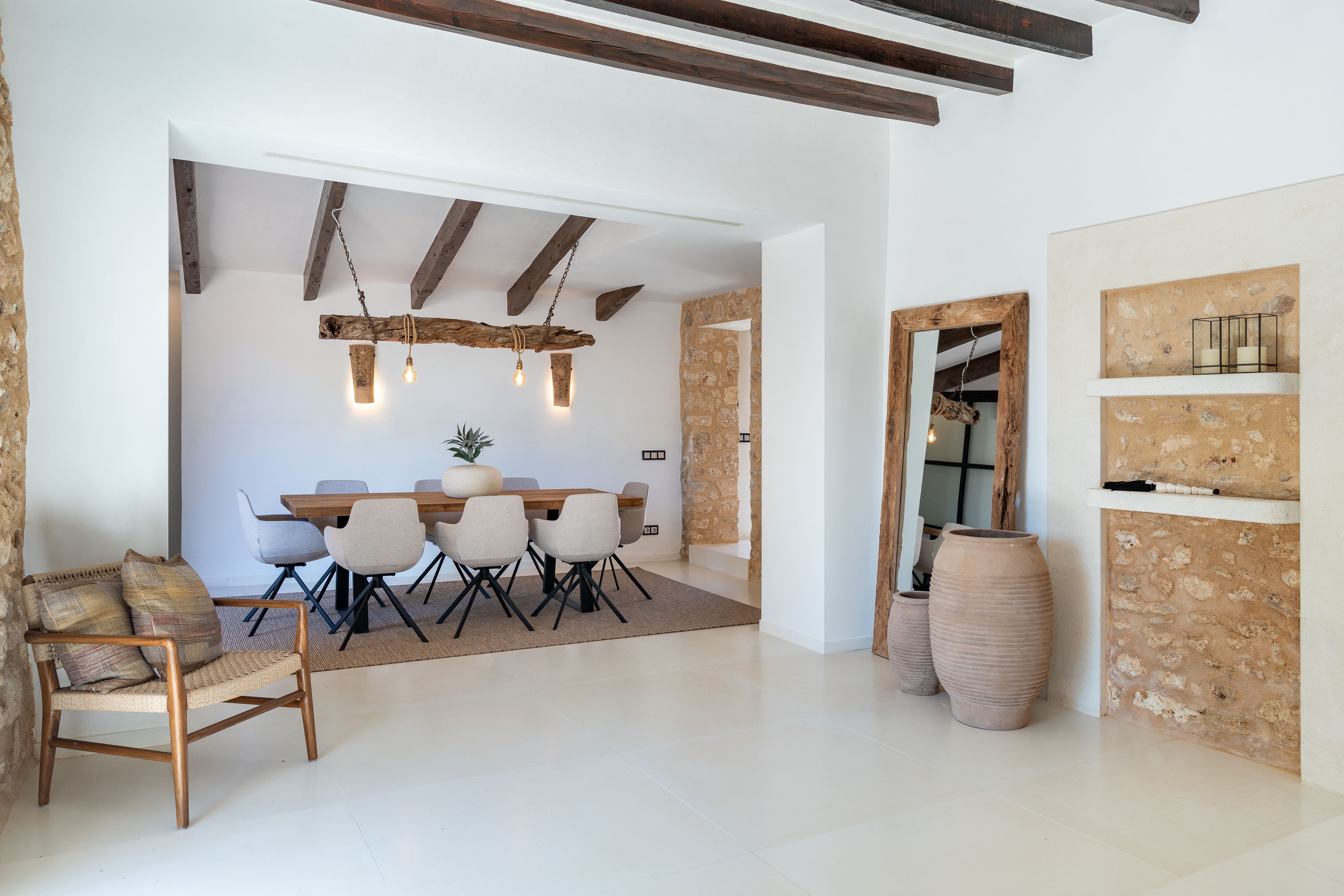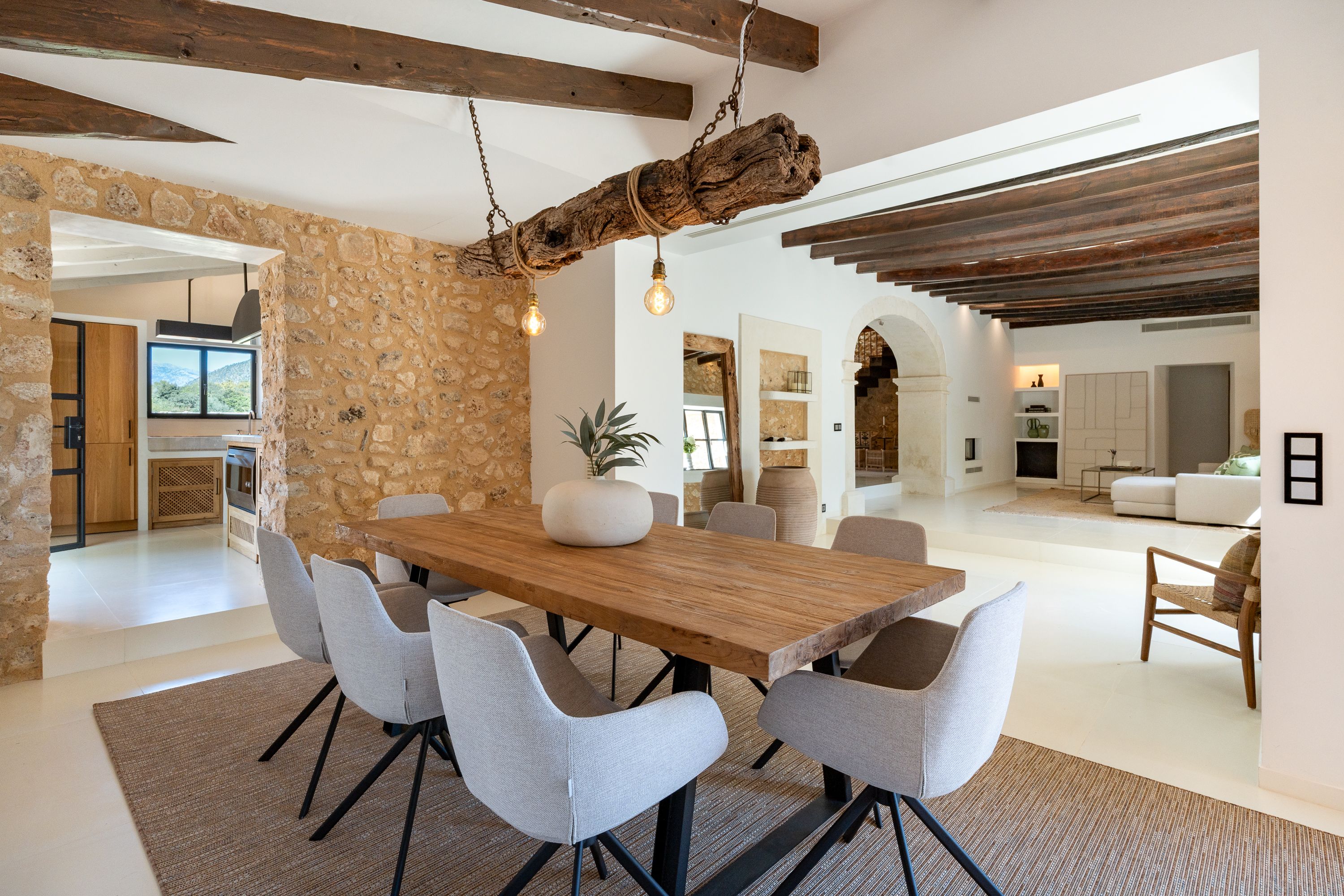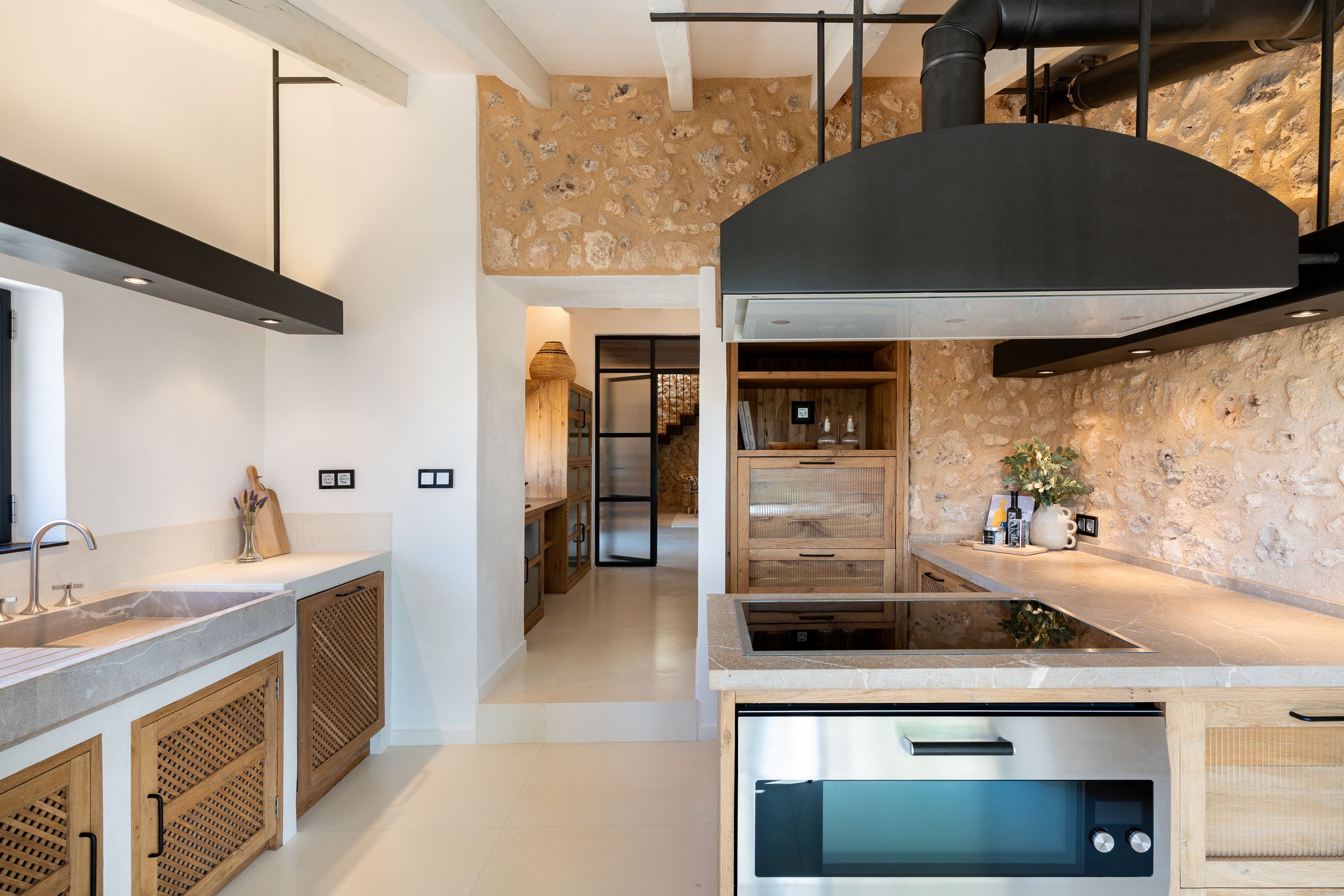 På første sal har vi en stue-spisestue med et åbent køkken, autentiske mallorcinske træk og Gaggenau-apparater.