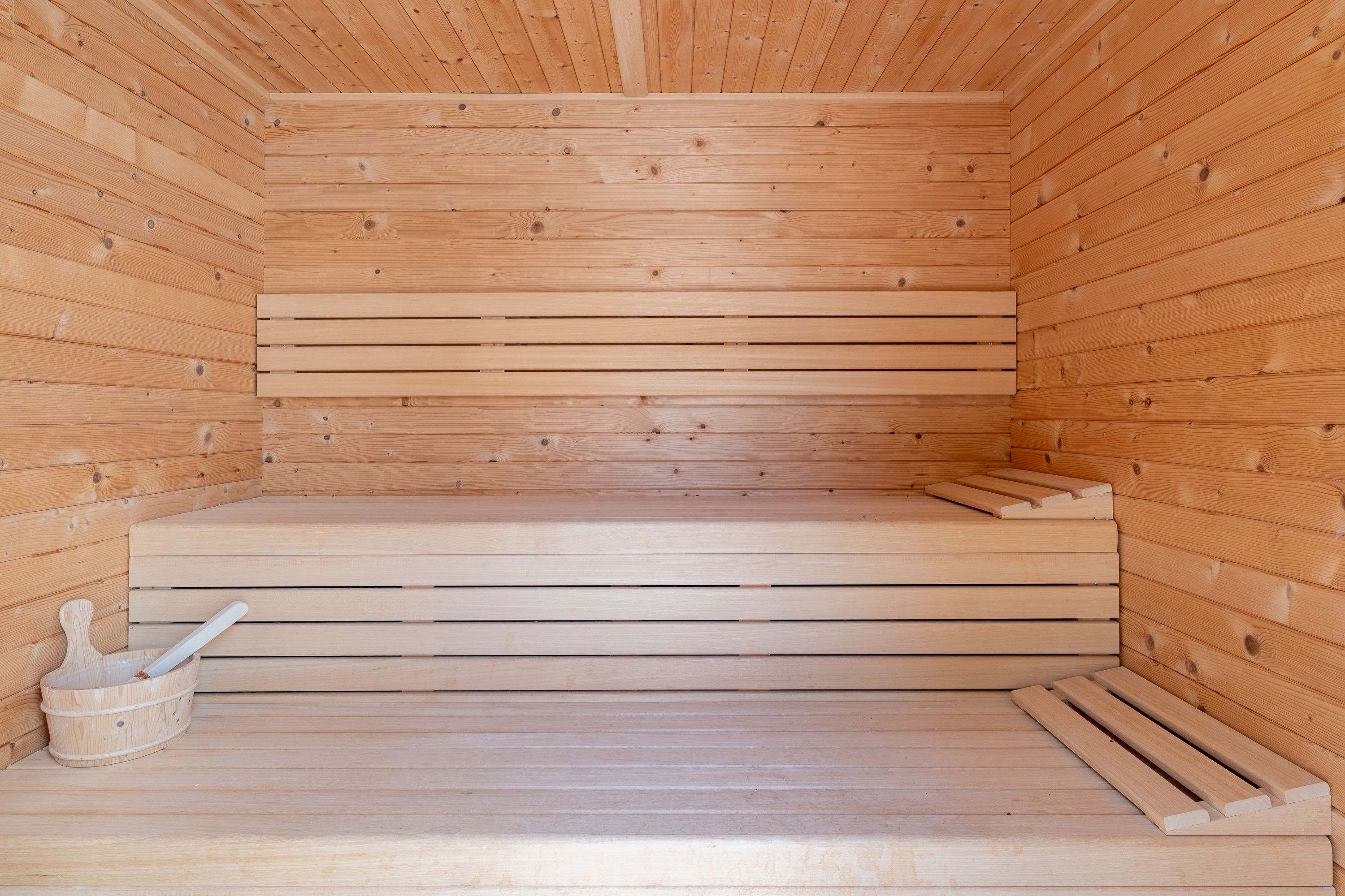 Udendørsområdet er meget flot, da det byder på flere terrasser, en stor swimmingpool, et udendørs badeværelse, et vaskerum og en sauna med et tyrkisk bad (dampbad).