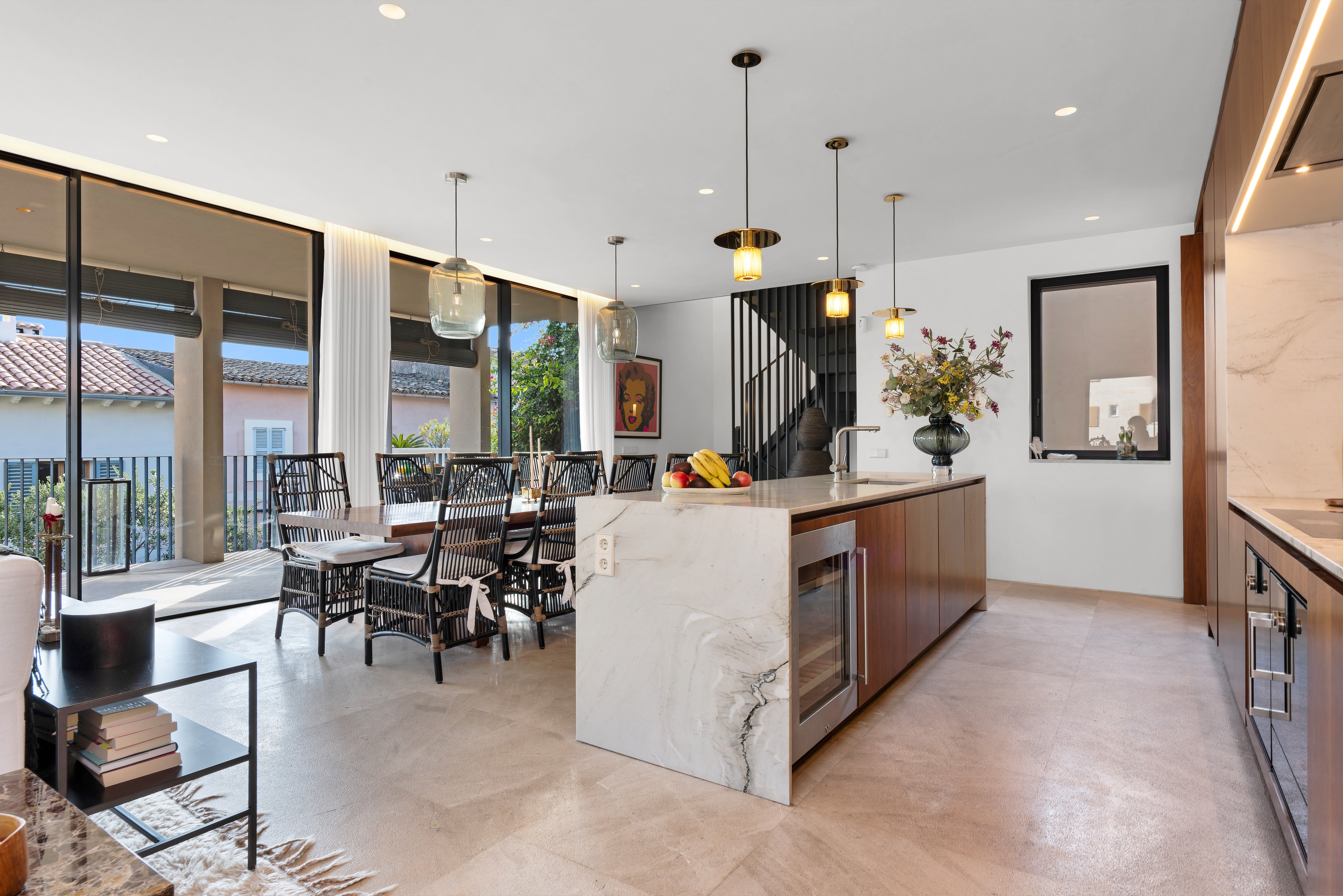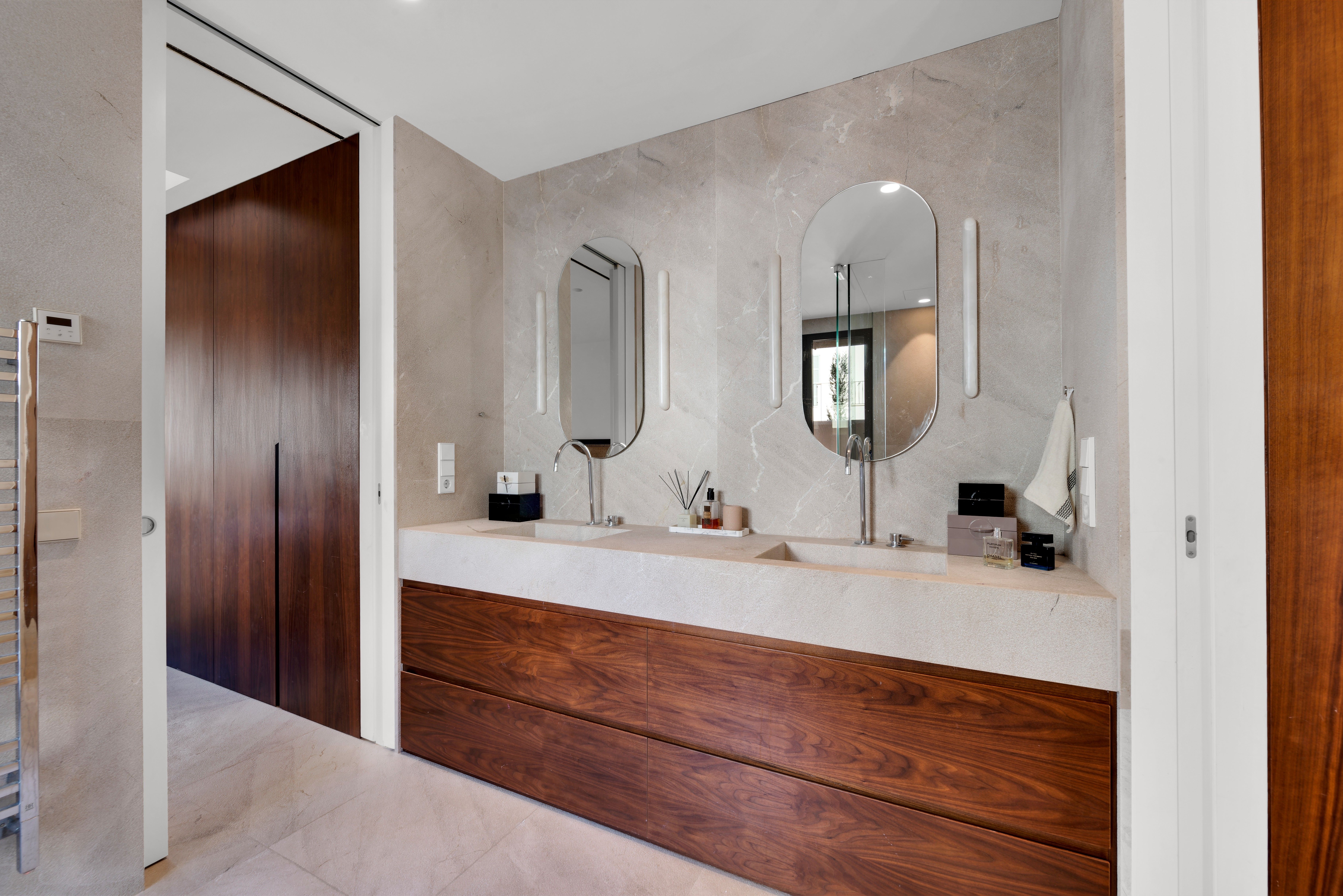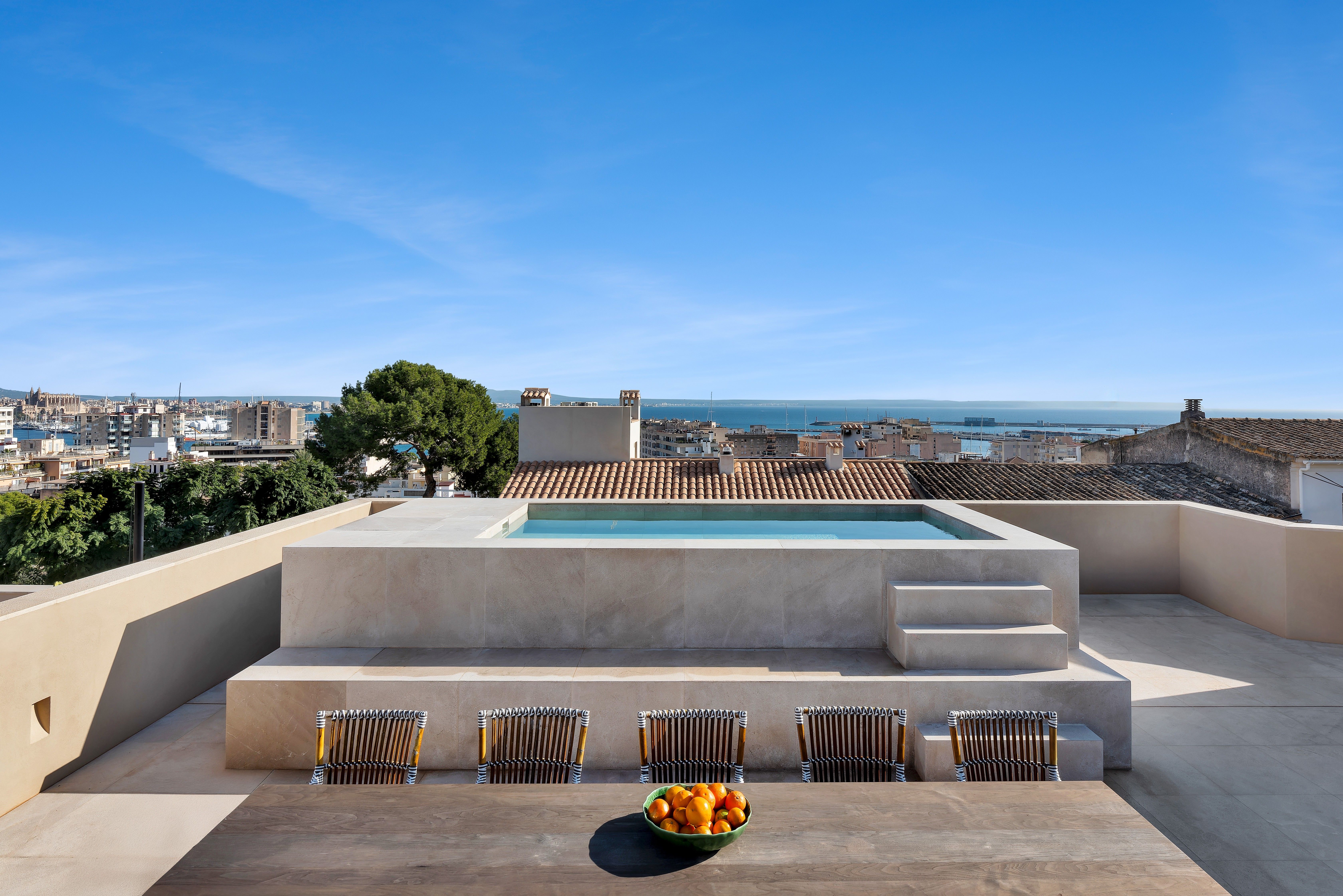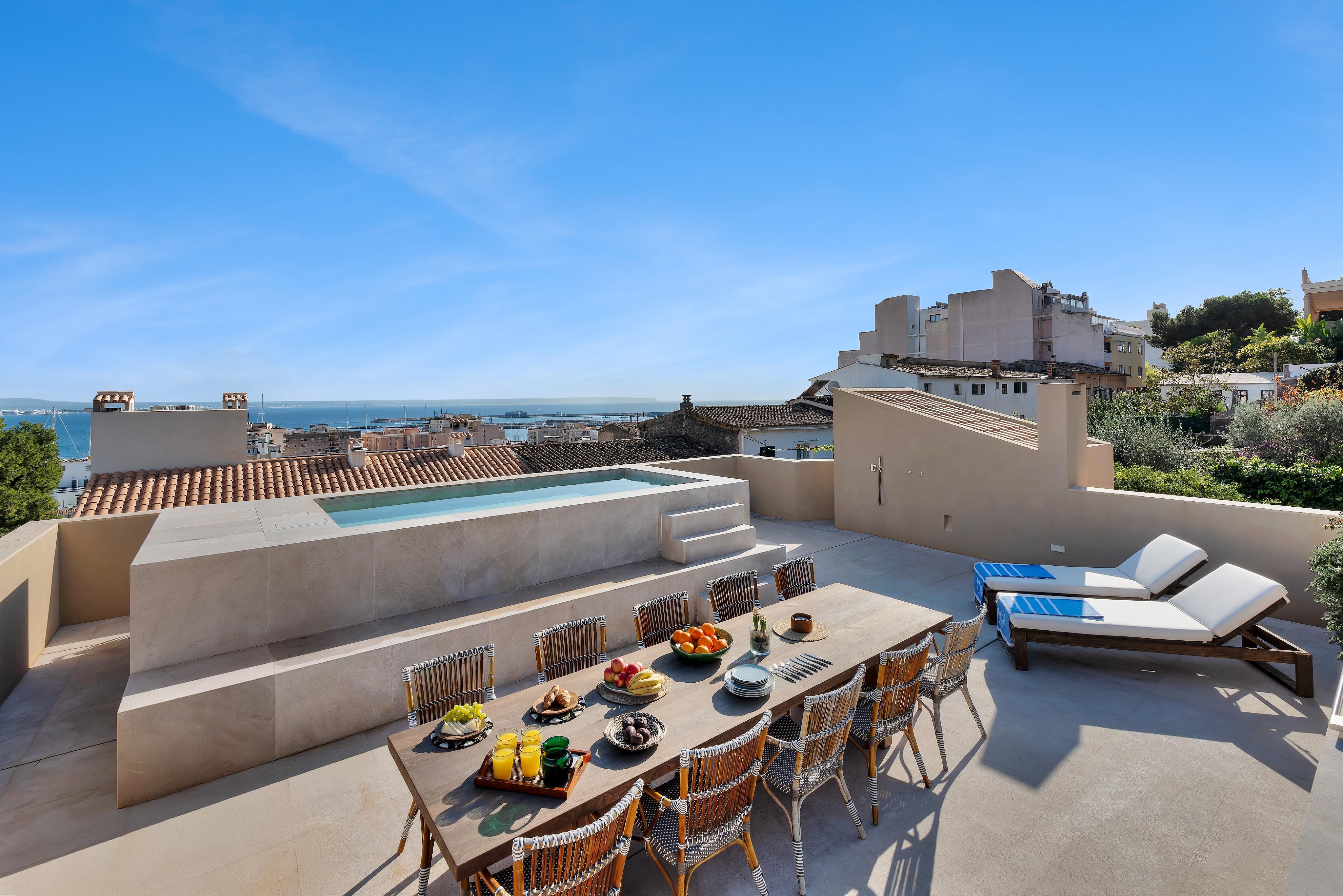 Oplev et luksuriøst liv i denne smukt renoverede villa i El Terreno, som på elegant vis kombinerer modernitet med kulturelle påvirkninger. Ejendommen har materialer af høj kvalitet og et gennemtænkt design, der gør den til et sandt mesterværk. Når du kommer ind, bliver du mødt af en rummelig gang, der inkluderer en af de to store swimmingpools og en overdækket terrasse til afslapning. Denne etage byder også på tre soveværelser, et elegant badeværelse, et ekstra gæstetoilet og den første af to stuer med opbevaringsplads både inde og ude. Villaens vinkælder tilføjer et elegant touch til denne luksuriøse oplevelse. På første sal finder man et gourmetkøkken, en anden stue, yderligere to soveværelser (inklusive et soveværelse med eget badeværelse) og en hyggelig terrasse med betagende udsigt. Tagterrassen er højdepunktet og byder på en vid udsigt over Palmas bylandskab, herunder katedralen, havet, bjergene og Bellver Park. Denne plads omfatter en anden pool, et udendørs køkken og ekstra opbevaring, hvilket gør det til et ideelt sted for sammenkomster eller afslapning. Villaen kombinerer luksus og komfort og har en garage til køretøjer samt gulvvarme og aircondition til komfort året rundt. Denne villa ligger på en af de bedste gader i El Terreno og er det perfekte valg for dem, der søger en sofistikeret og luksuriøs livsstil.