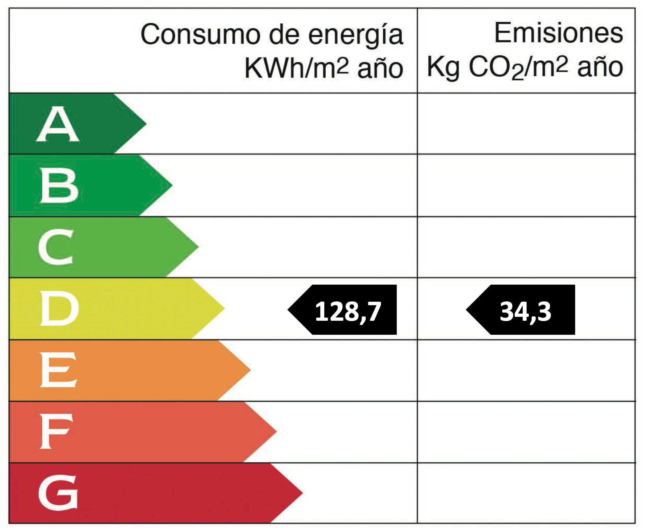• energiforbrugskoefficient: 128.7 kWh/(m2*a) • CO2-emission: 34.3 kg/m2 • CO2-emissionsklasse: D • Energieffektivitetsklasse: D