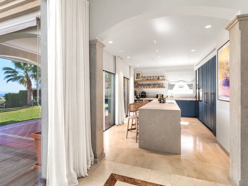 Selve villaen har et kontor, 4 soveværelser og 4 badeværelser samt et stort køkken og stue med udsigt over den smukke have og havet.